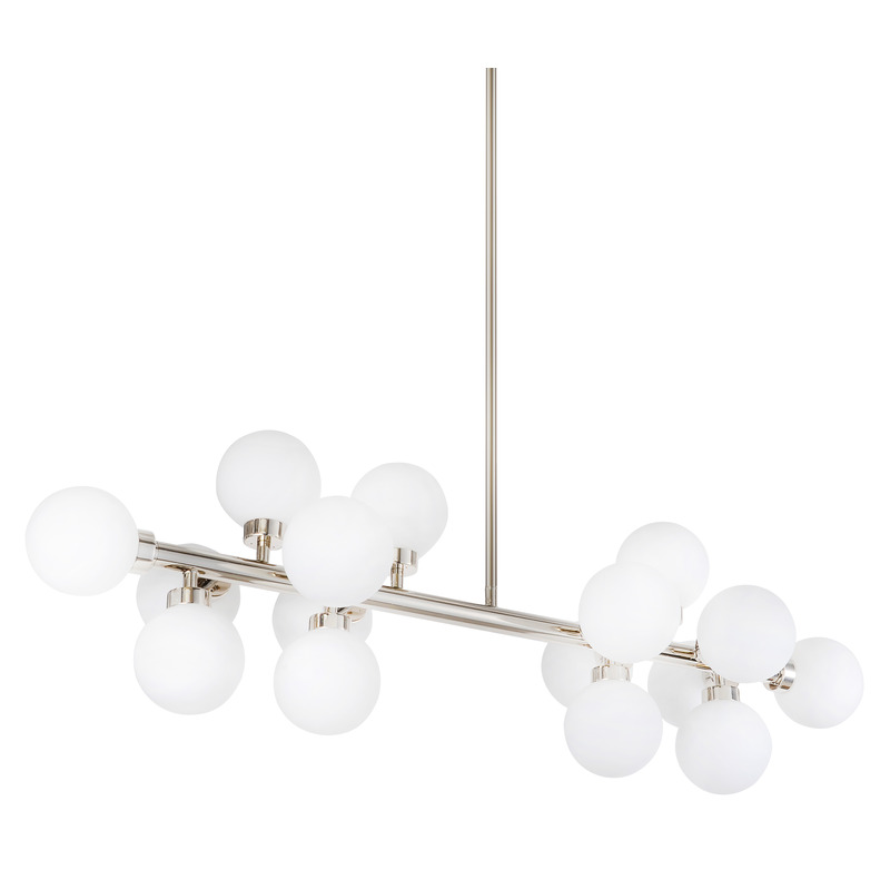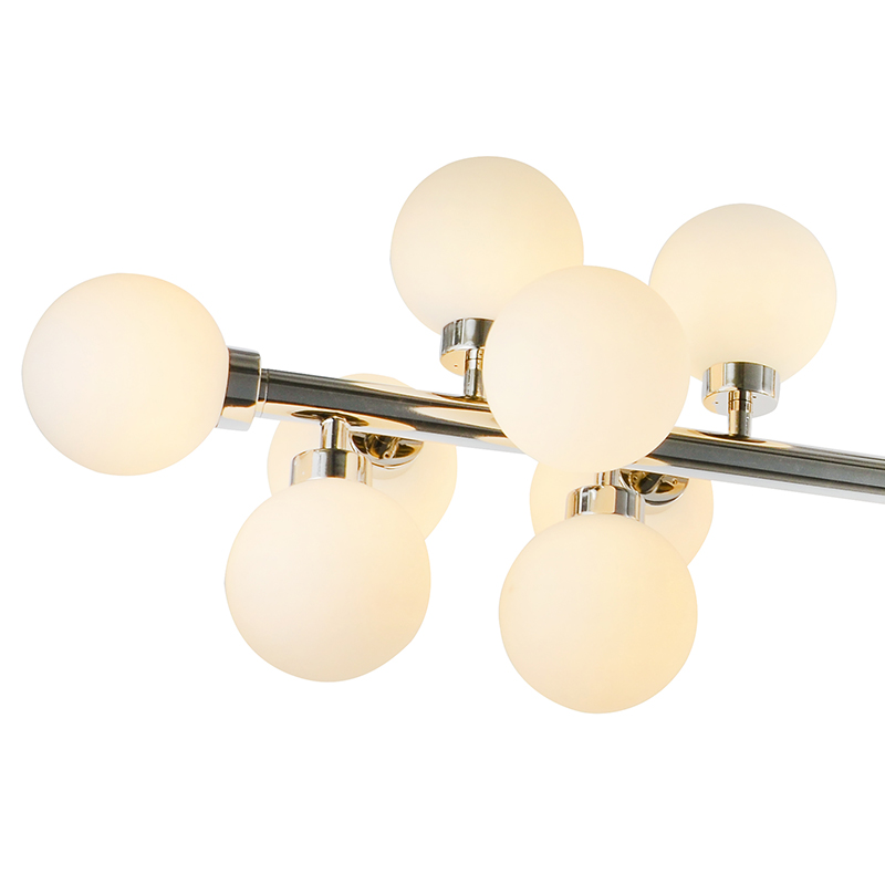A SHINY NICKEL METAL FRAME CHANDELIER WITH MILK WHITE GLASS SHADES