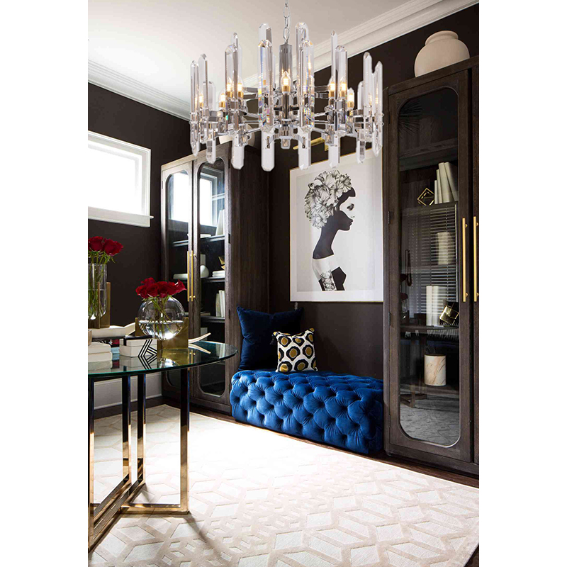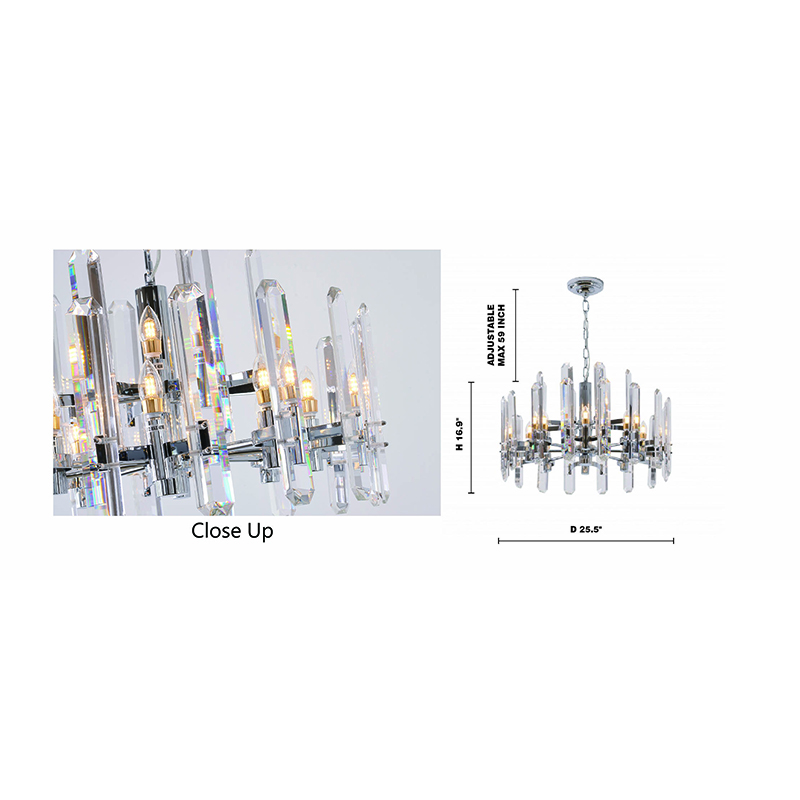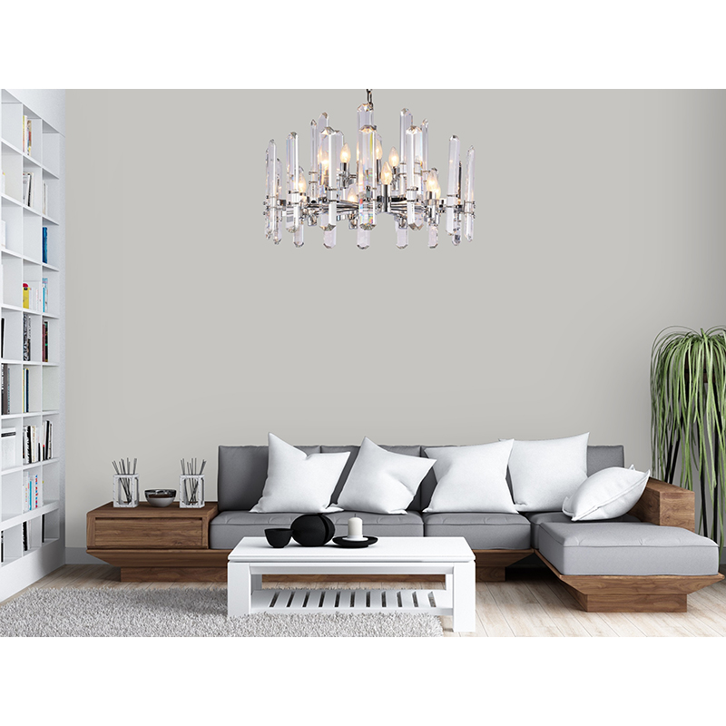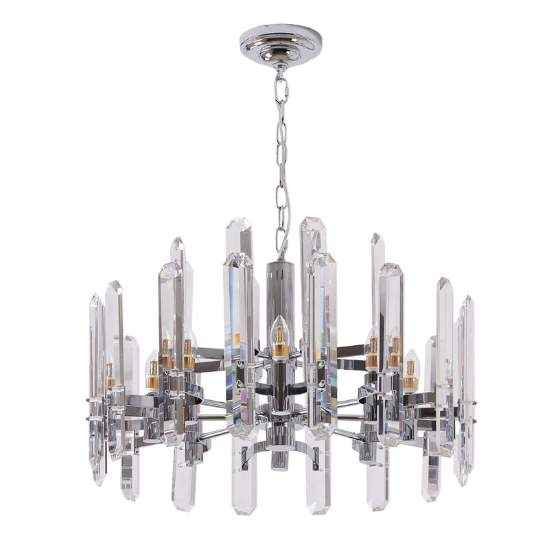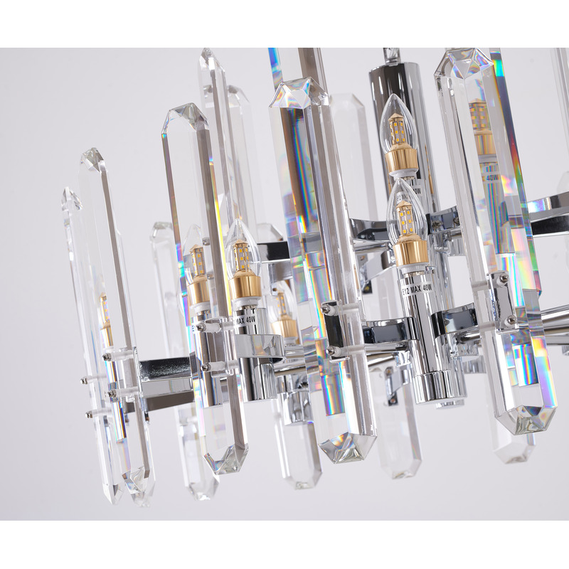 A CHROME FRAME CHANDELIER WITH CLEAR CRYSTAL PLAQUES