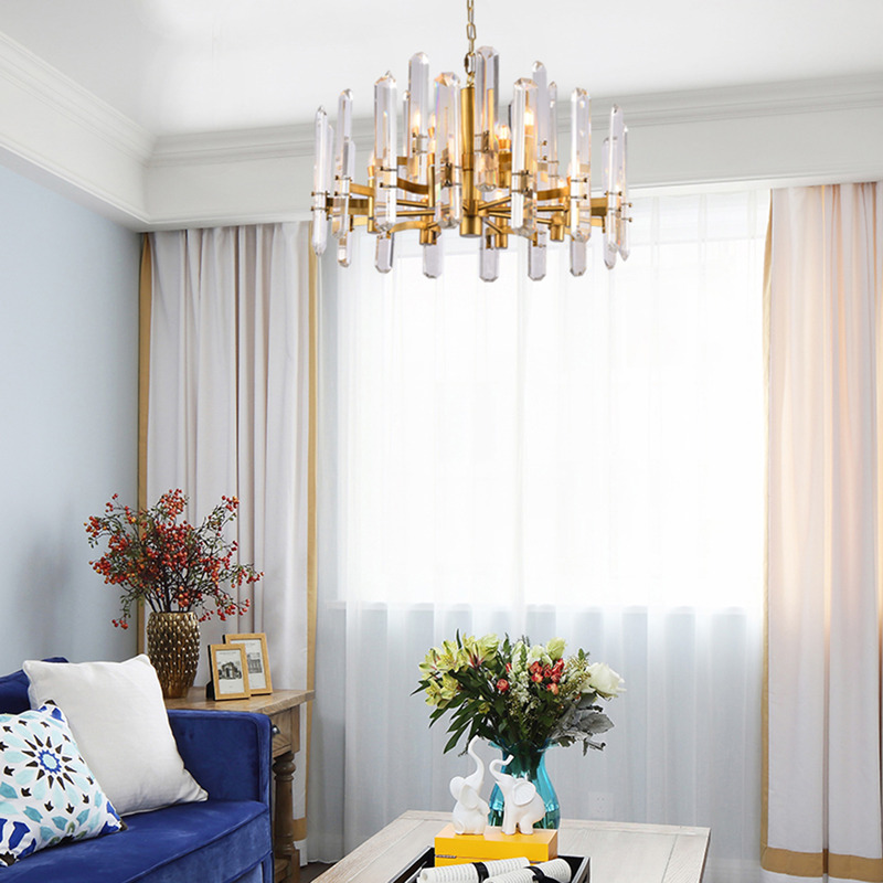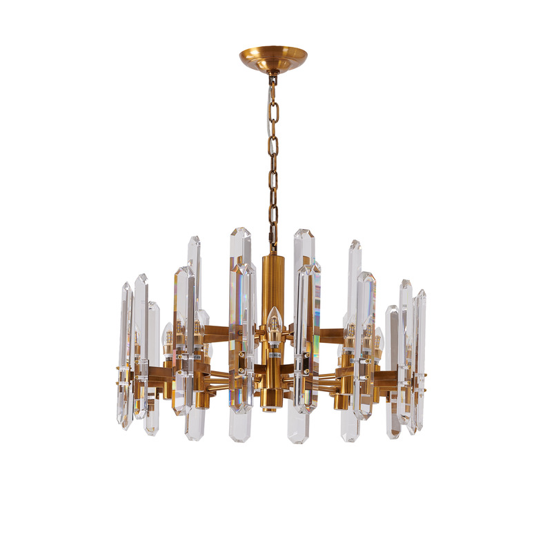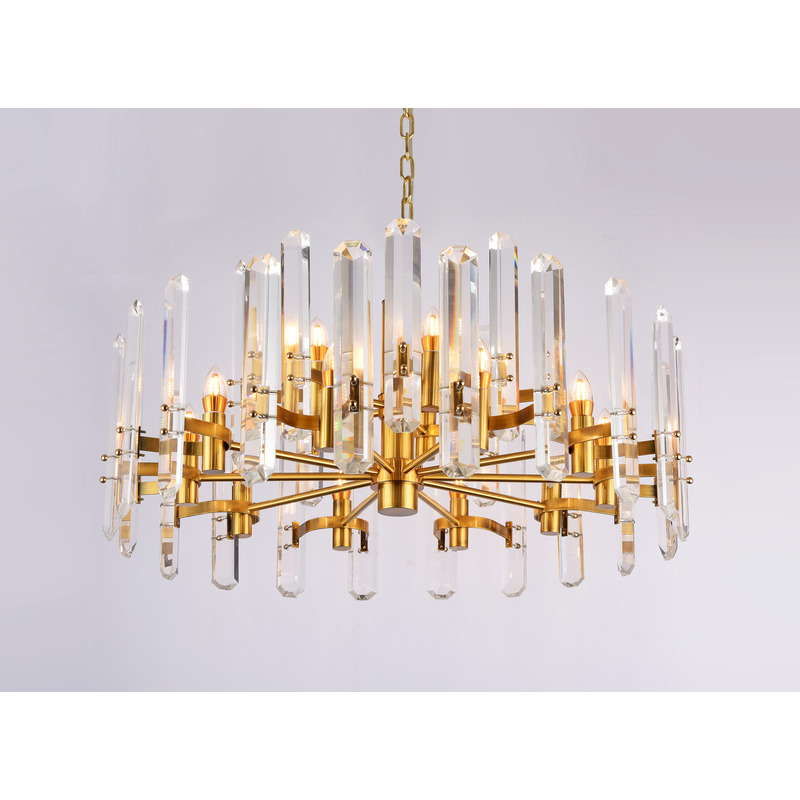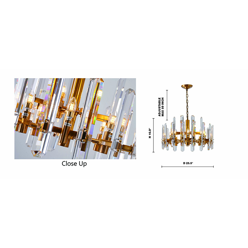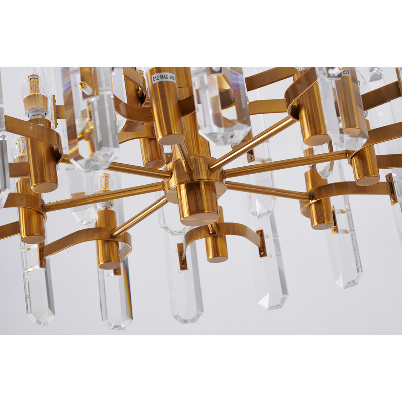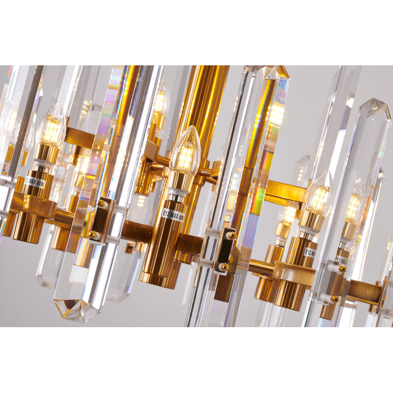 A TWO TIER GOLD FRAME CHANDELIER WITH CLEAR CRYSTAL PLAQUES