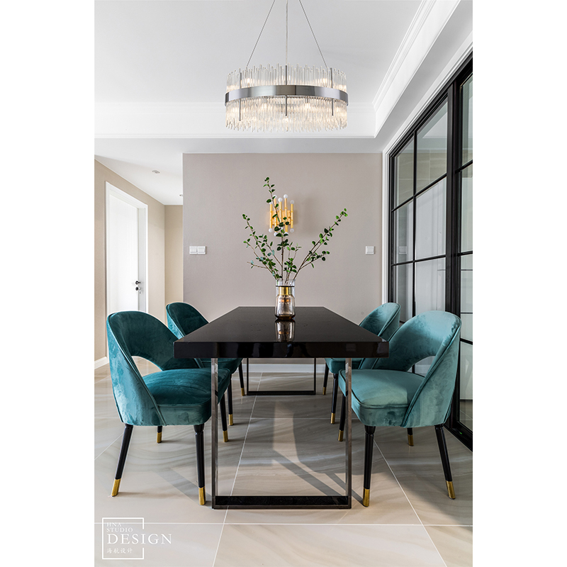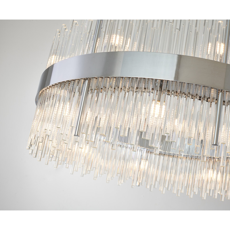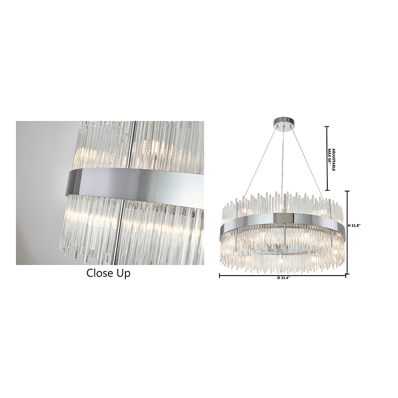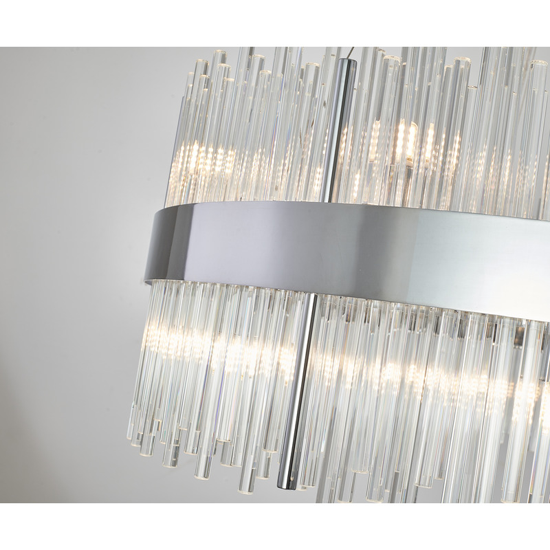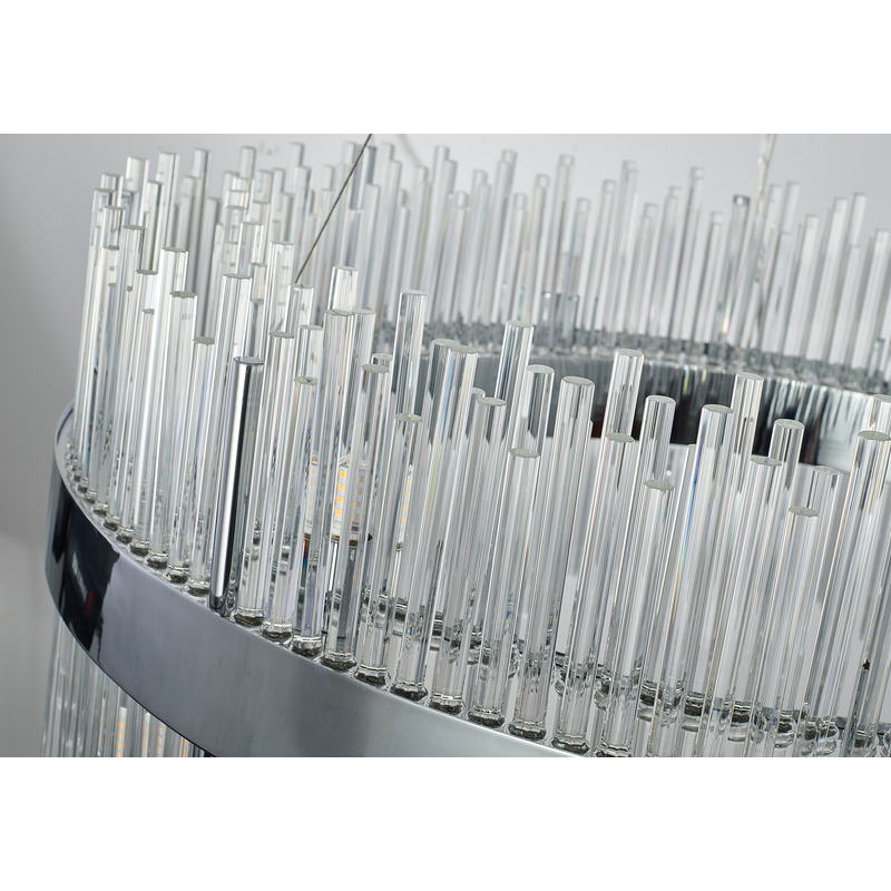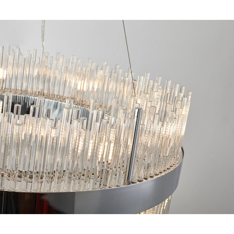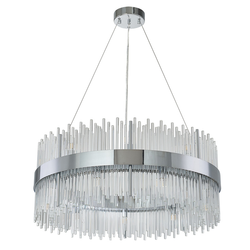 A ROUND CHROME STAINLESS STEEL FRAME CHANDELIER WITH CLEAR GLASS RODS