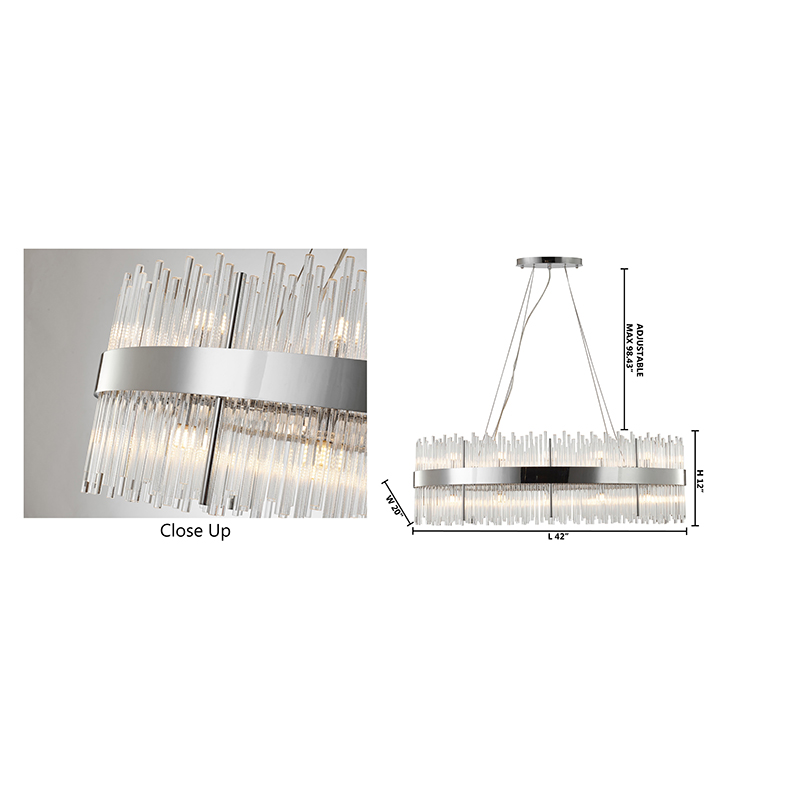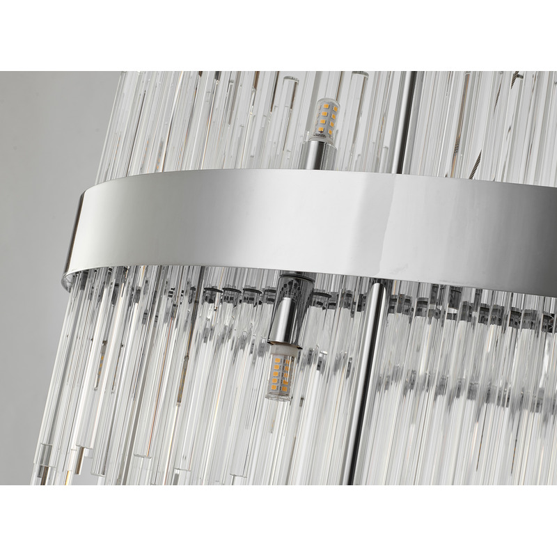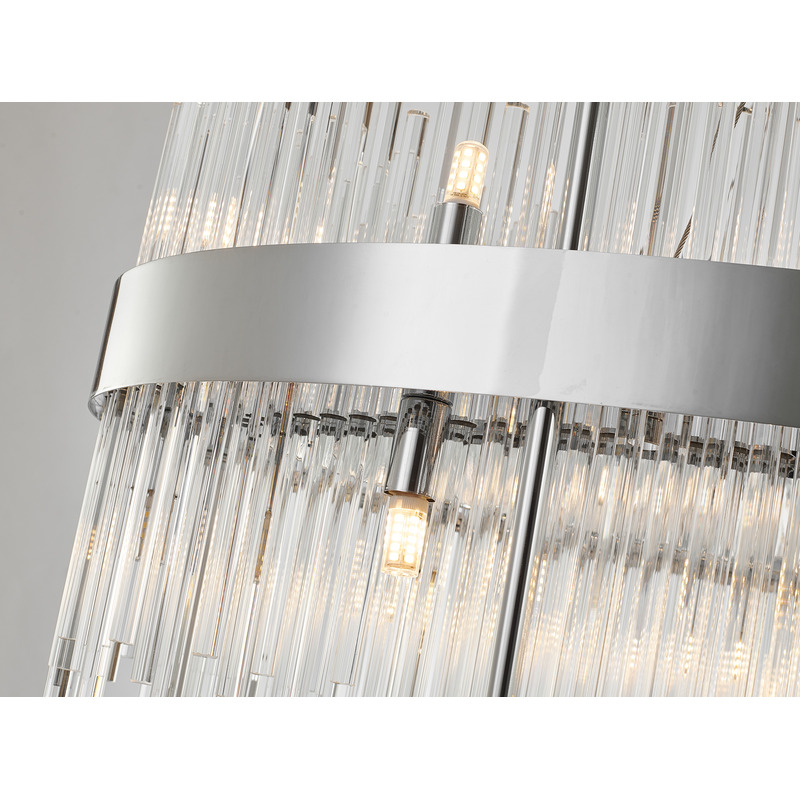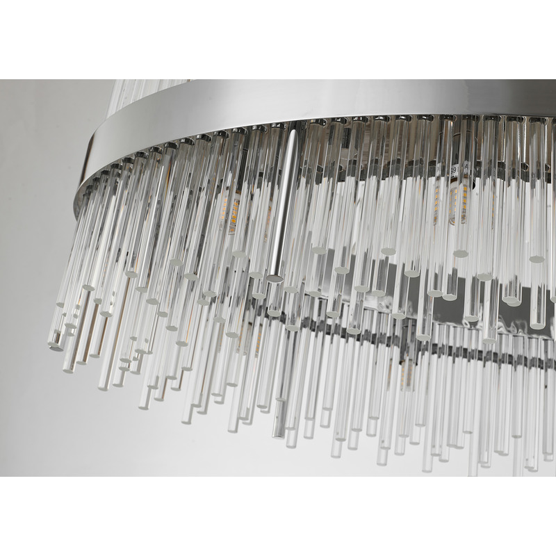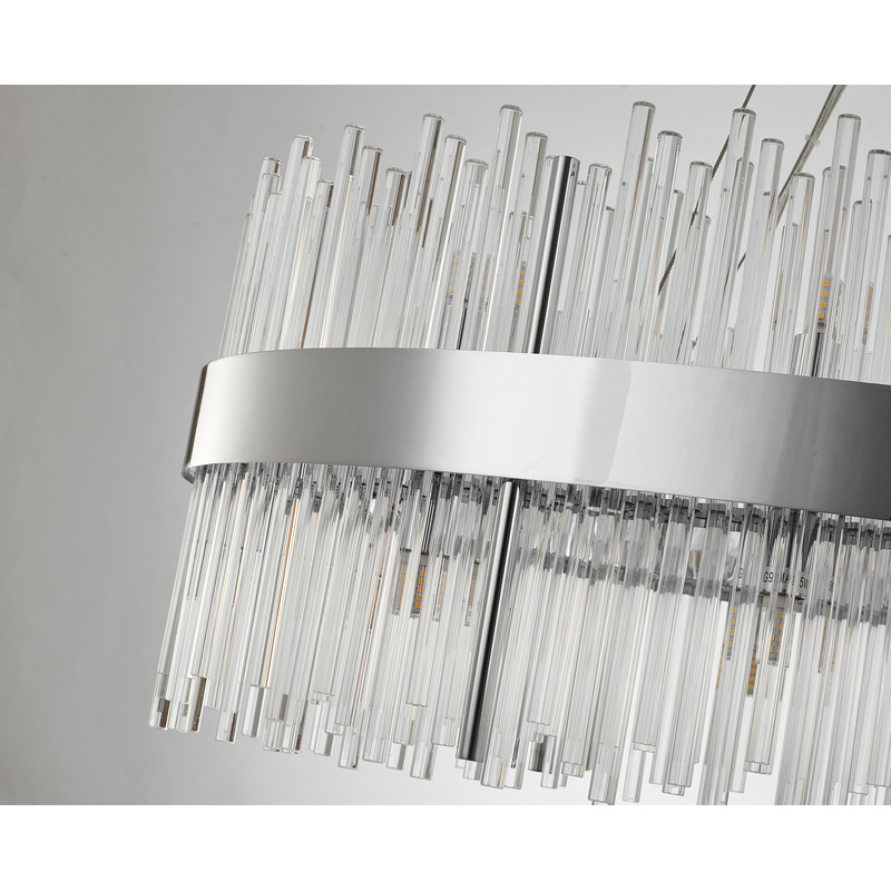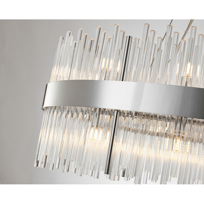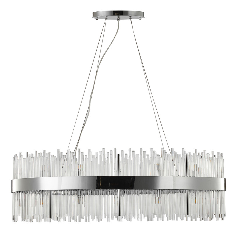 A CHROME OVAL STAINLESS STEEL FRAME CHANDELIER WITH CLEAR GLASS RODS