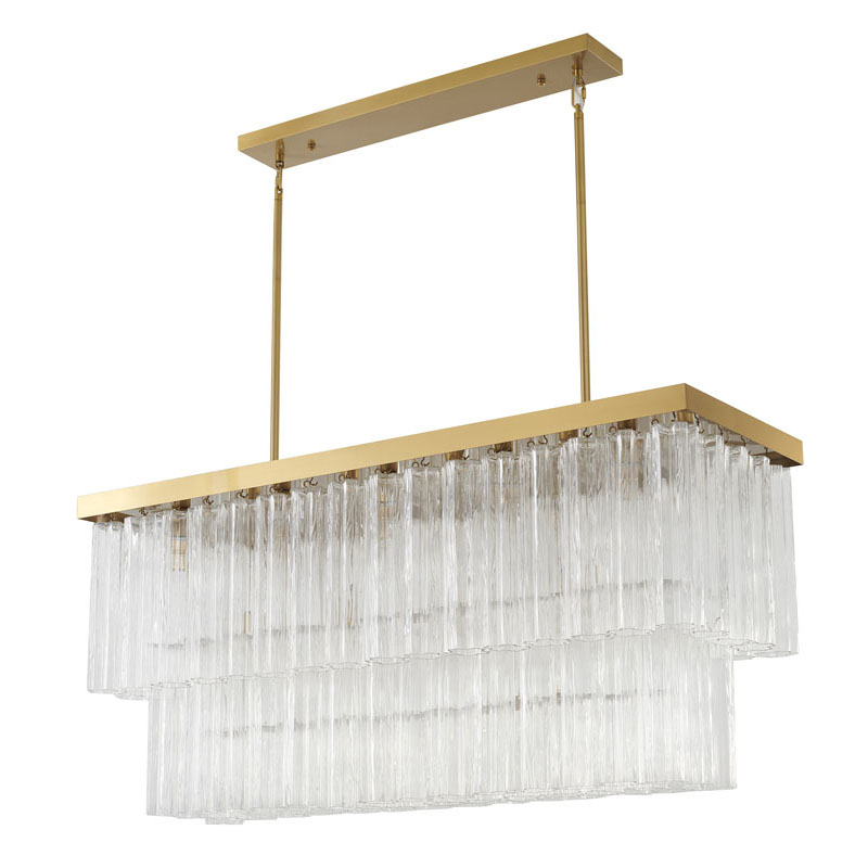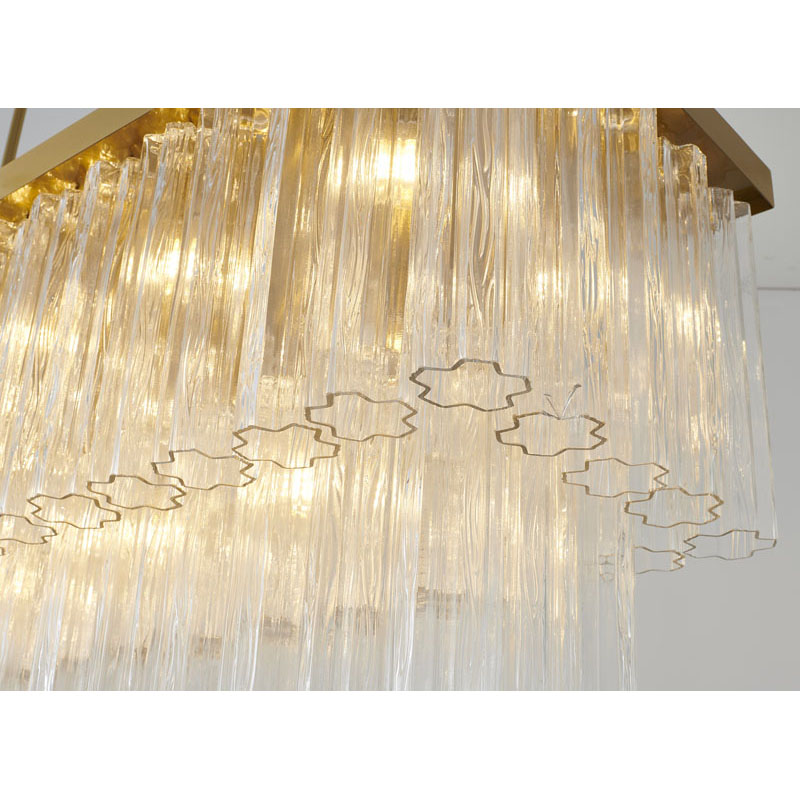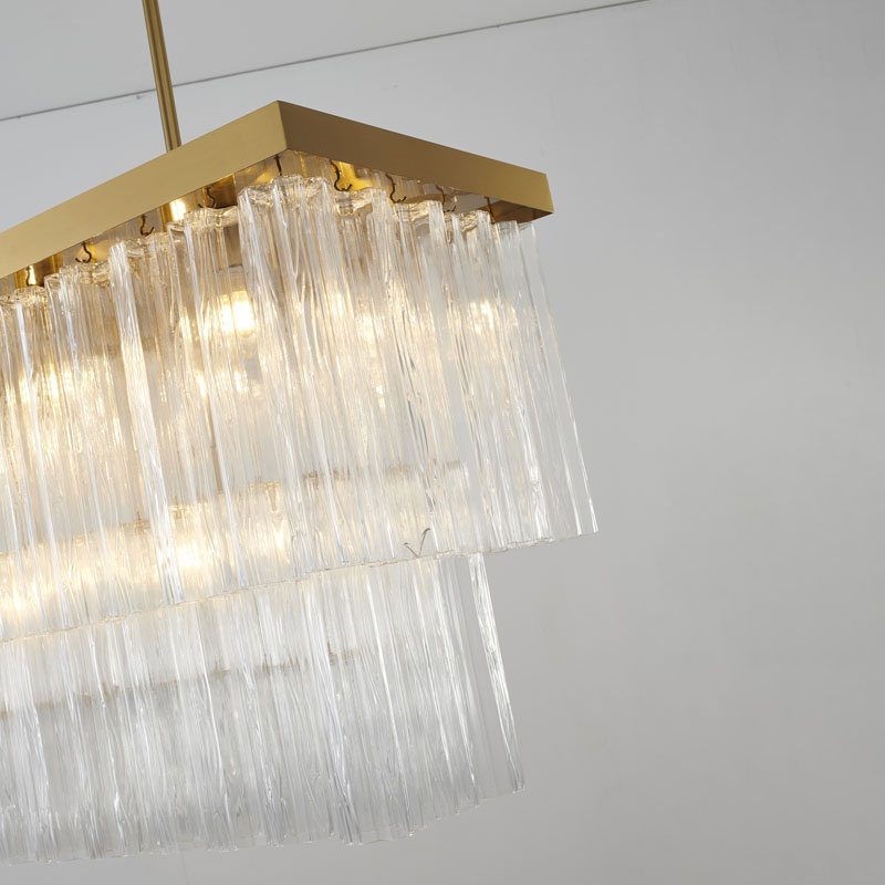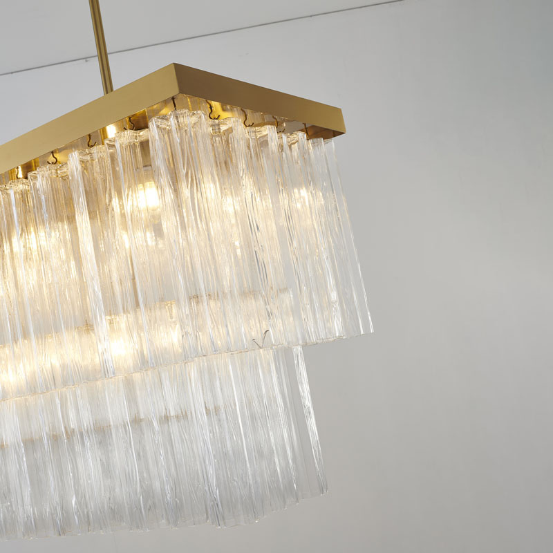 A SATIN BRASS RECTANGULAR FRAME CHANDELIER WITH CLEAR HANGING RIBBED GLASS
