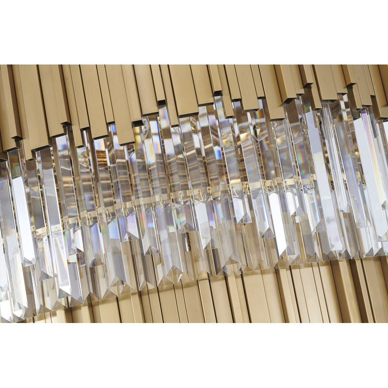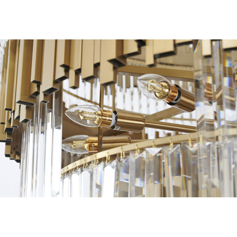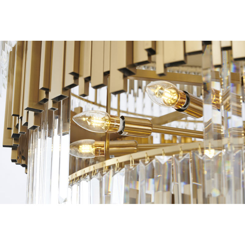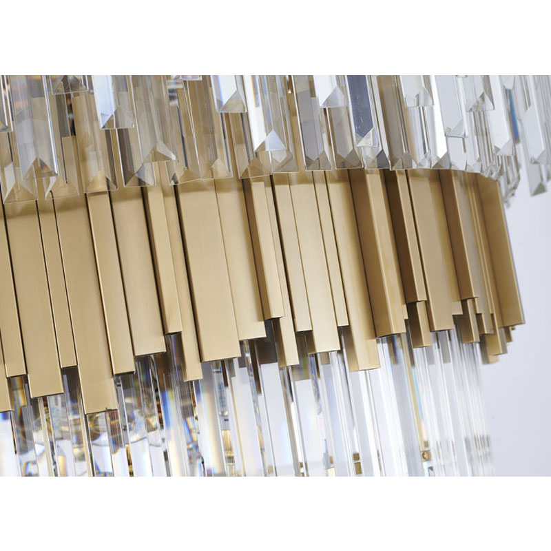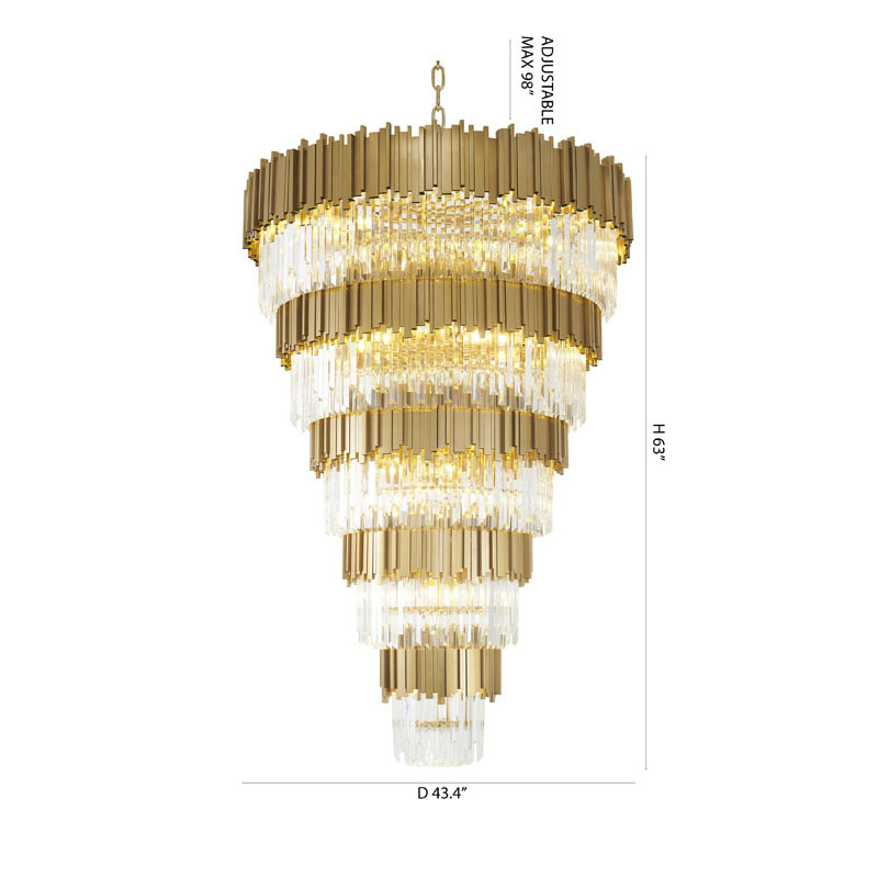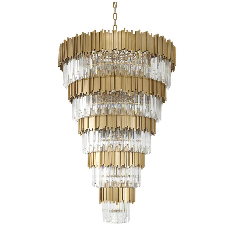 A FIVE TIER BRUSHED BRASS FRAME CHANDELIER WITH CLEAR HANGING CRYSTALS