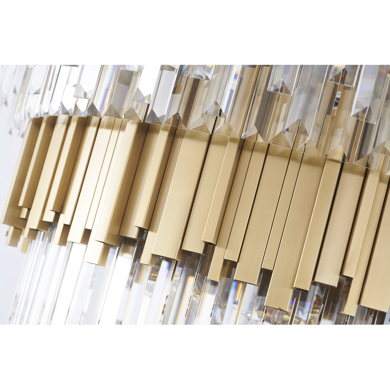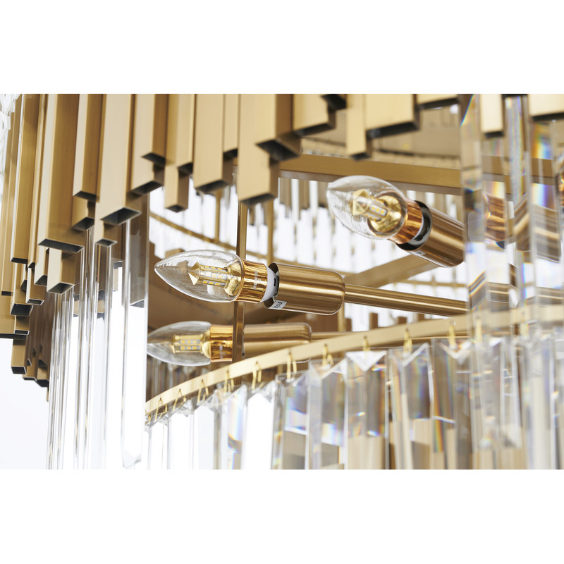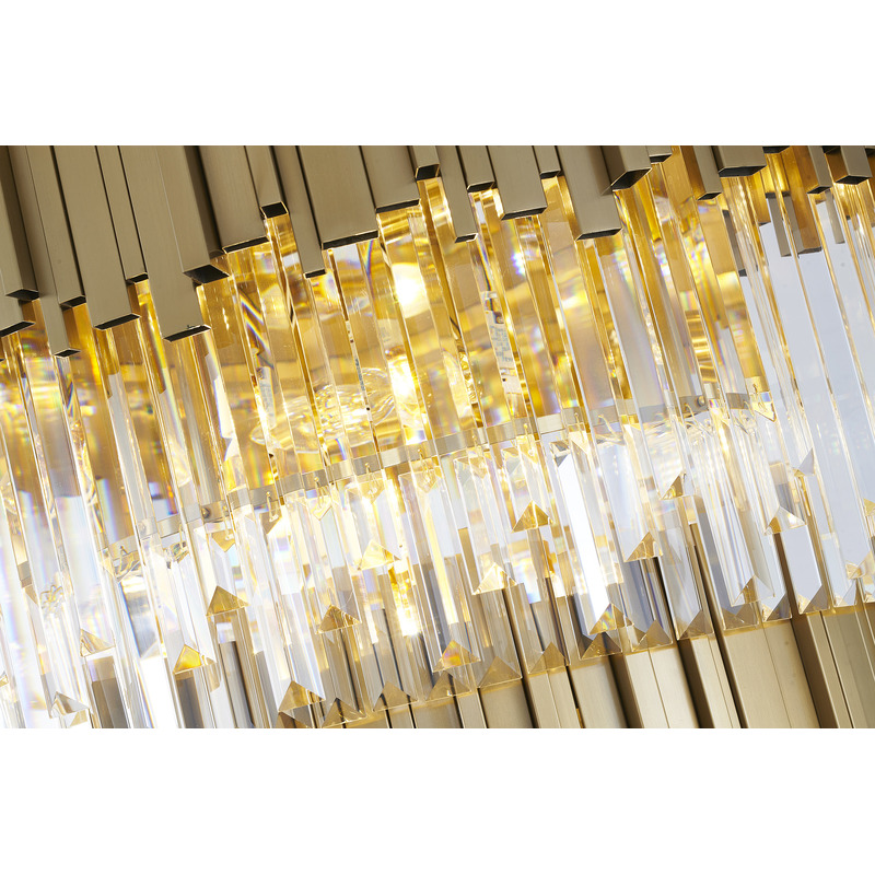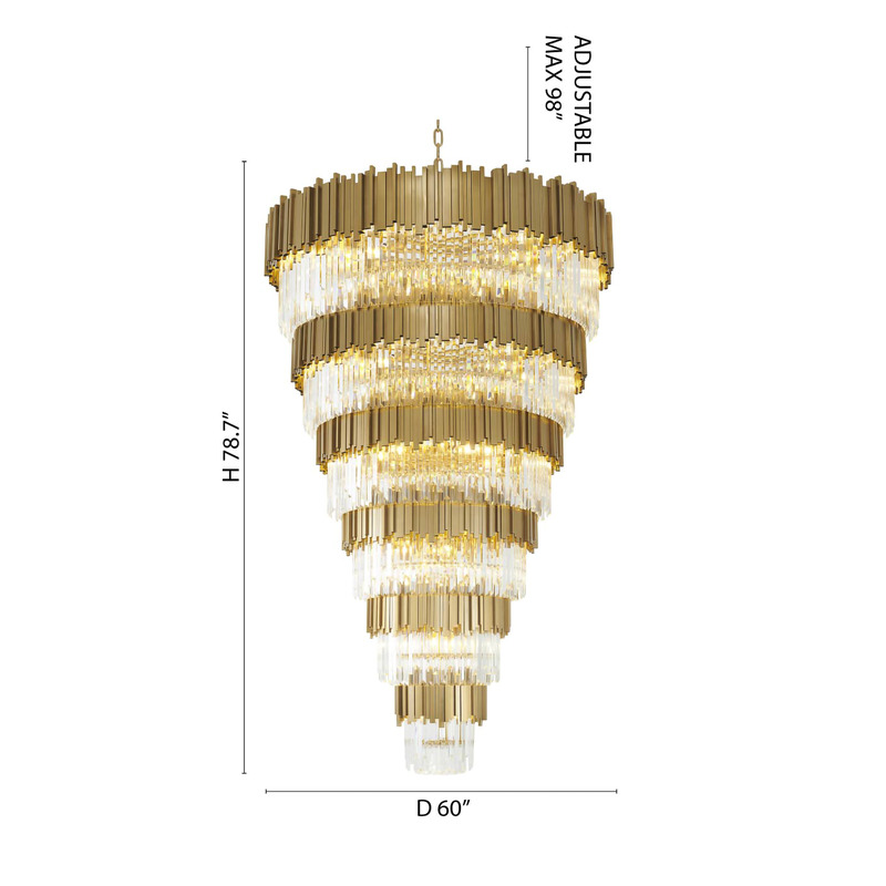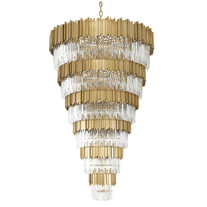 A SIX TIER BRUSHED BRASS FRAME CHANDELIER WITH CLEAR HANGING CRYSTALS