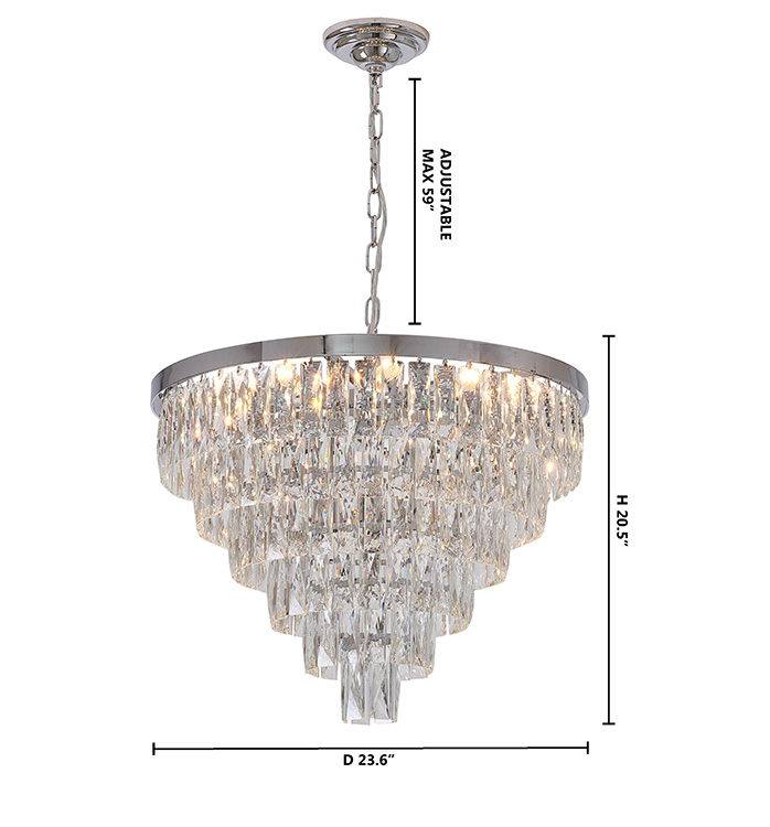 A SIX TIER CHROME METAL FRAME CHANDELIER WITH CLEAR HANGING CRYSTALS