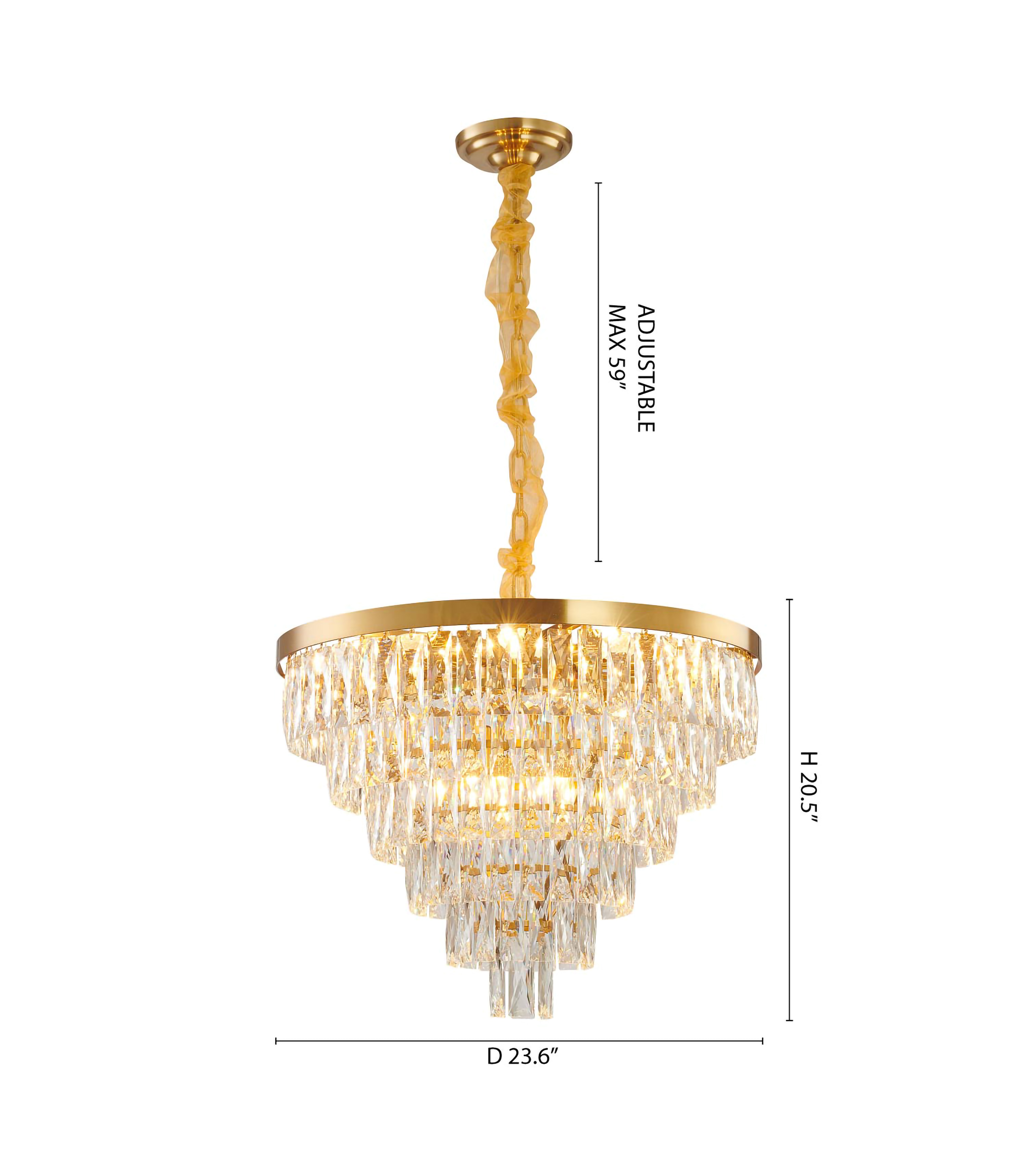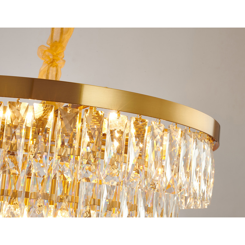 A ROUND GOLD METAL FRAME CHANDELIER WITH SIX TIERS OF CLEAR HANGING CRYSTALS