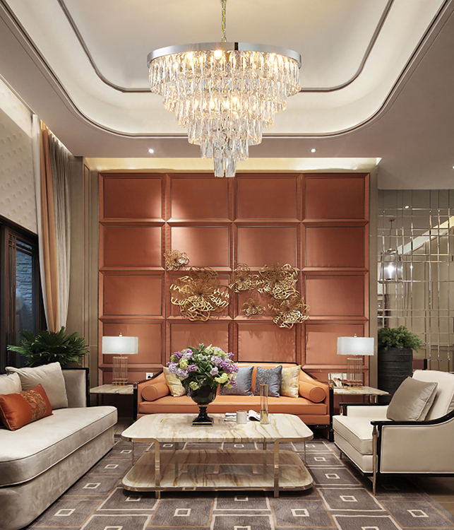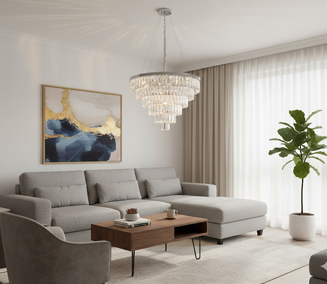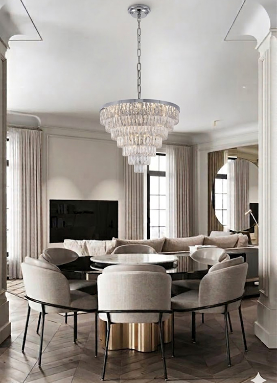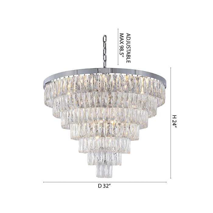 A CHROME SEVEN TIER CHANDELIER WITH CLEAR HANGING CRYSTALS