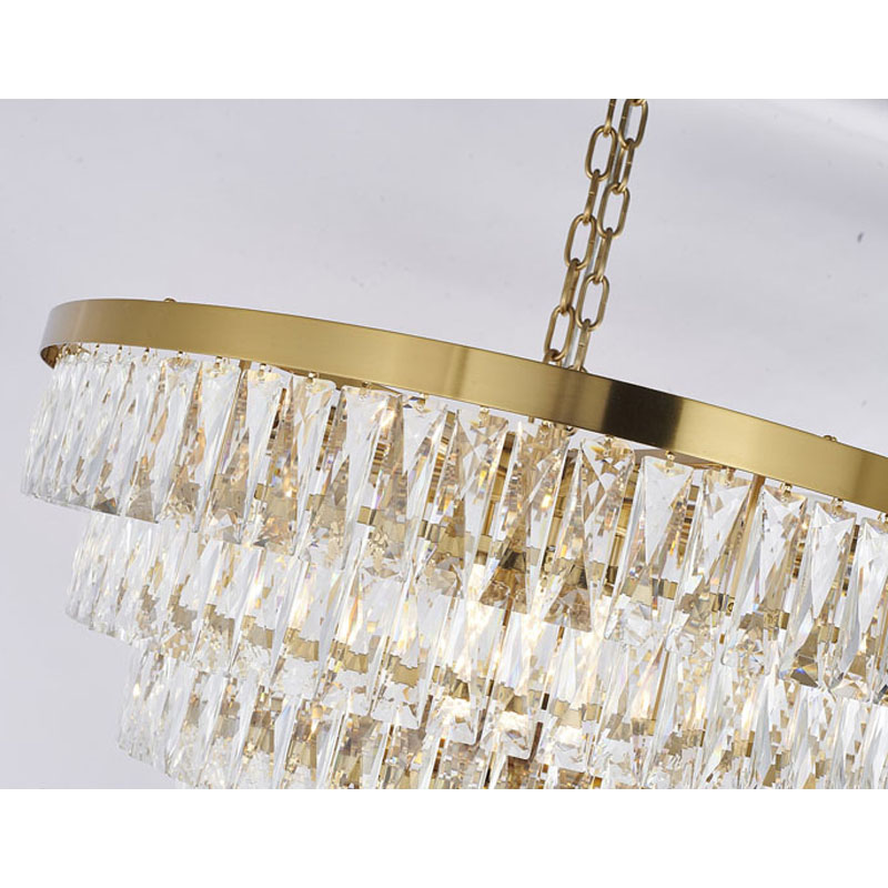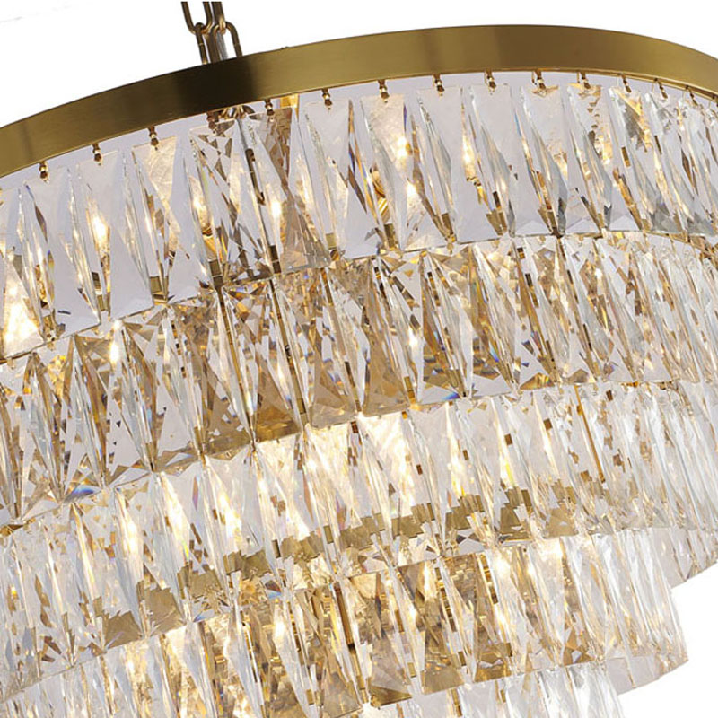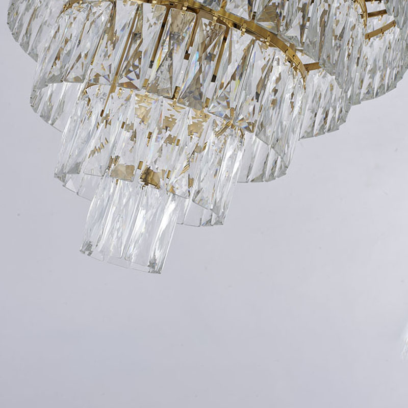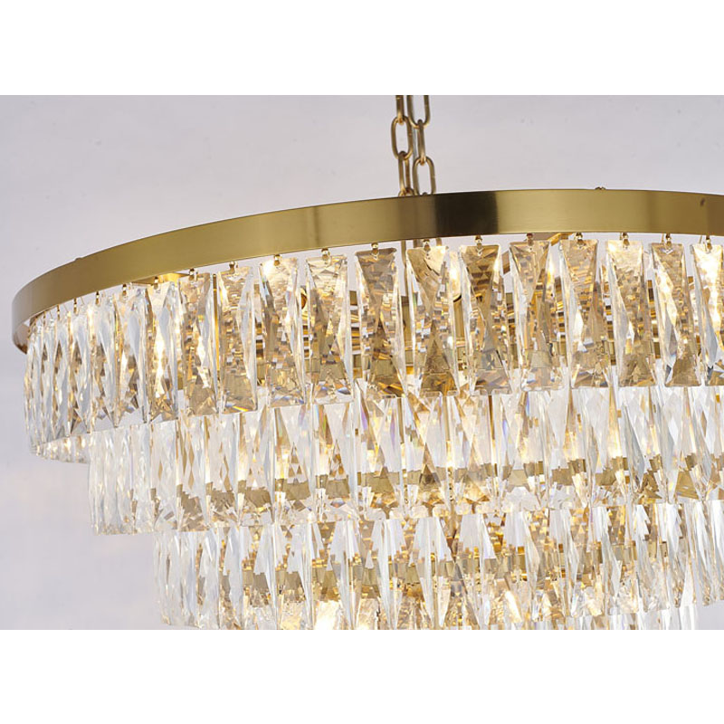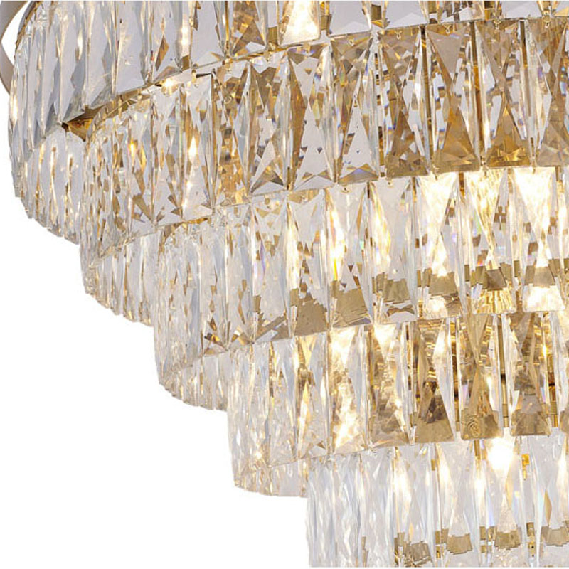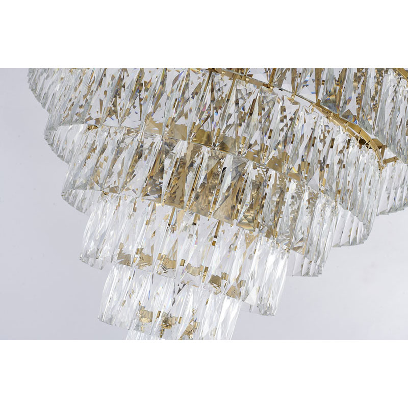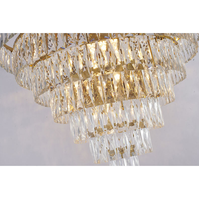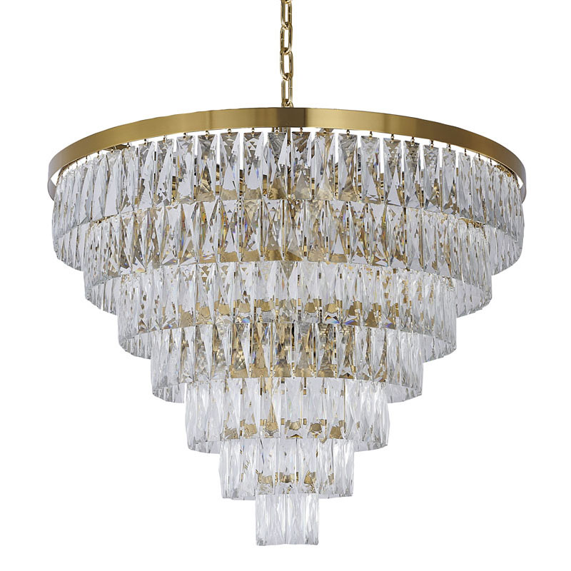 A GOLD SEVEN TIER CHANDELIER WITH CLEAR HANGING CRYSTALS