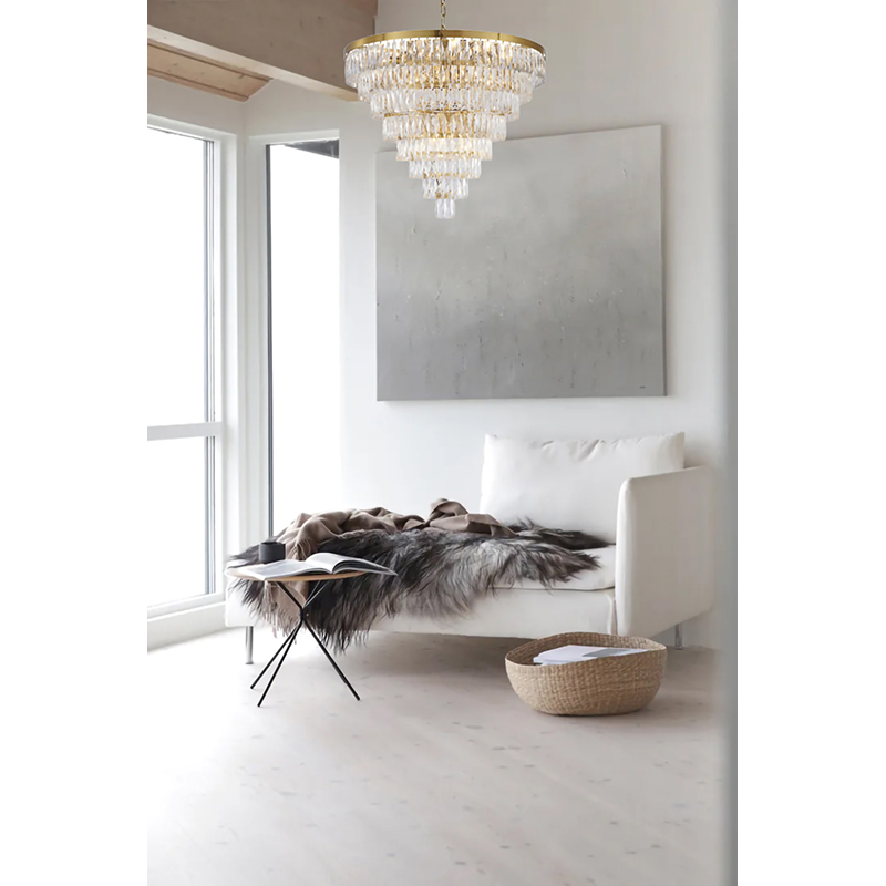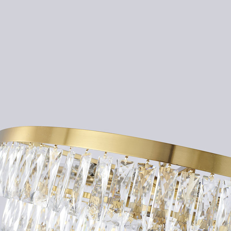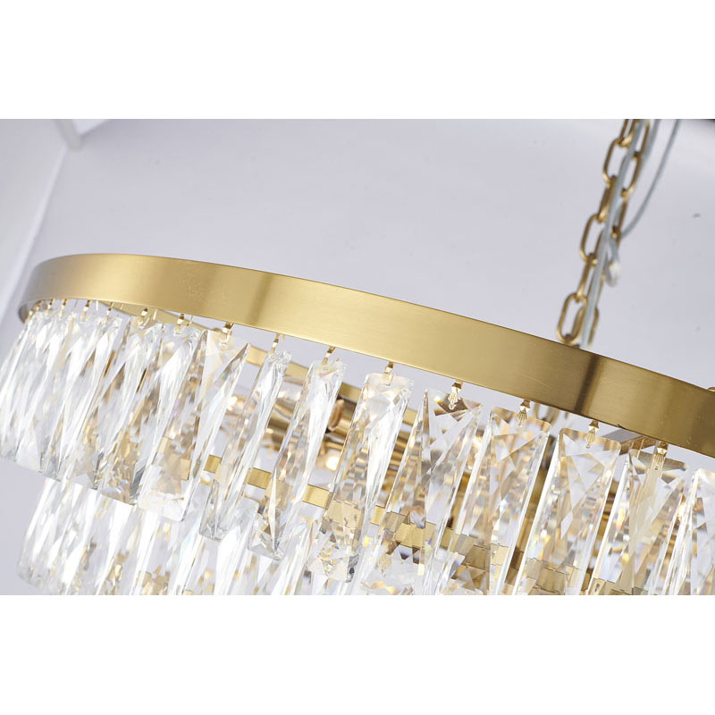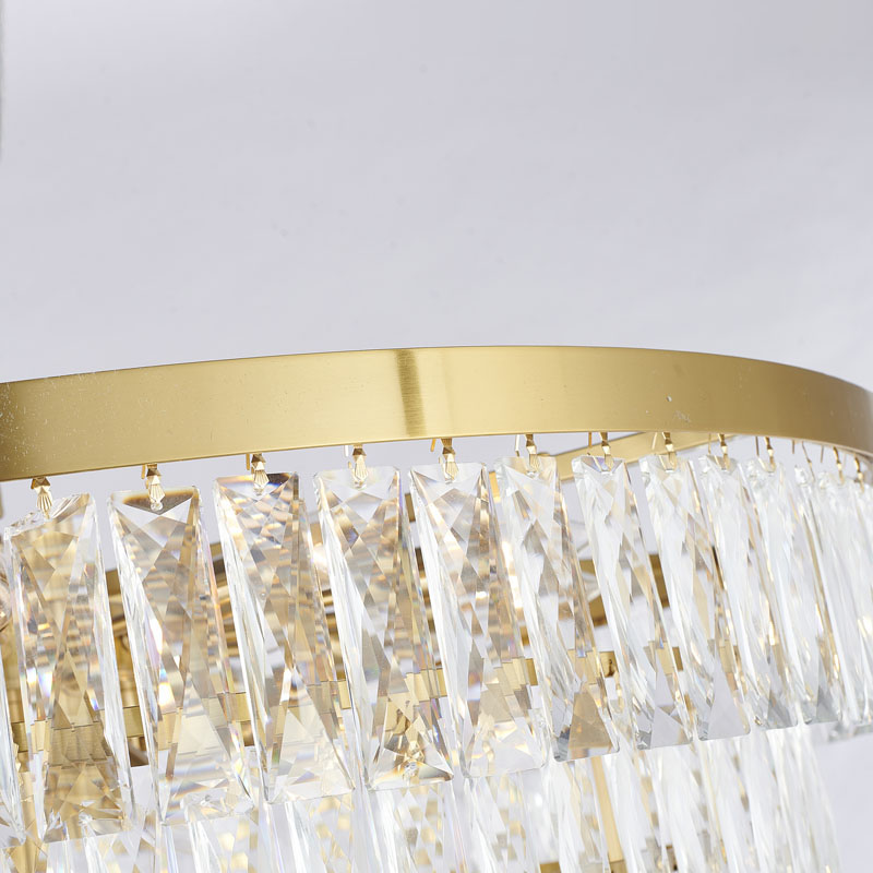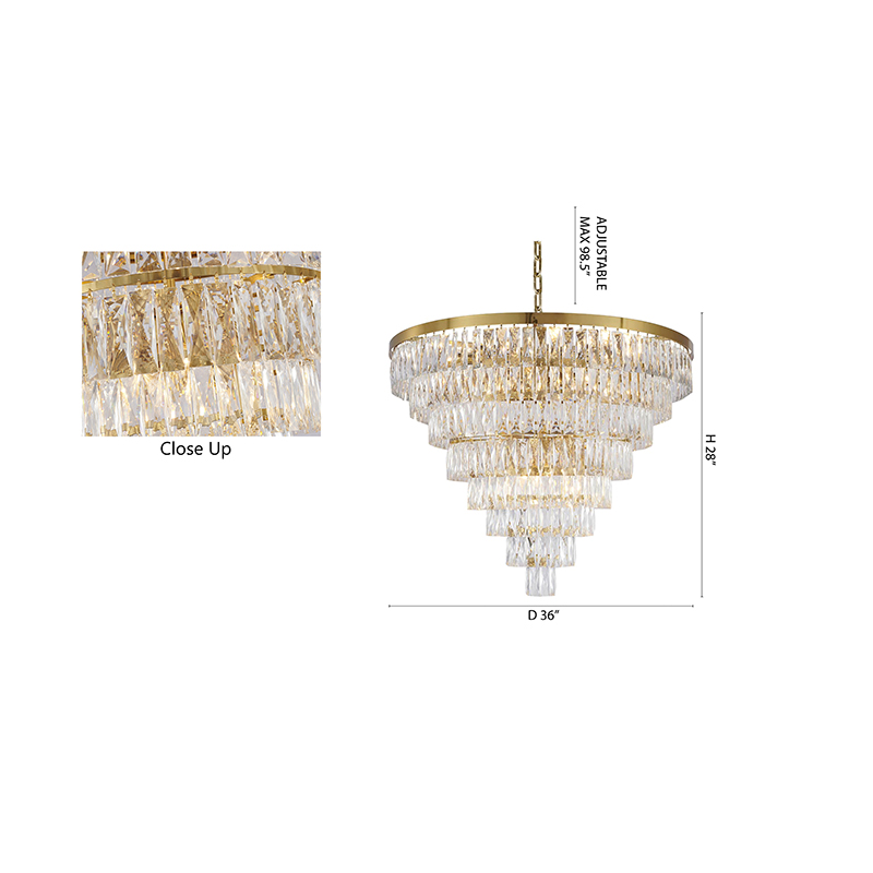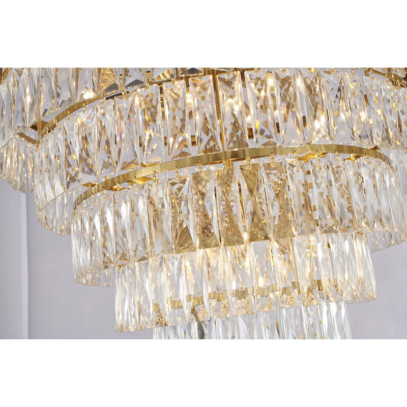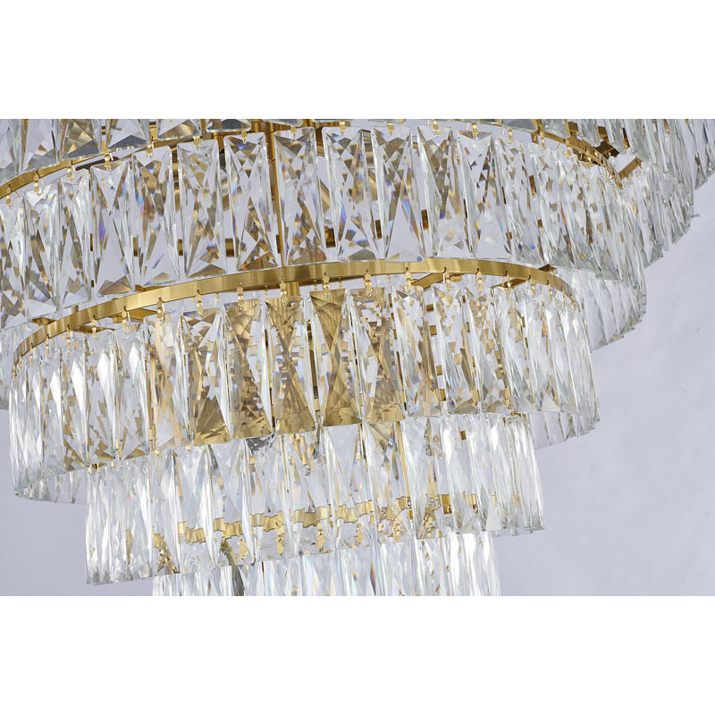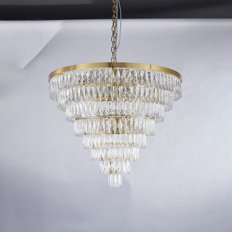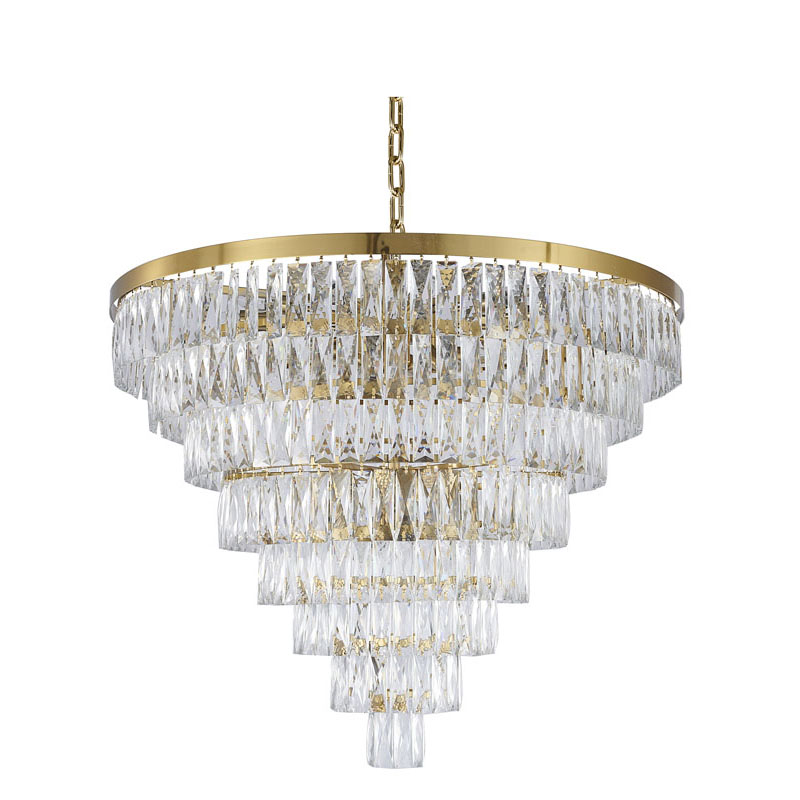 A GOLD EIGHT TIER CHANDELIER WITH CLEAR HANGING CRYSTALS