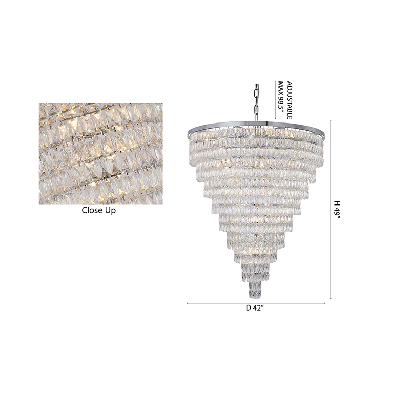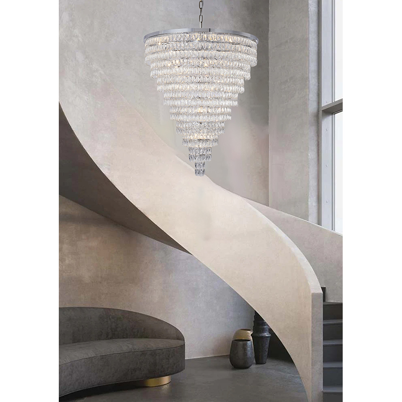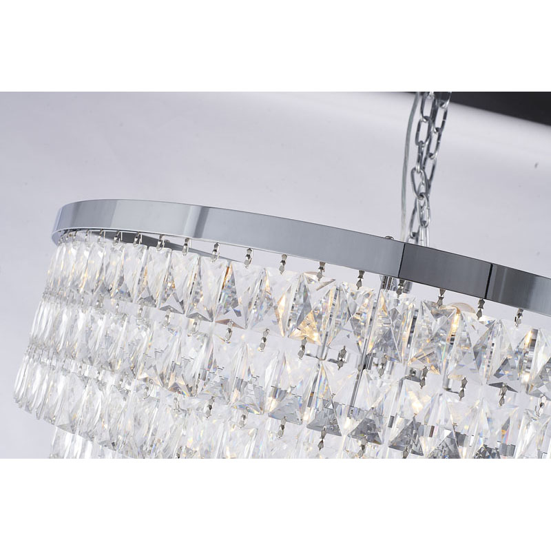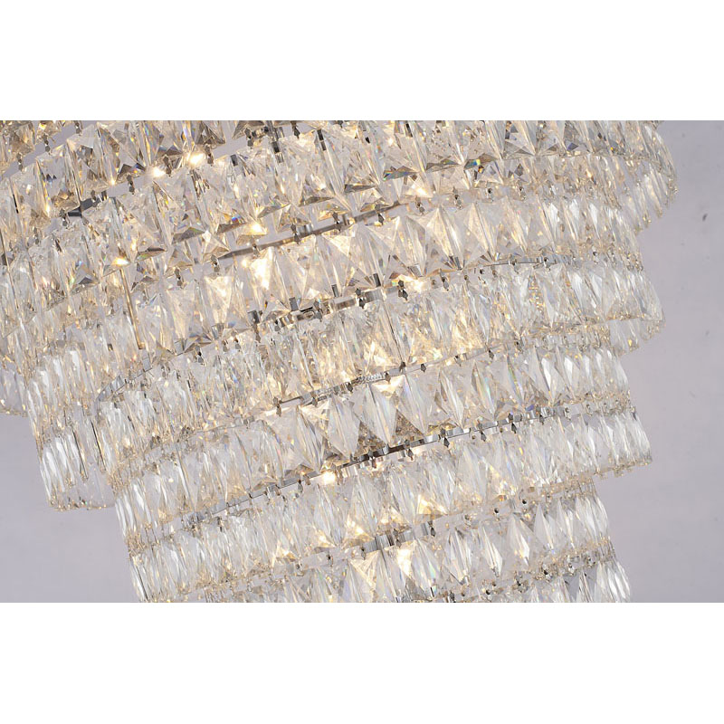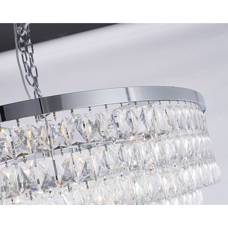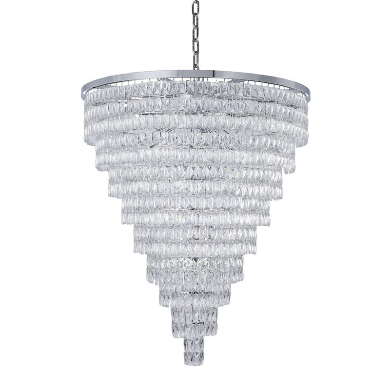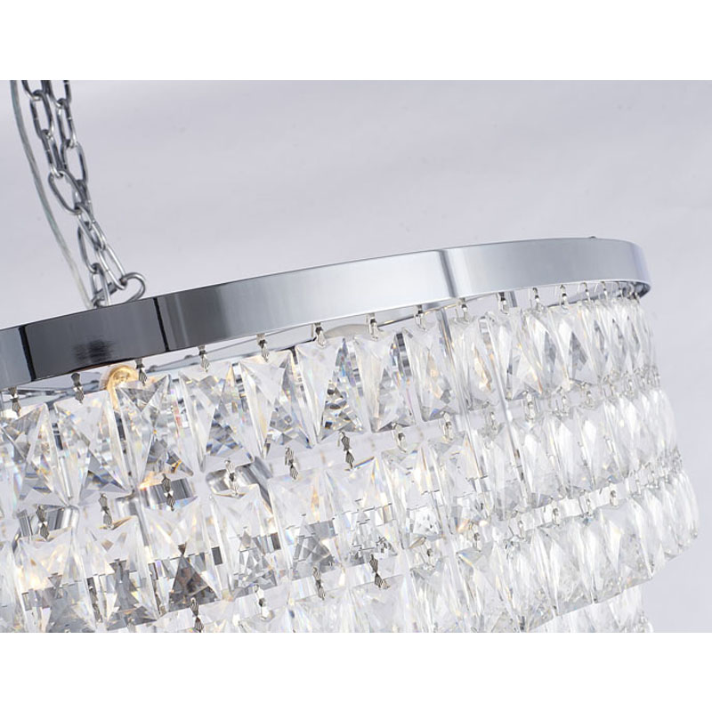 A CHROME NINE TIER CHANDELIER WITH CLEAR HANGING CRYSTALS
