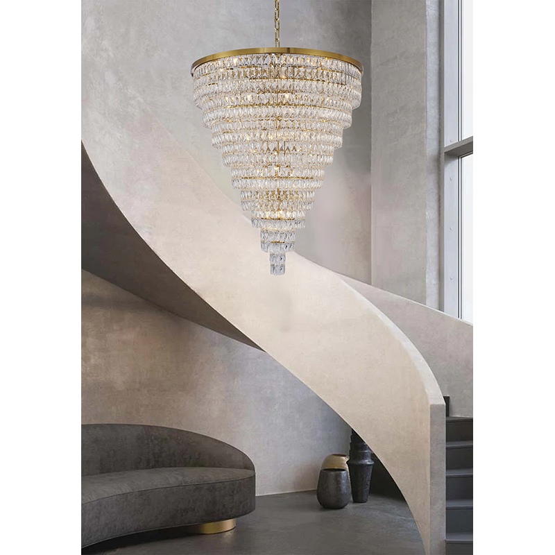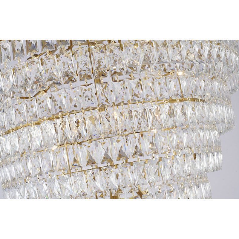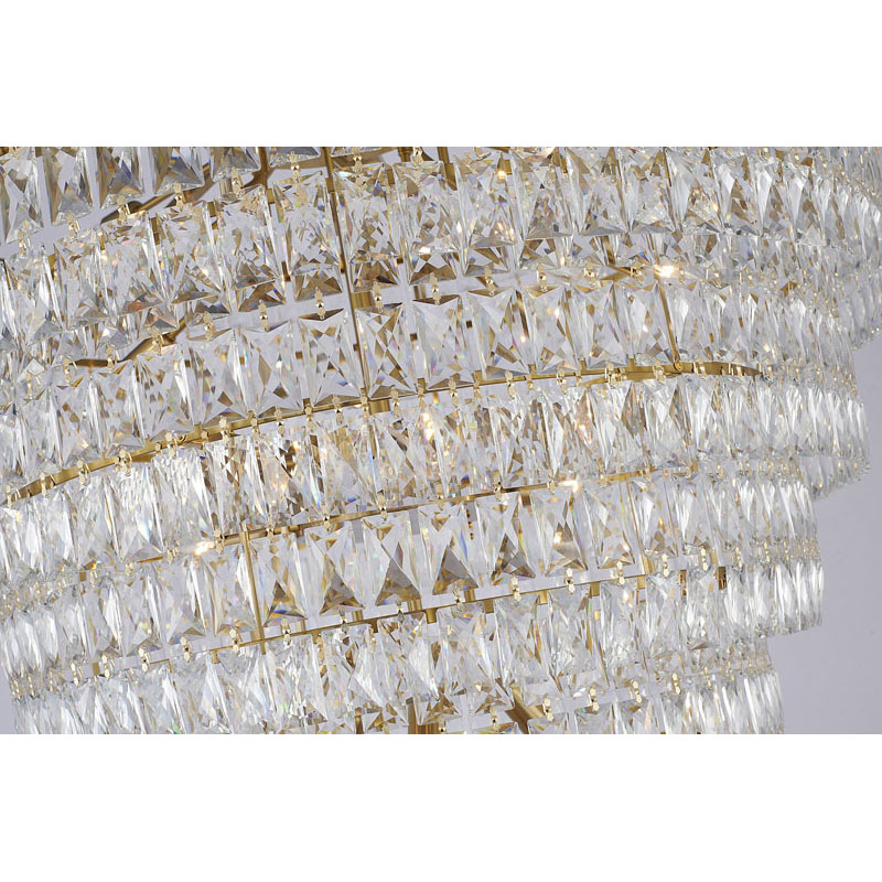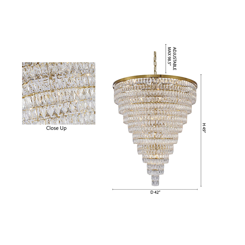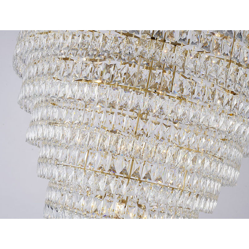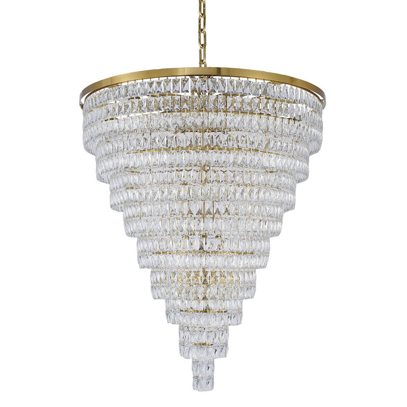 A GOLD NINE TIER CHANDELIER WITH CLEAR HANGING CRYSTALS