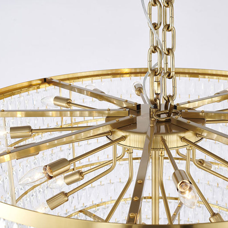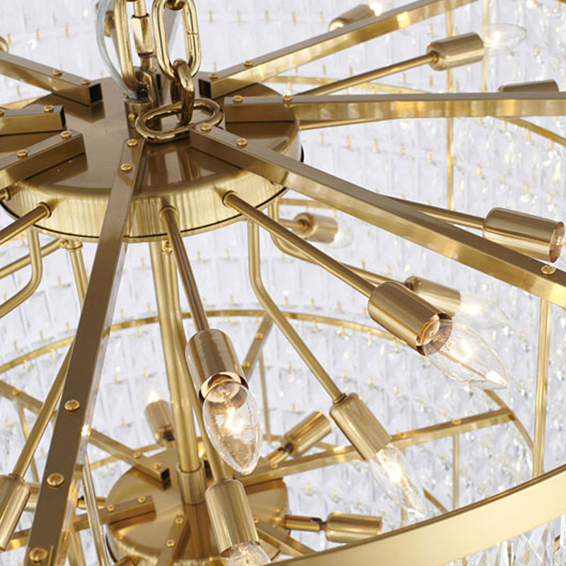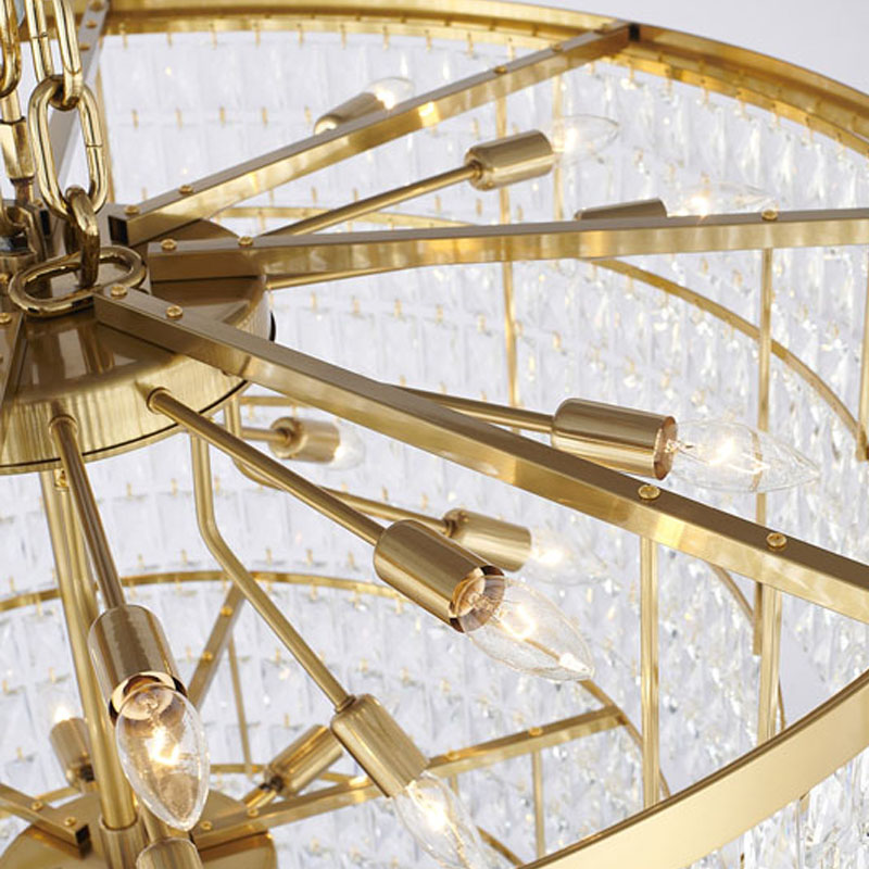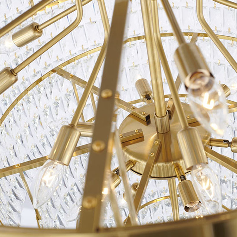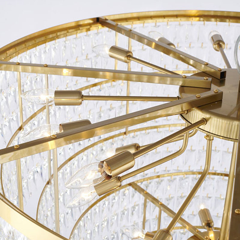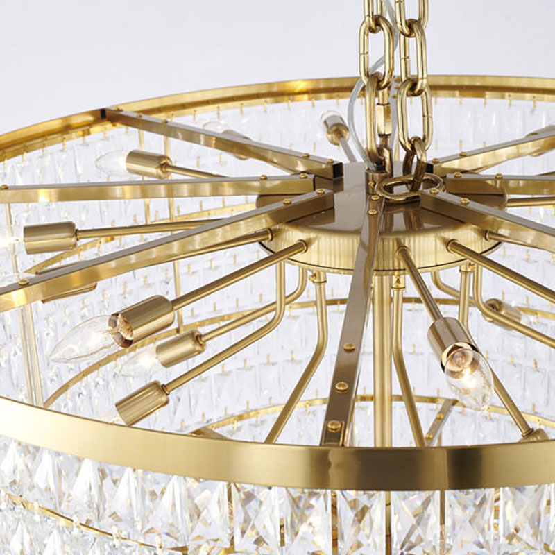 A GOLD NINE TIER CHANDELIER WITH CLEAR HANGING CRYSTALS