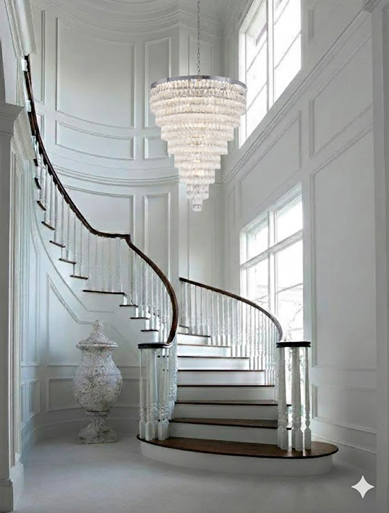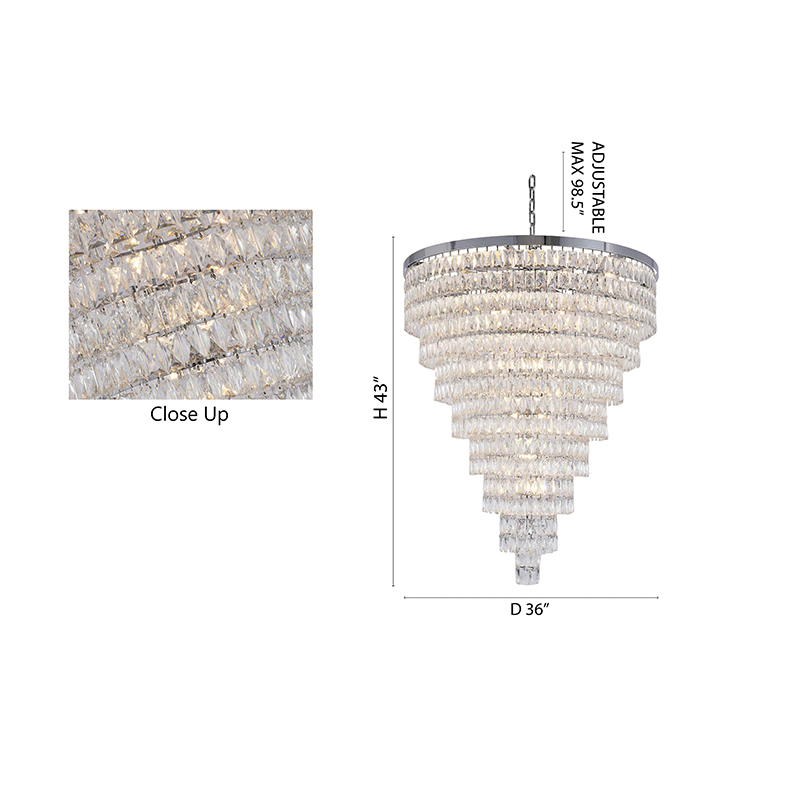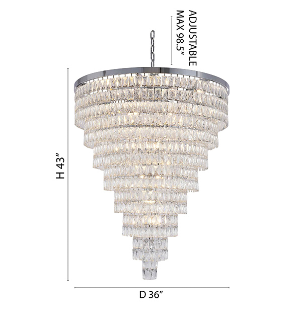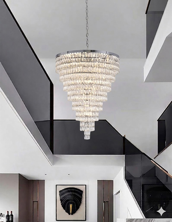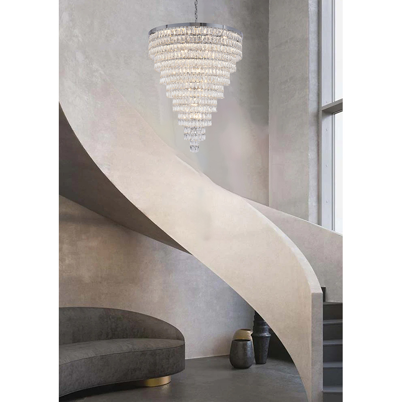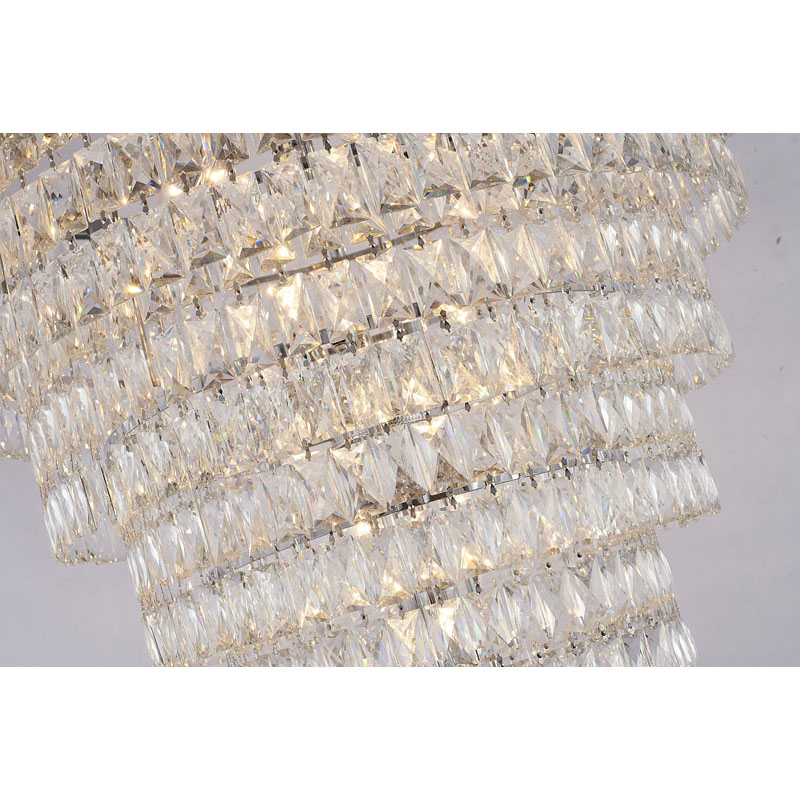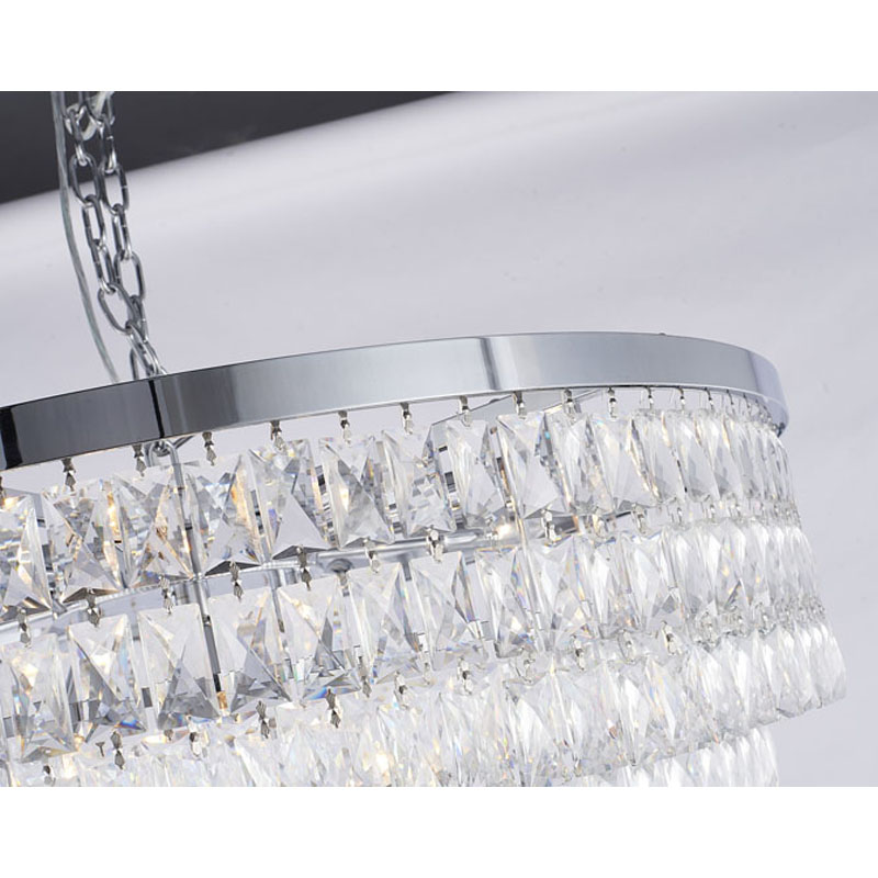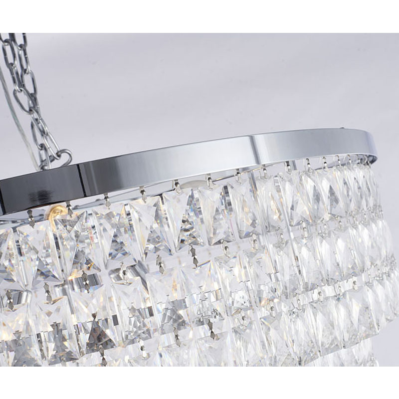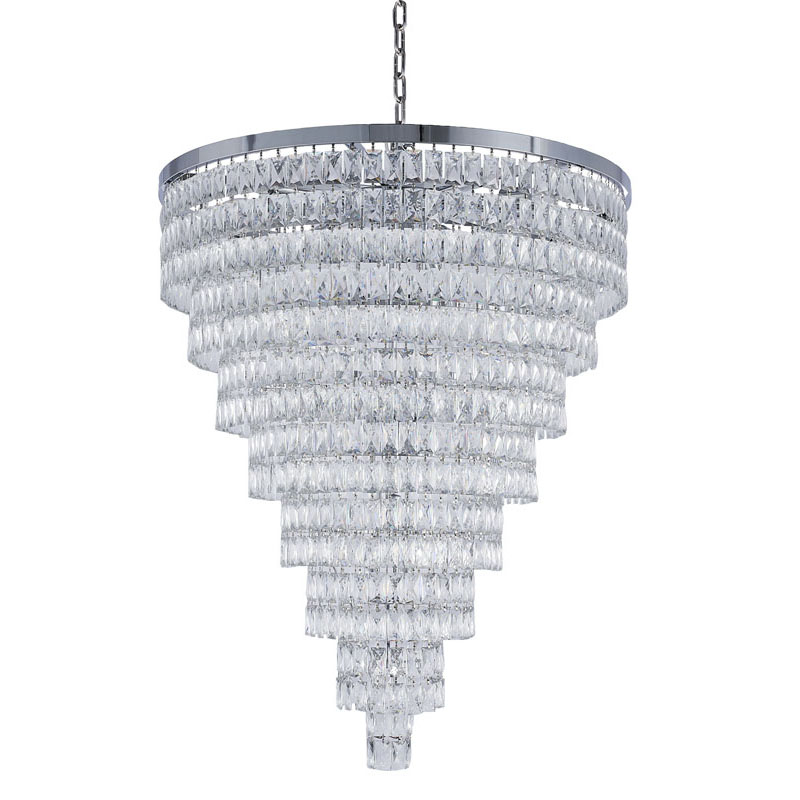 A CHROME EIGHT TIER CHANDELIER WITH CLEAR HANGING CRYSTALS