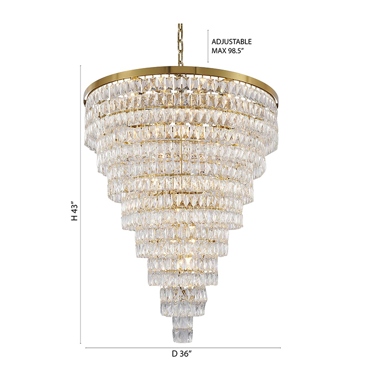 A GOLD EIGHT TIER CHANDELIER WITH CLEAR HANGING CRYSTALS