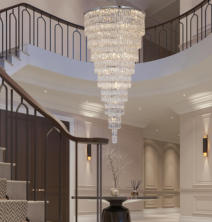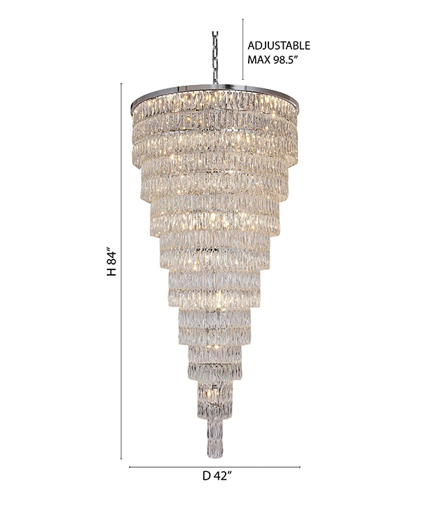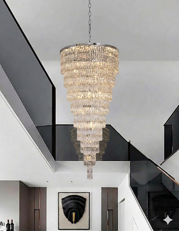 A CHROME NINE TIER CHANDELIER WITH CLEAR HANGING CRYSTALS