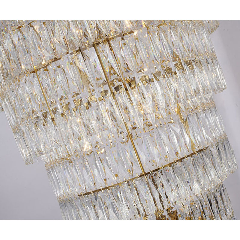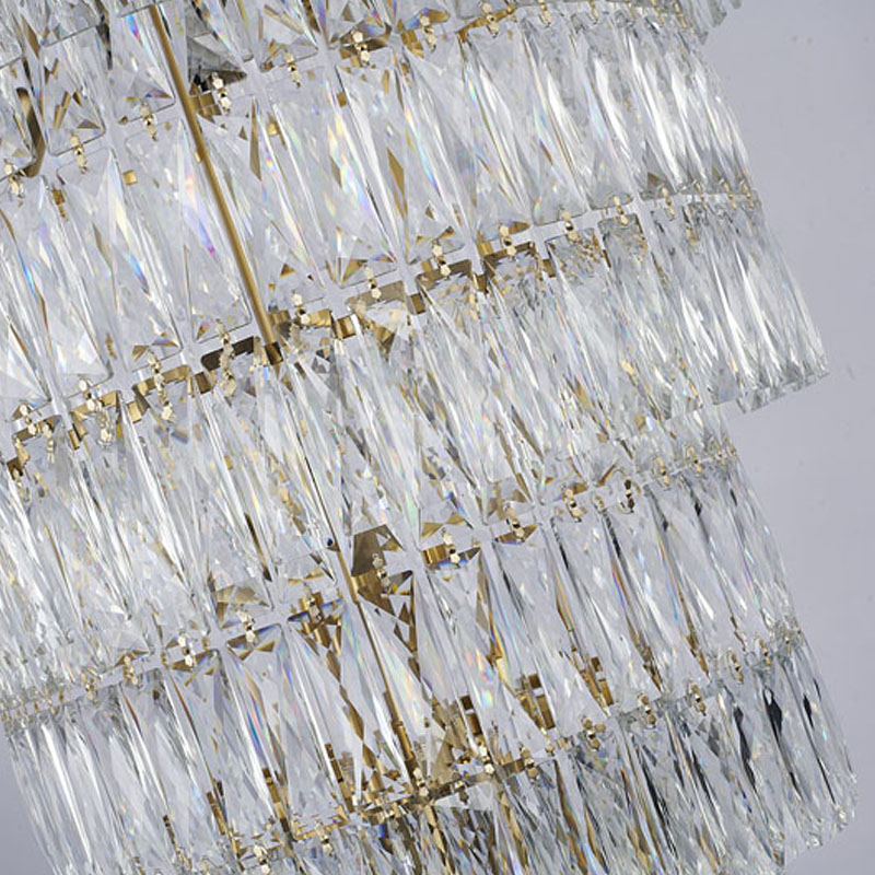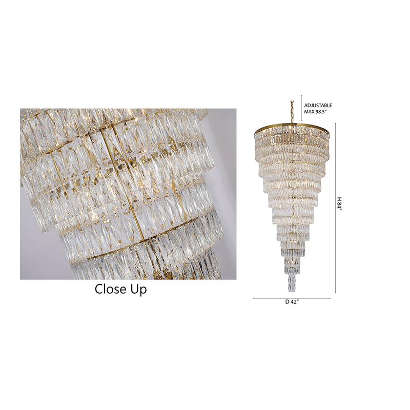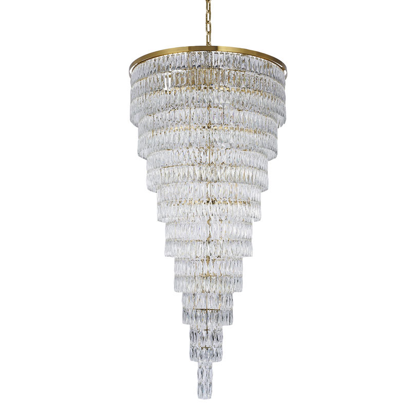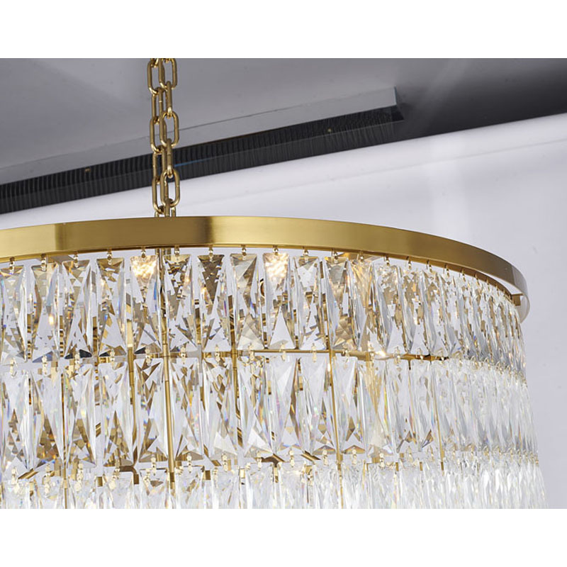 A GOLD NINE TIER CHANDELIER WITH CLEAR HANGING CRYSTALS
