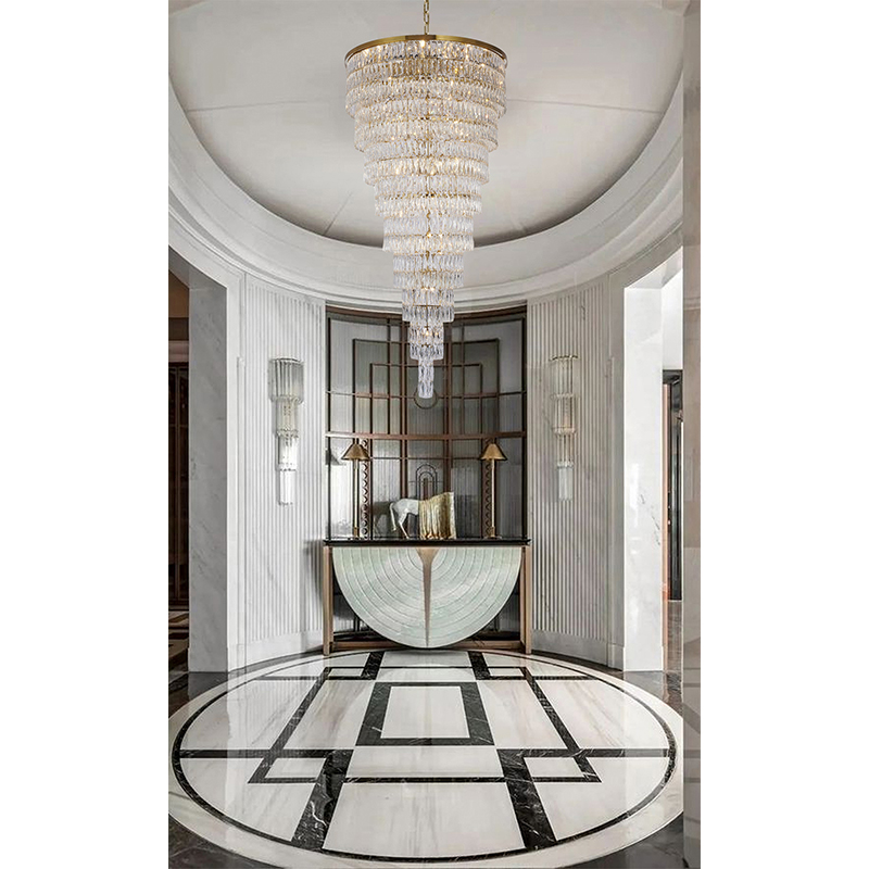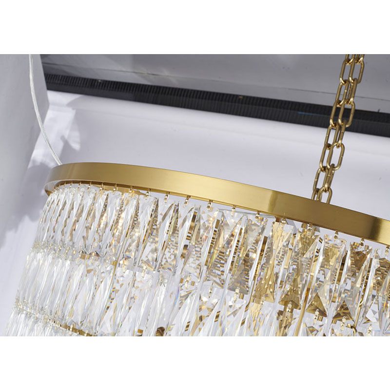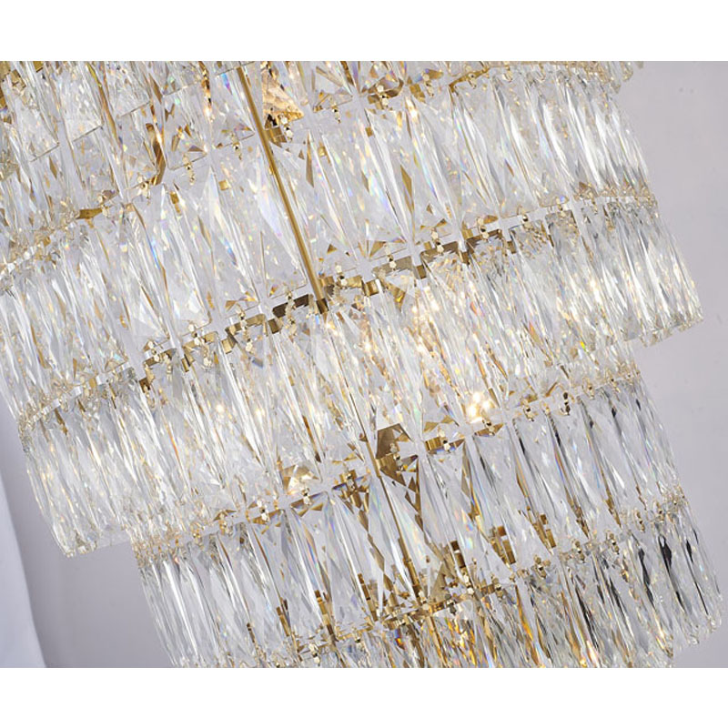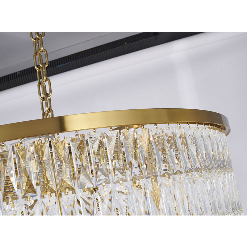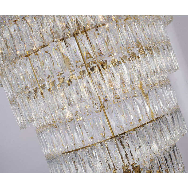 A GOLD NINE TIER CHANDELIER WITH CLEAR HANGING CRYSTALS