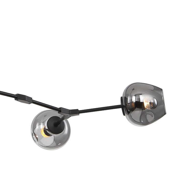 A BLACK FRAME CEILING FIXTURE WITH INDENTED SMOKE COLOR GLASS SHADES