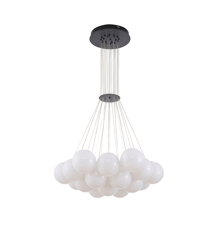 BLACK METAL CHANDELIER WITH WHITE GLASS SHADES
