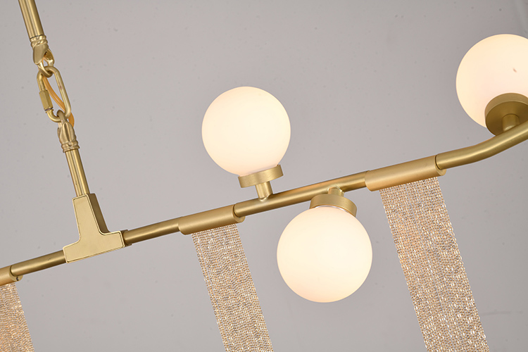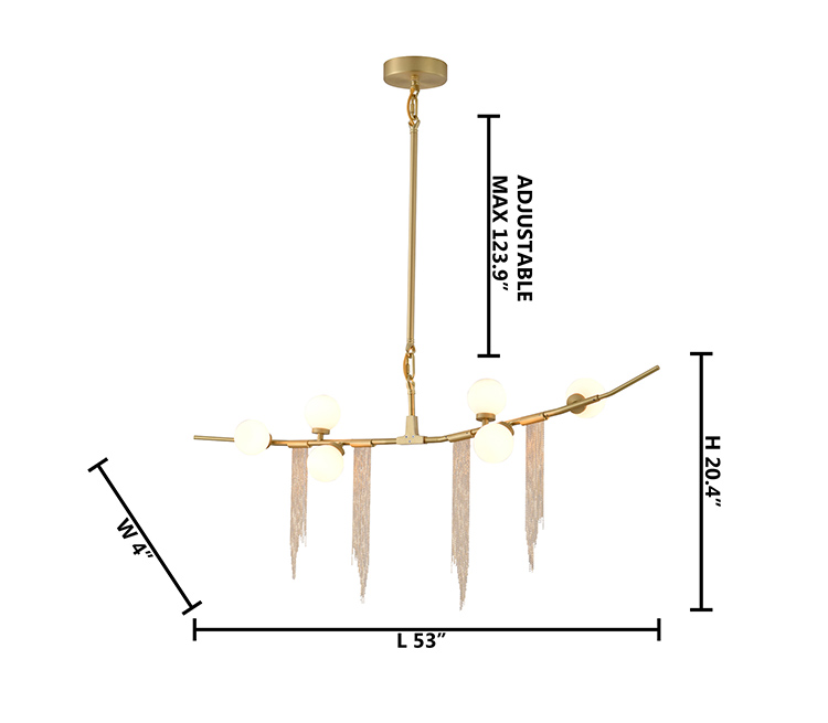 A GOLD FRAME BRANCH CHANDELIER WITH ALUMINUM CHAIN AND WHITE GLASS SHADES