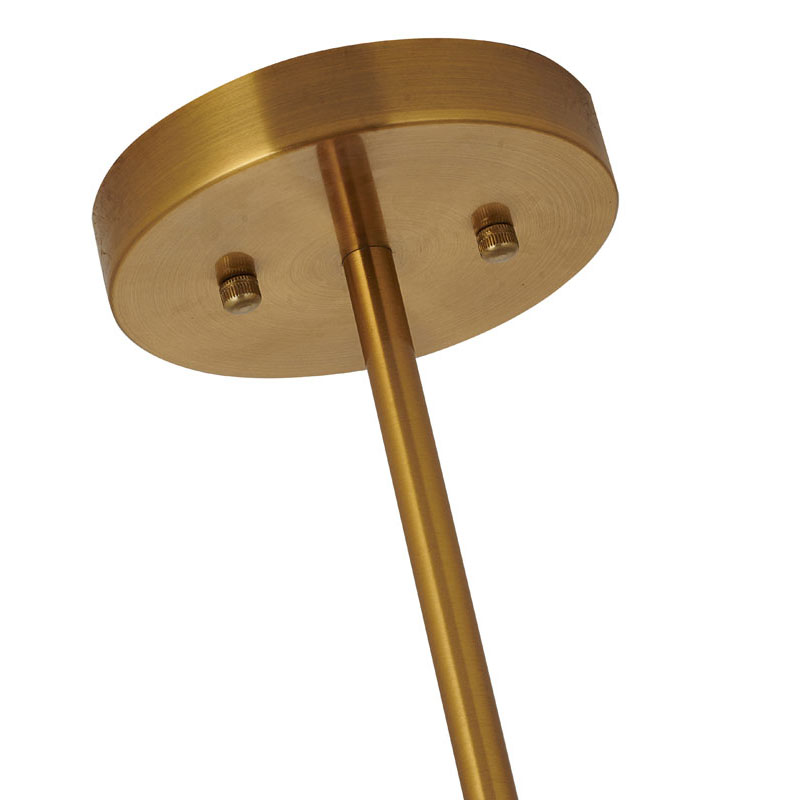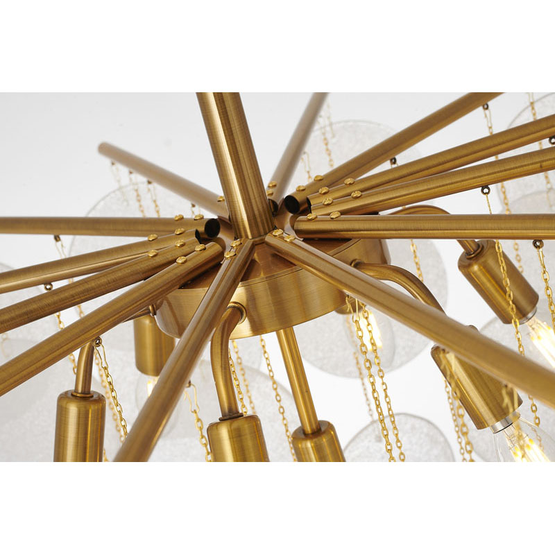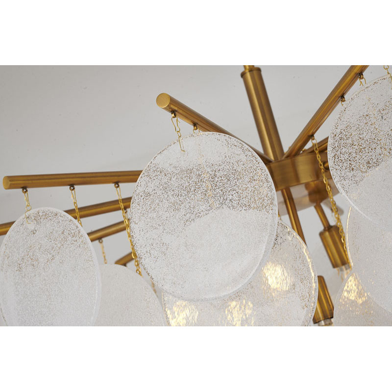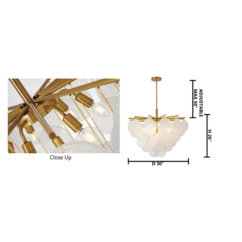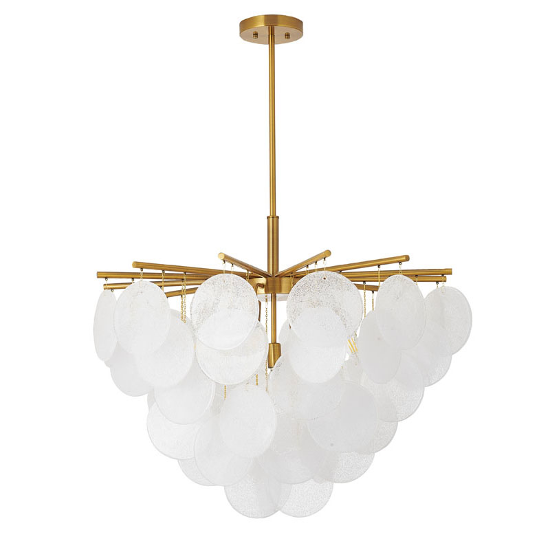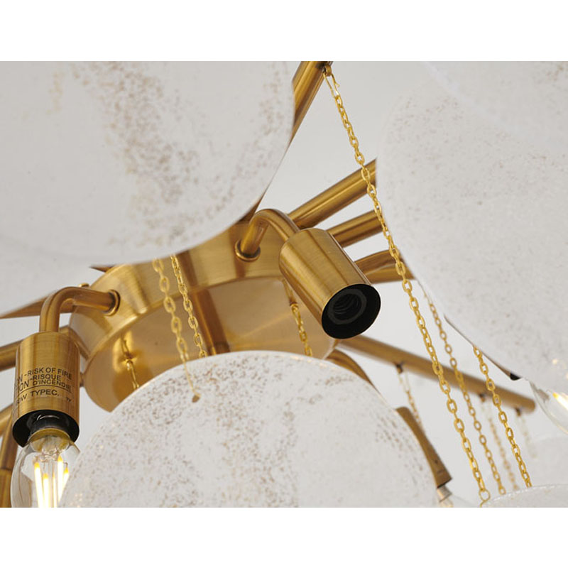 AN ANTIQUE BRASS METAL FRAME CHANDELIER WITH HANGING FROSTED GLASS
