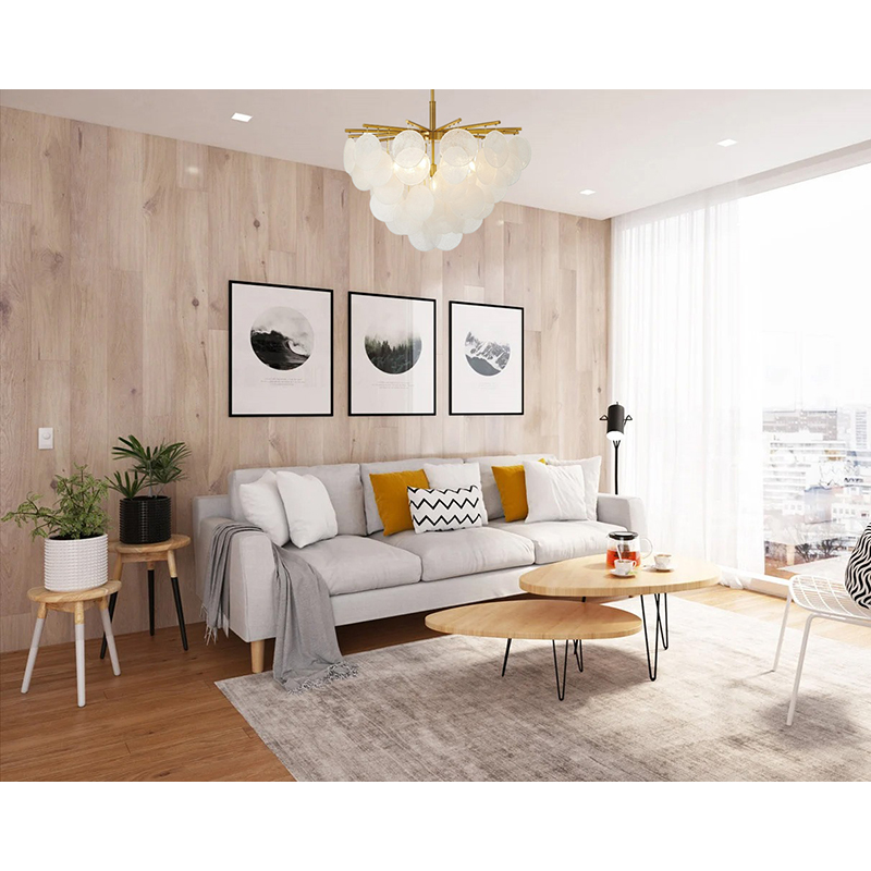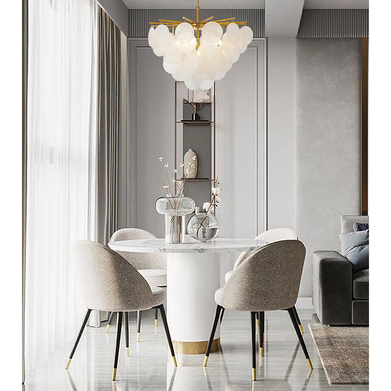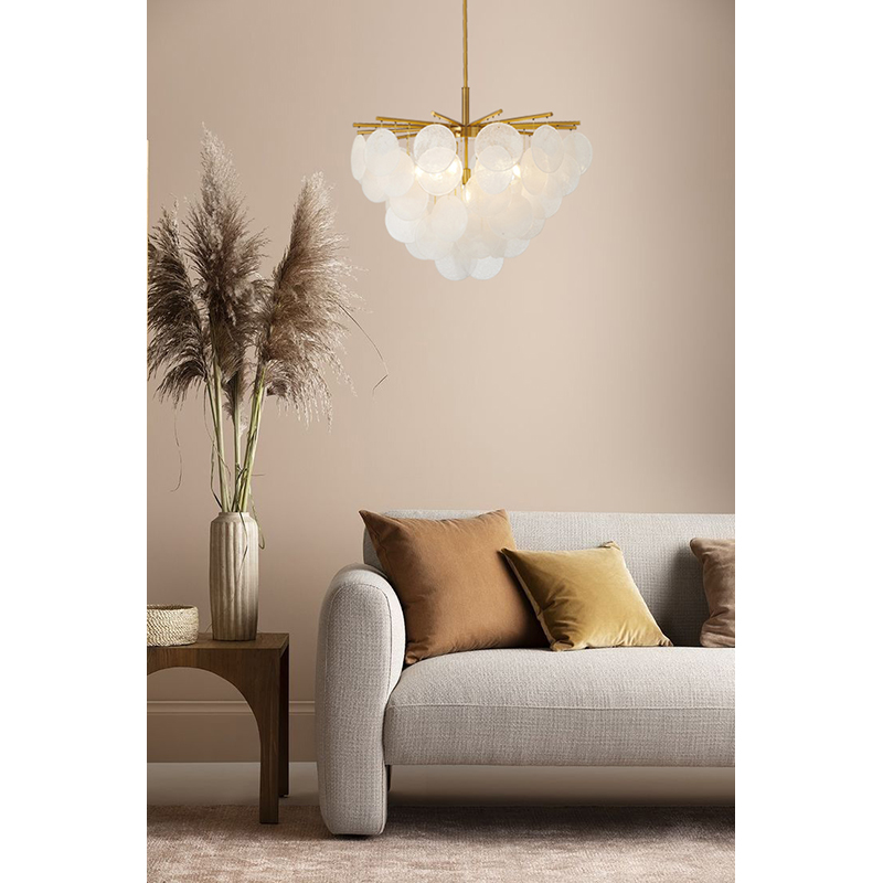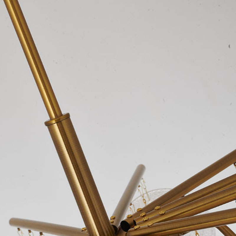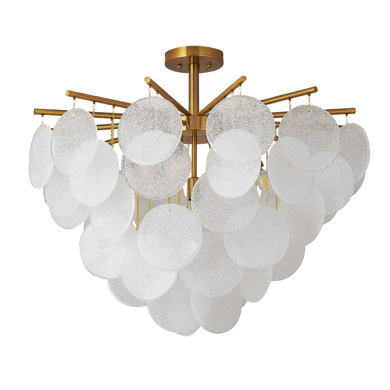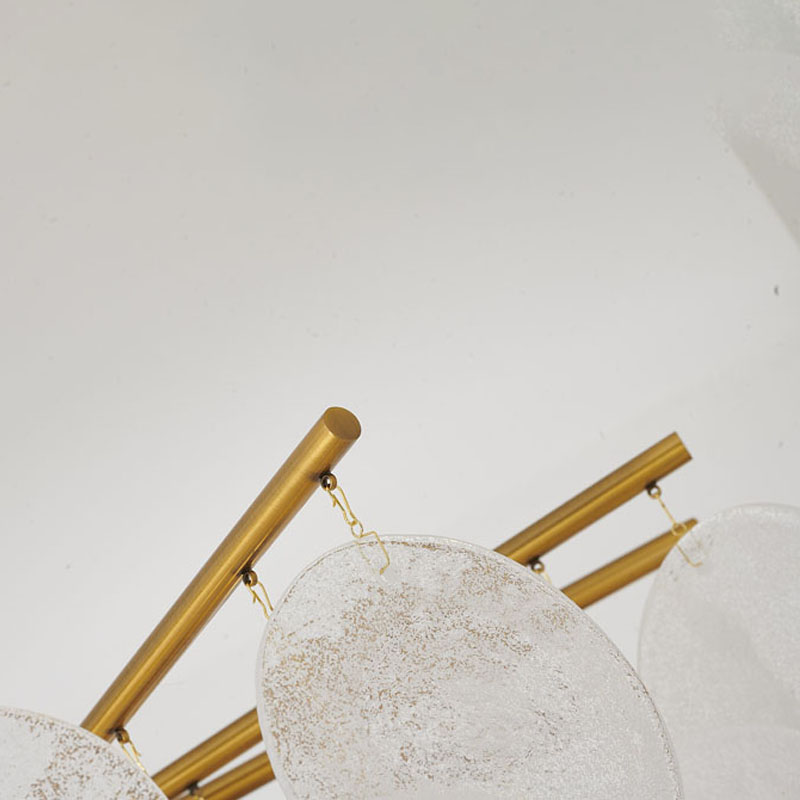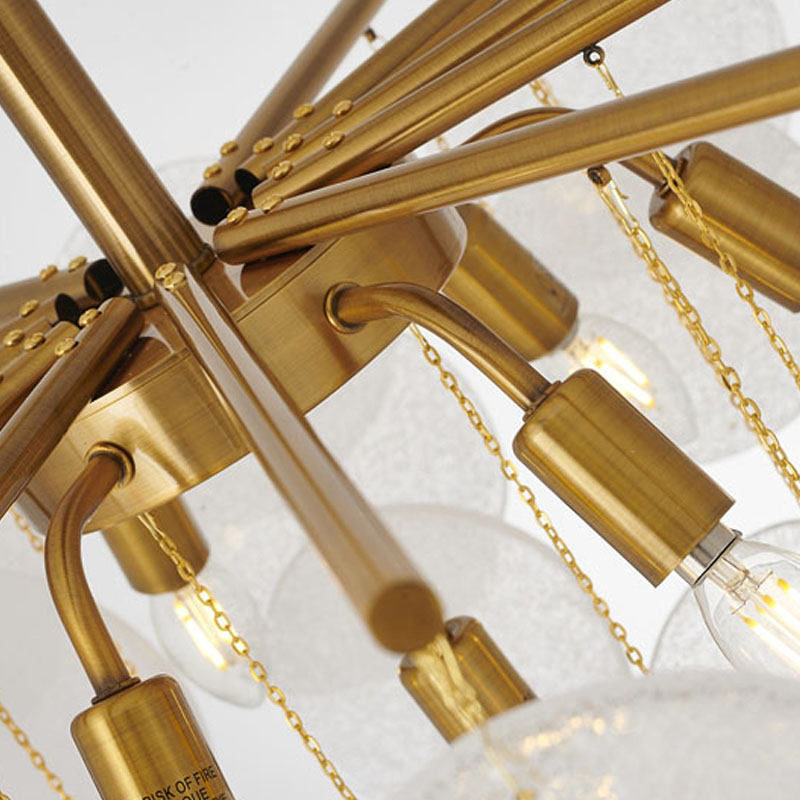 AN ANTIQUE BRASS METAL FRAME CHANDELIER WITH HANGING FROSTED GLASS