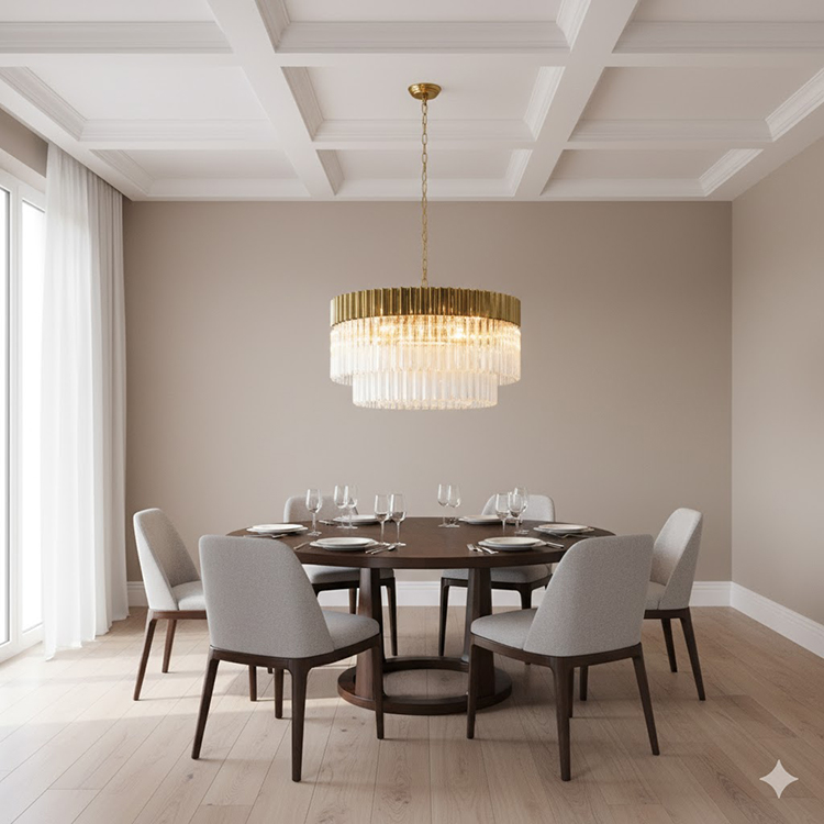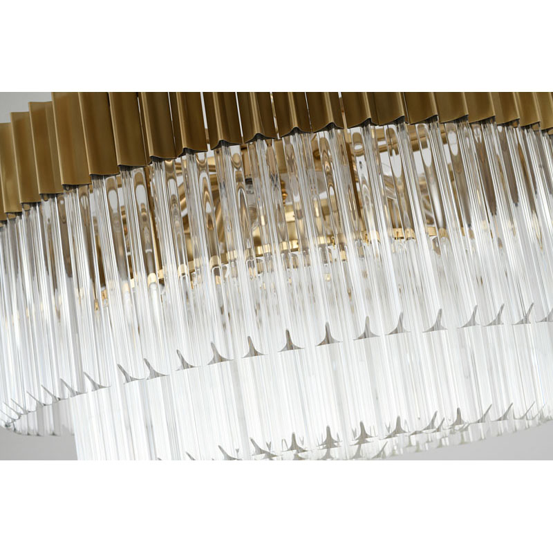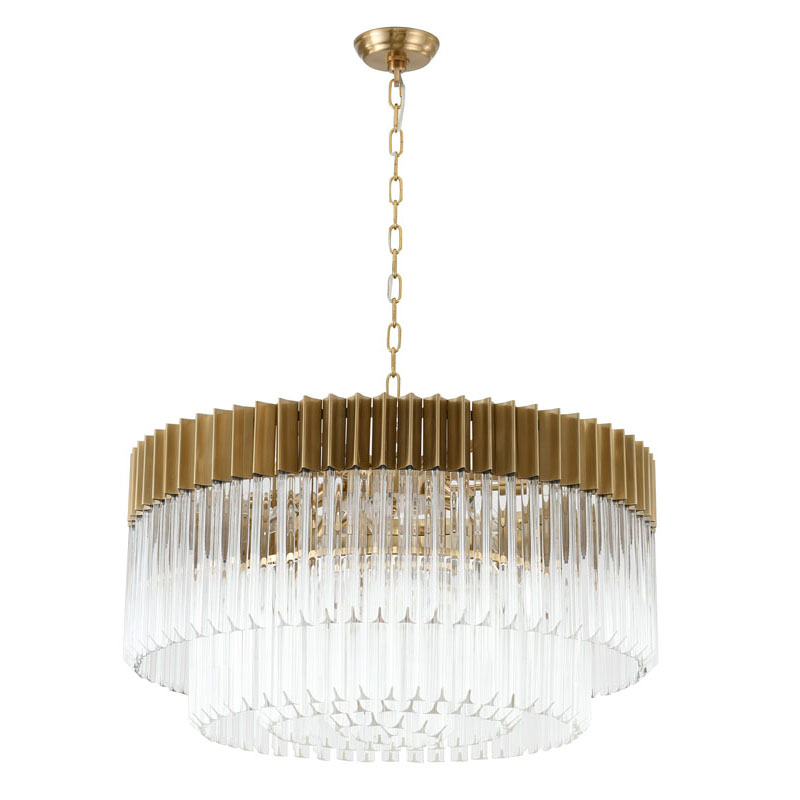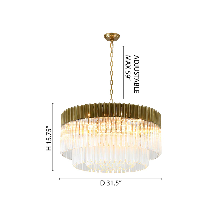 A ROUND BRASS STAINLESS STEEL FRAME CHANDELIER WITH CLEAR HANGING CRYSTALS
