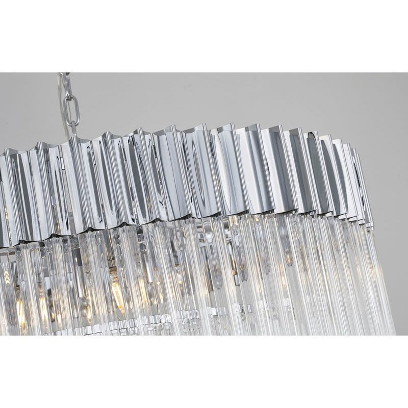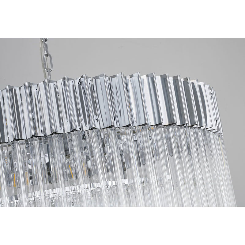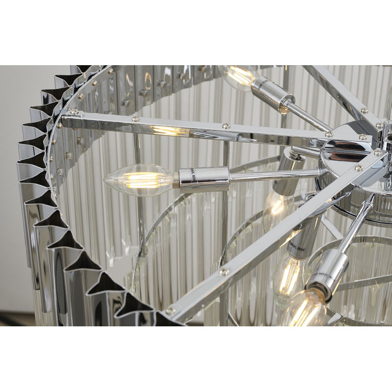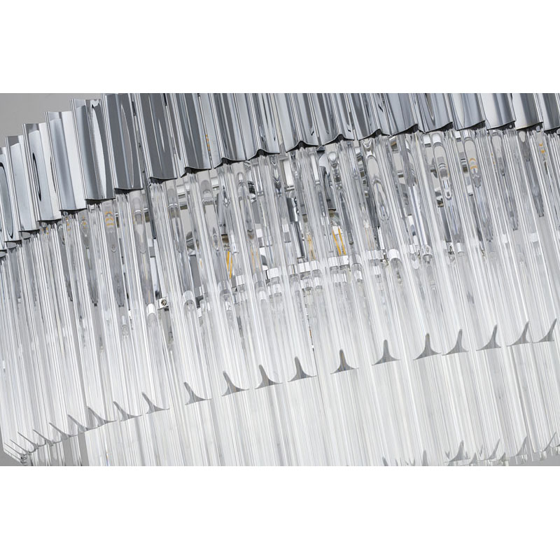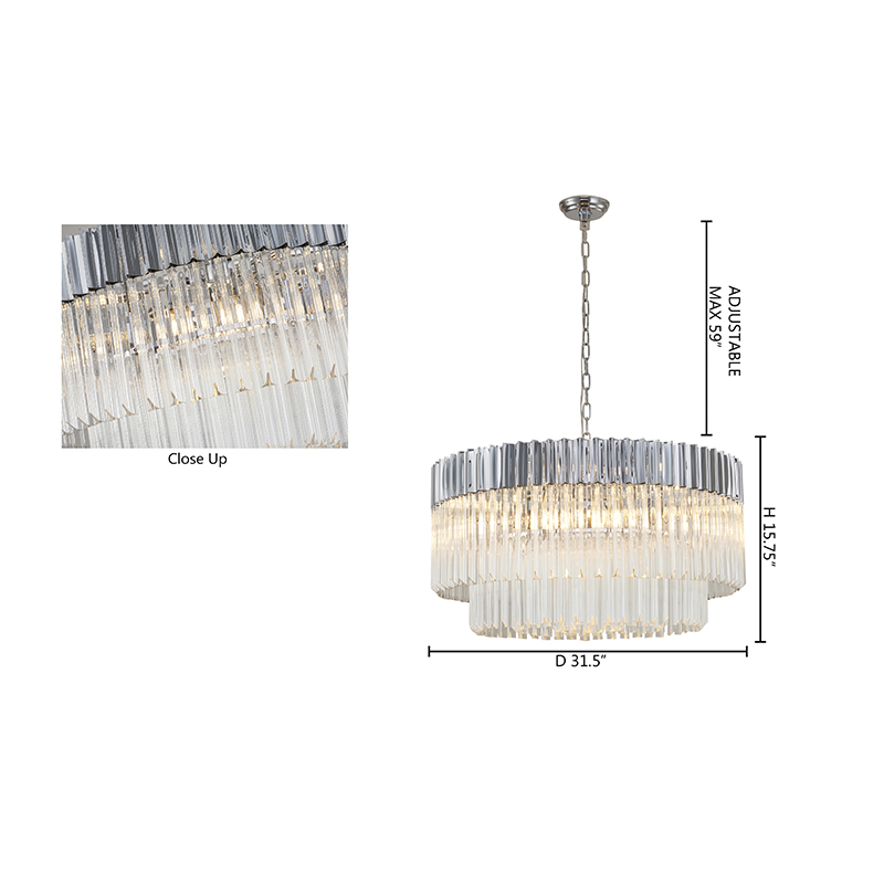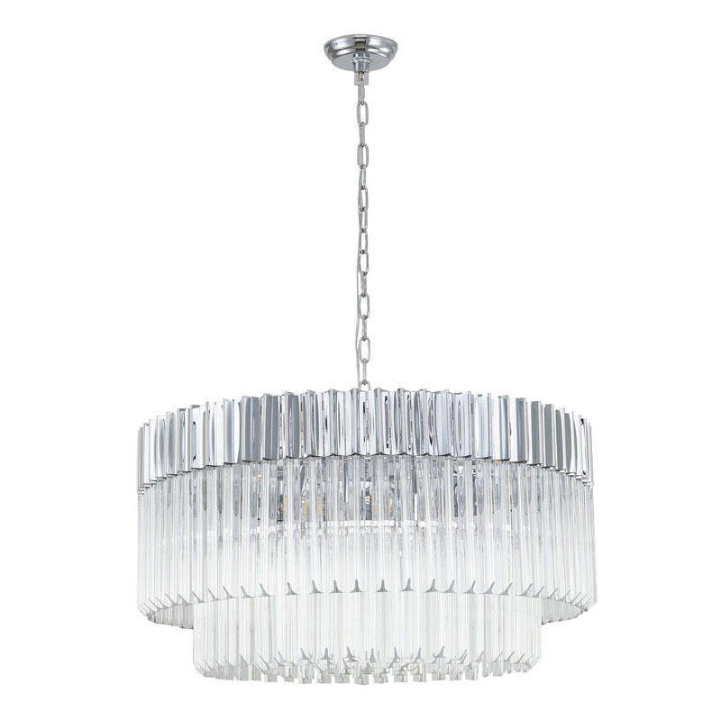 A ROUND CHROME STAINLESS STEEL CHANDELIER WITH CLEAR HANGING CRYSTALS