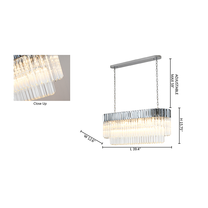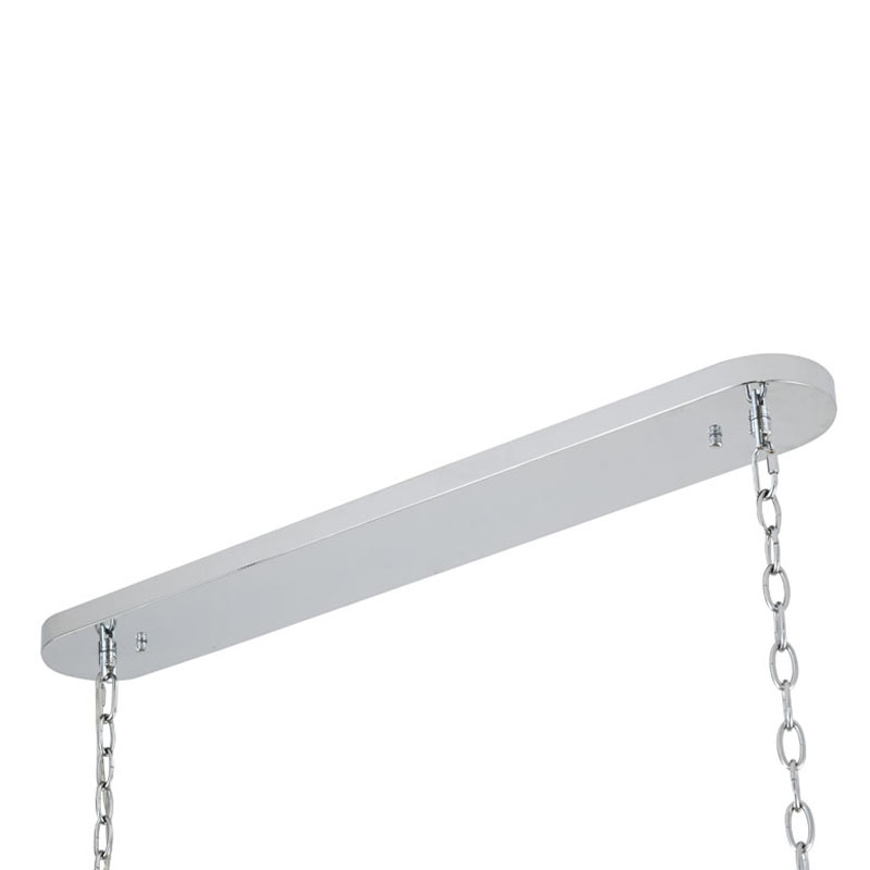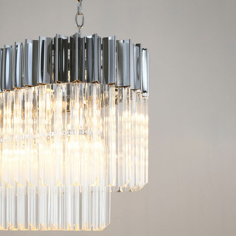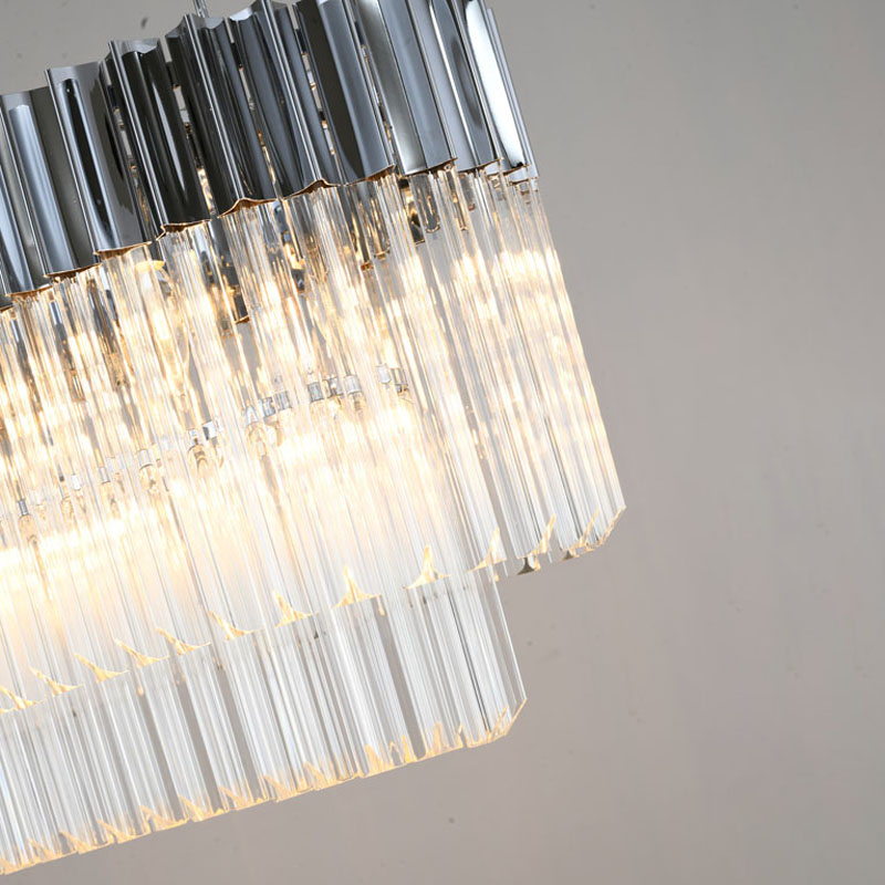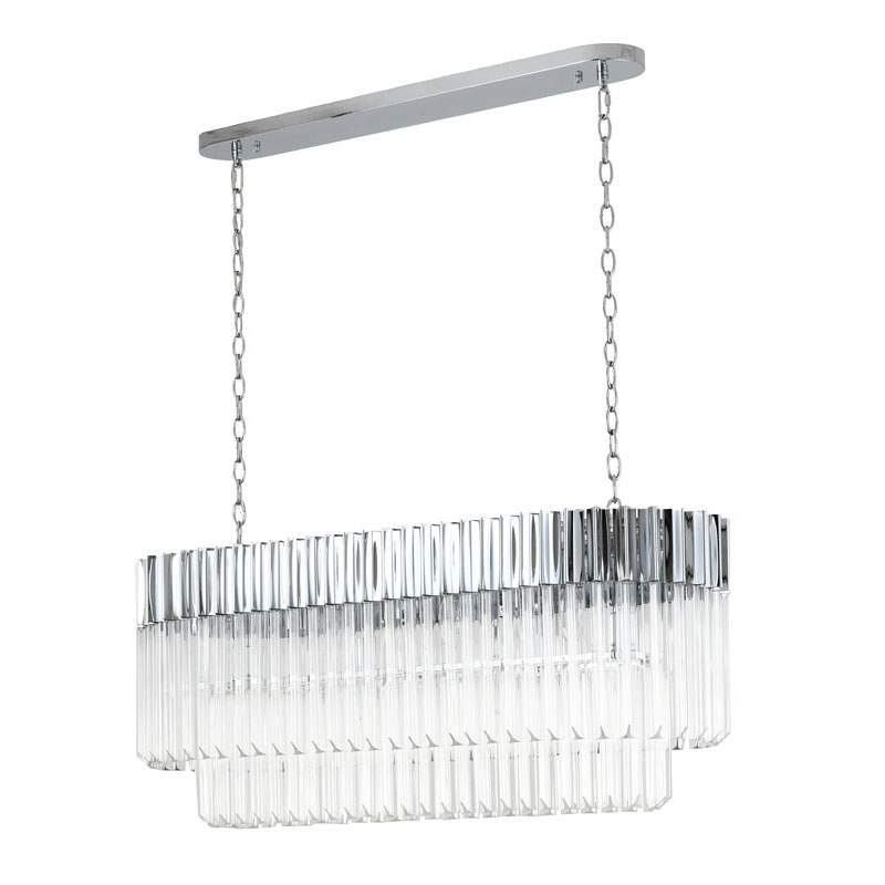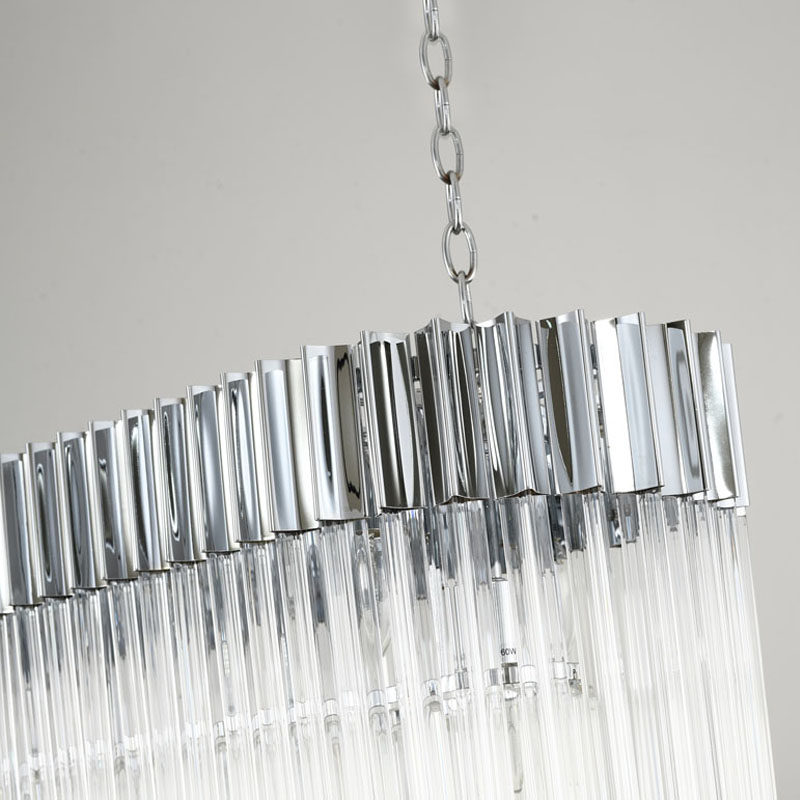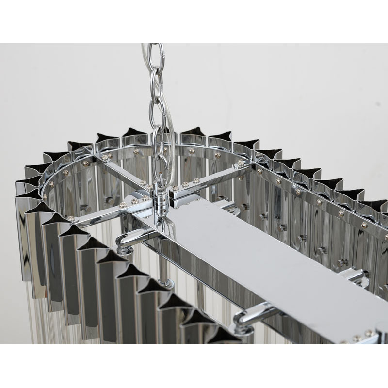 A CHROME OVAL STAINLESS STEEL FRAME CHANDELIER WITH CLEAR HANGING CRYSTALS