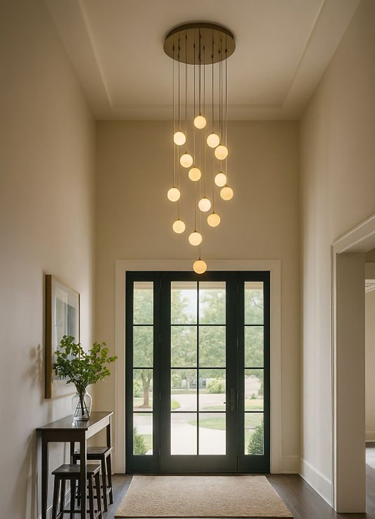 BRASS STAINLESS STEEL CHANDELIER WITH ALABASTER PENDANTS