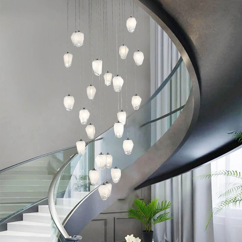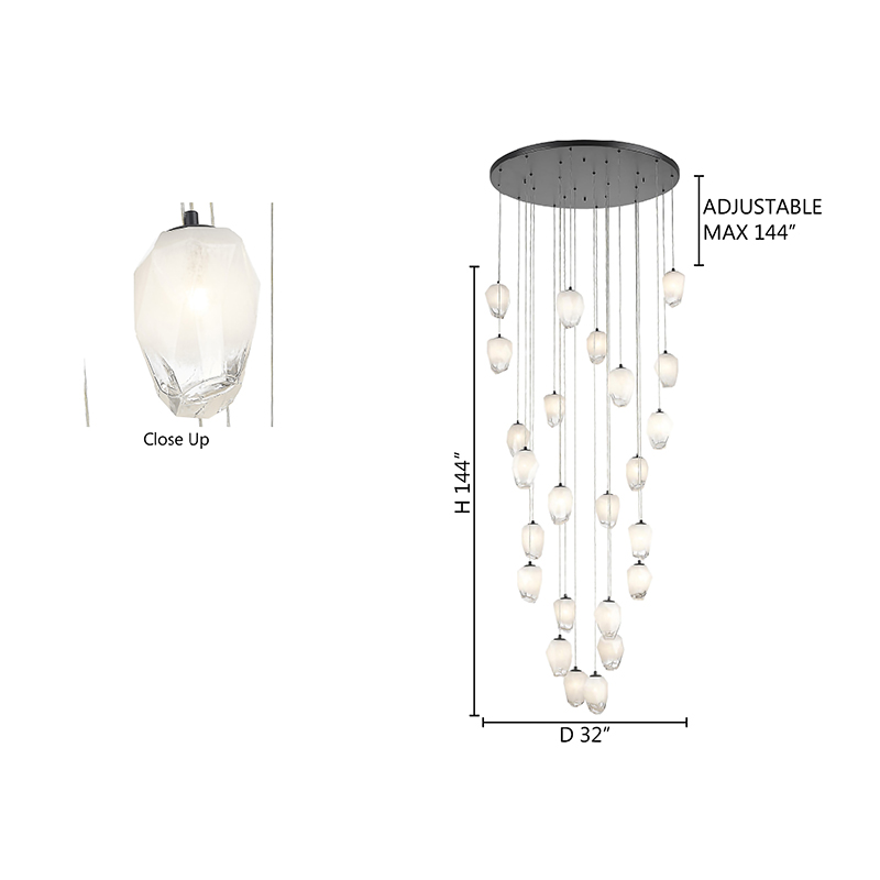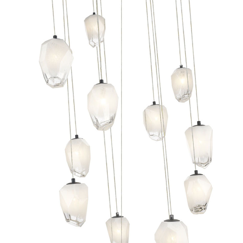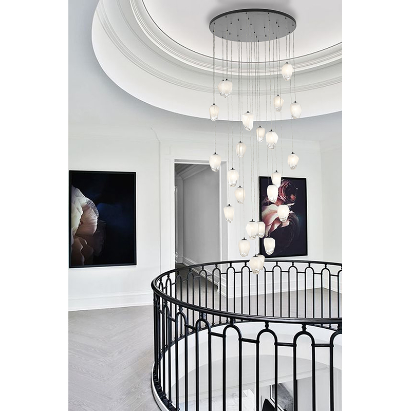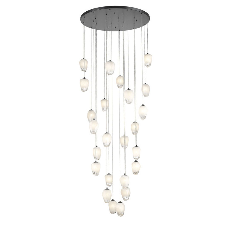 A ROUND BLACK FLUSHED CHANDELIER WITH HANGING WHITE GLASS PENDANTS
