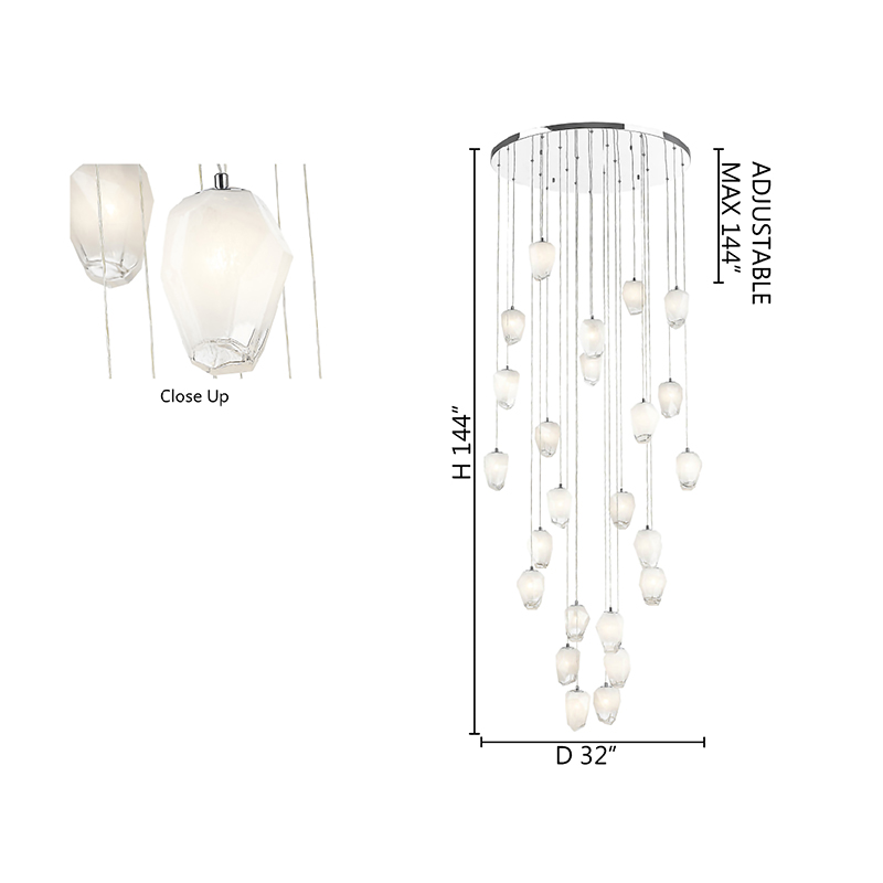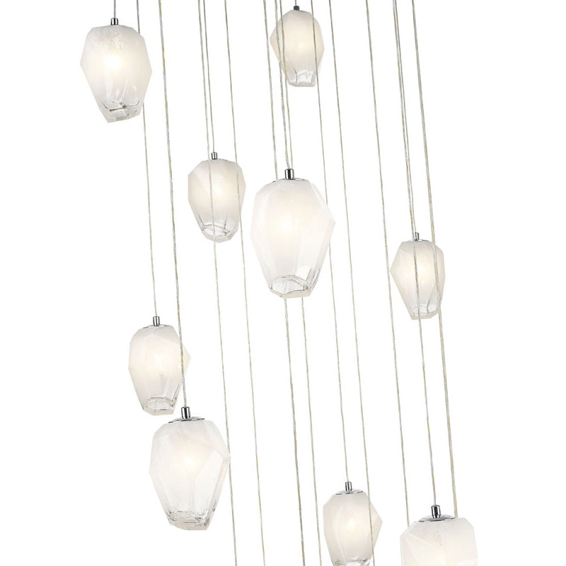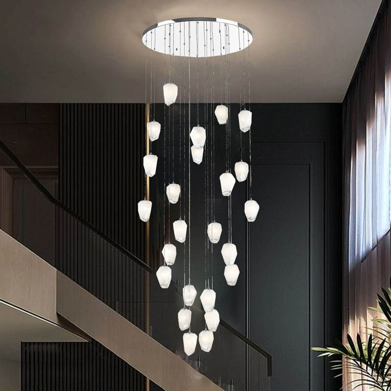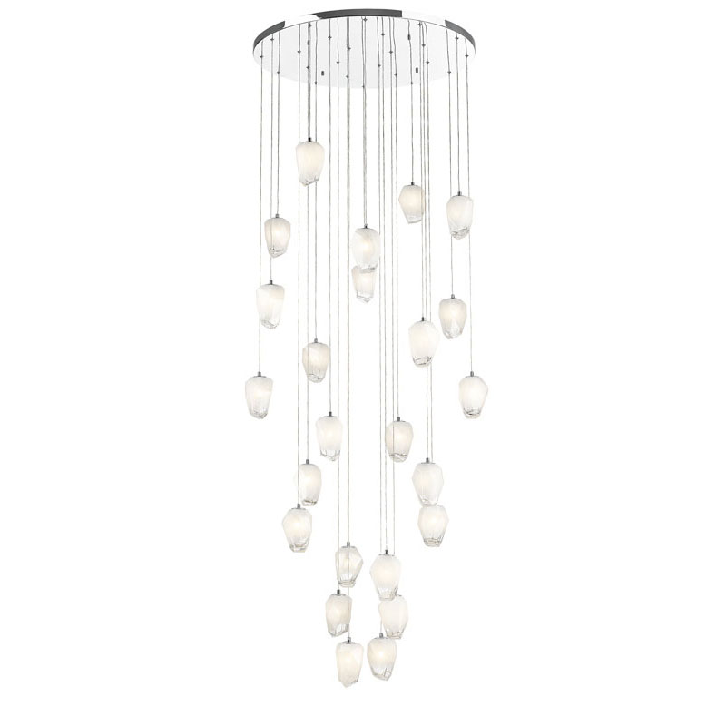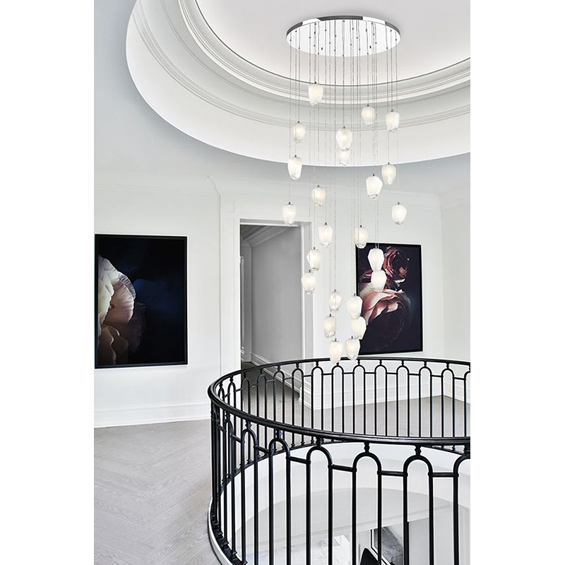 A ROUND CHROME FLUSHED CHANDELIER WITH HANGING WHITE GLASS PENDANTS