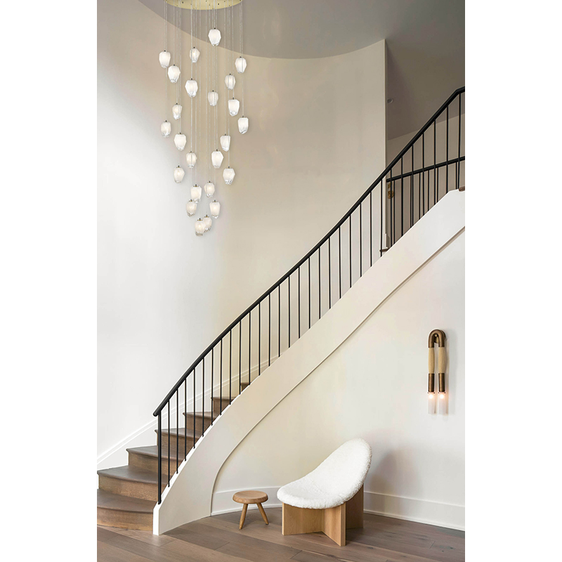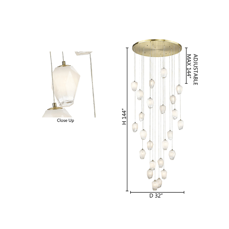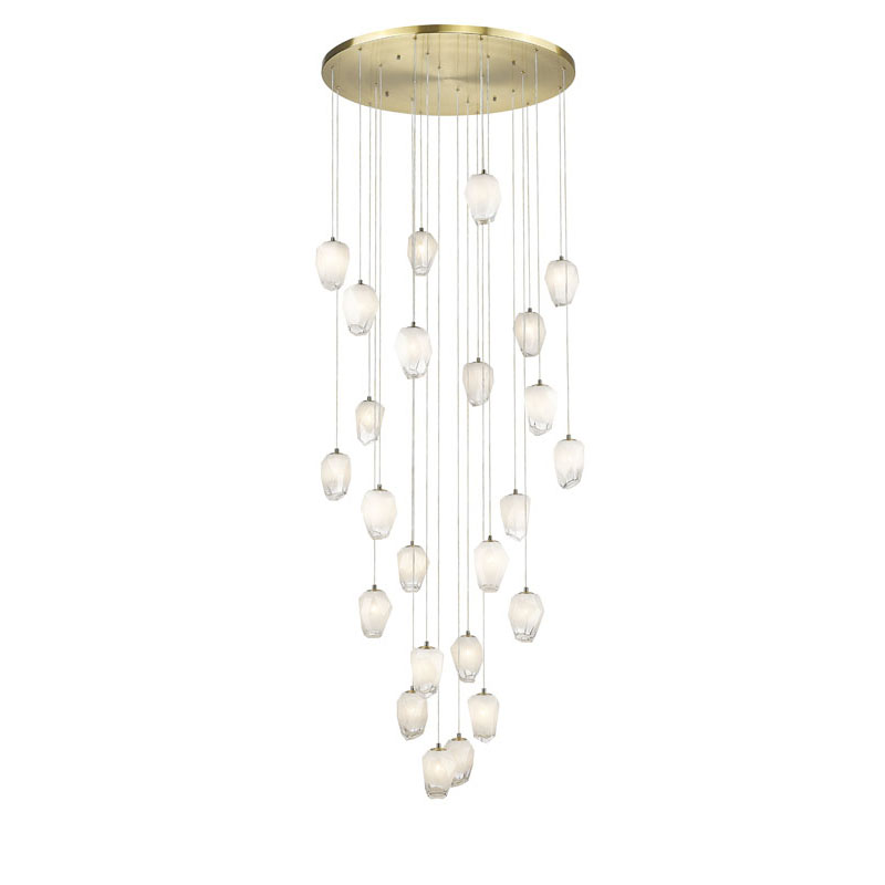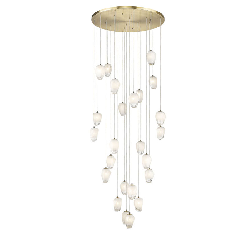 A ROUND GOLD FLUSHED CHANDELIER WITH HANGING WHITE GLASS PENDANTS