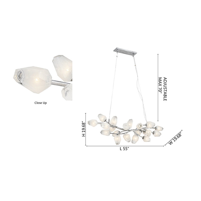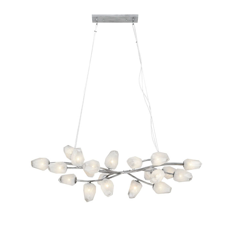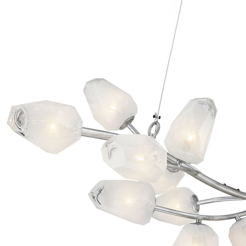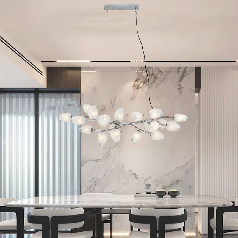 A SILVER BRANCH FRAME CHANDELIER WITH WHITE GLASS SHADES