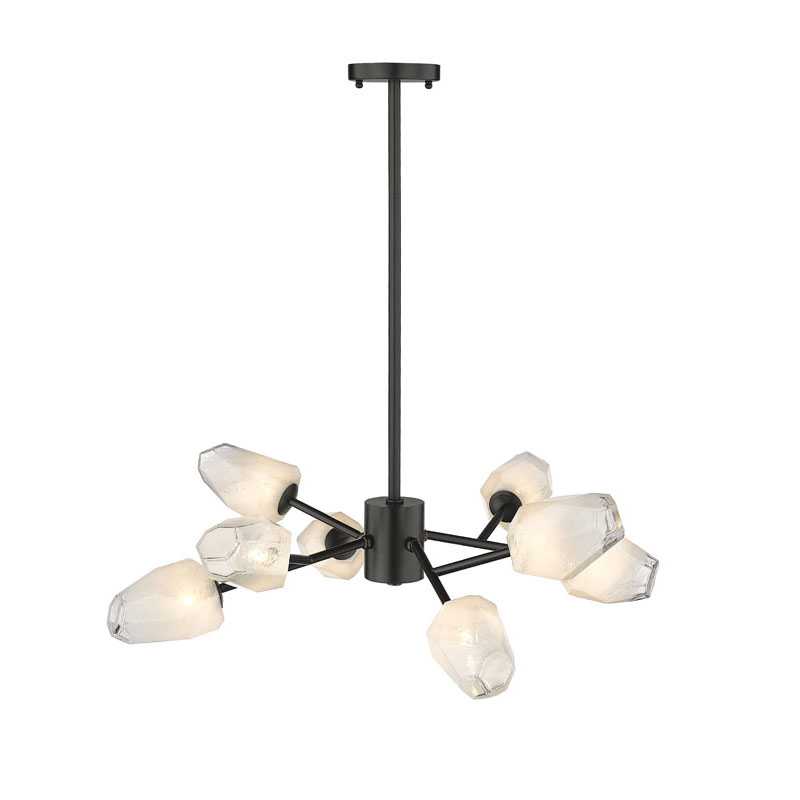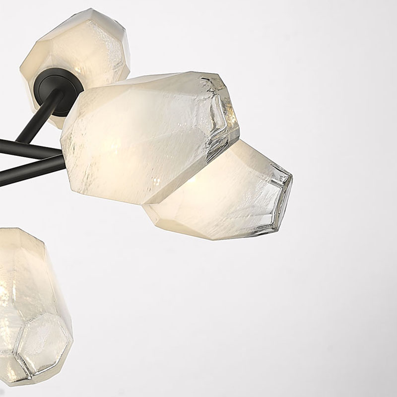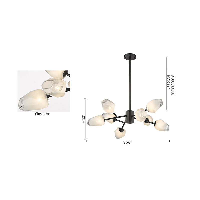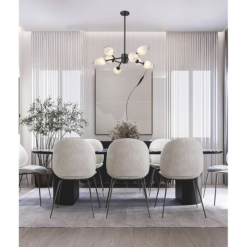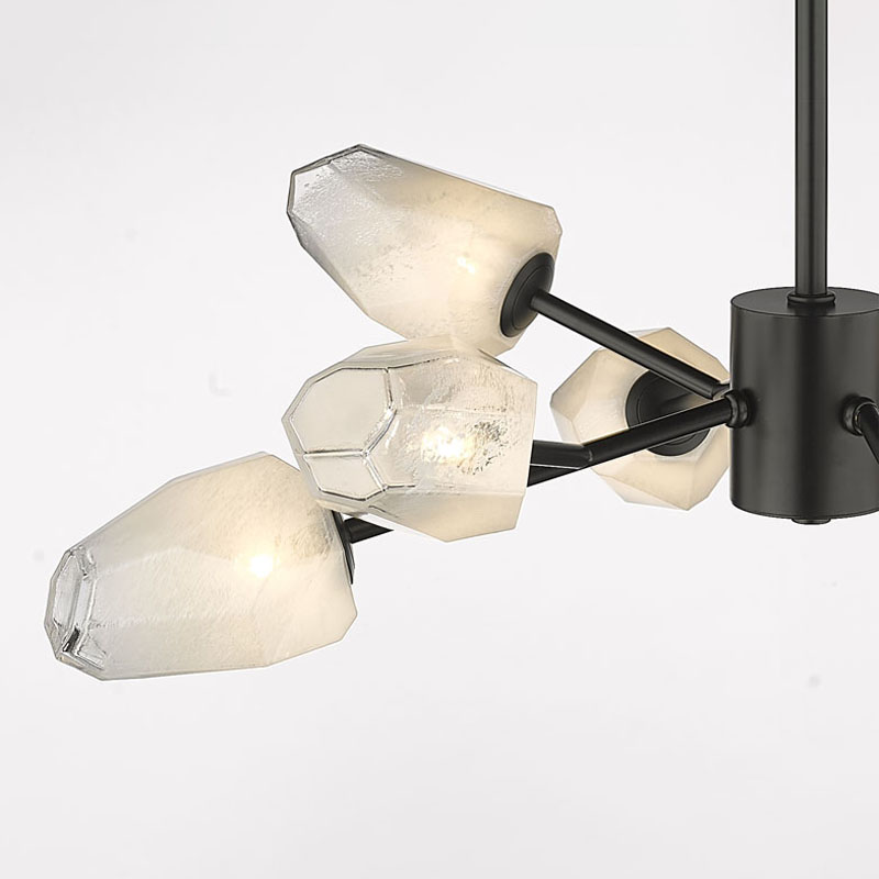 A BLACK BRANCH CHANDELIER WITH WHITE GLASS SHADES