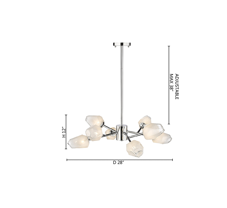 A CHROME BRANCH CHANDELIER WITH WHITE GLASS SHADES