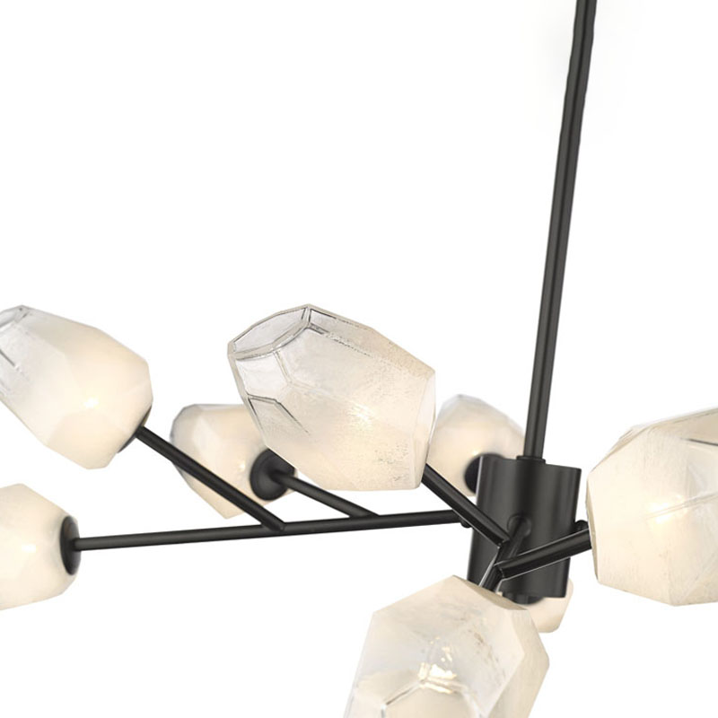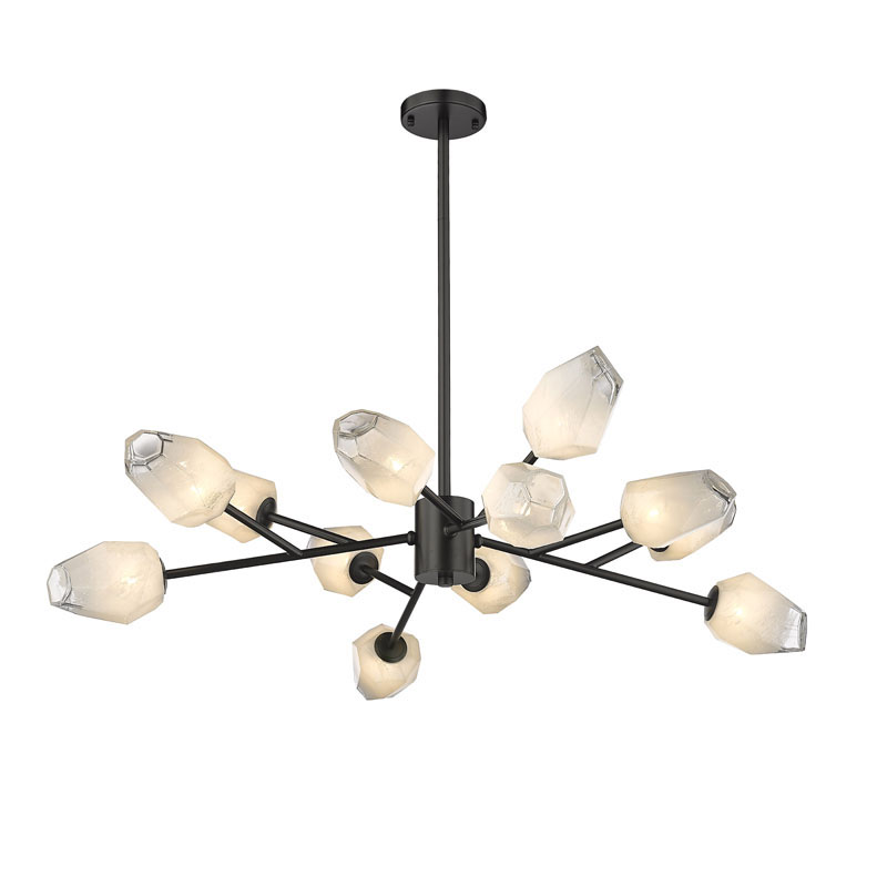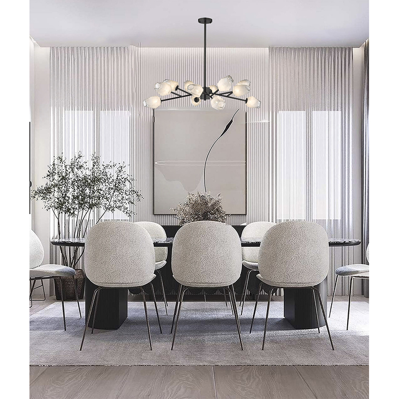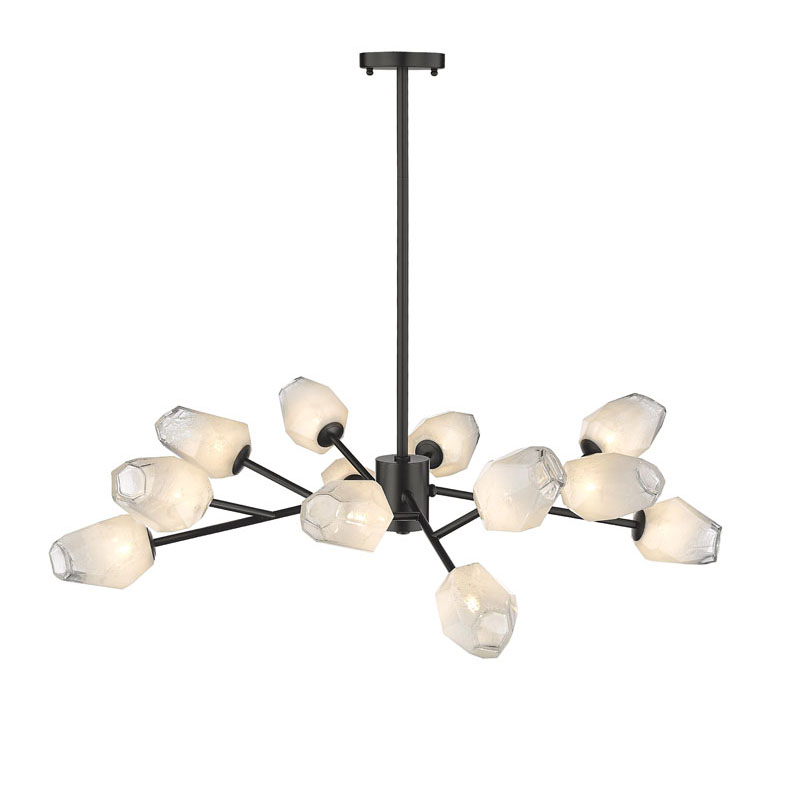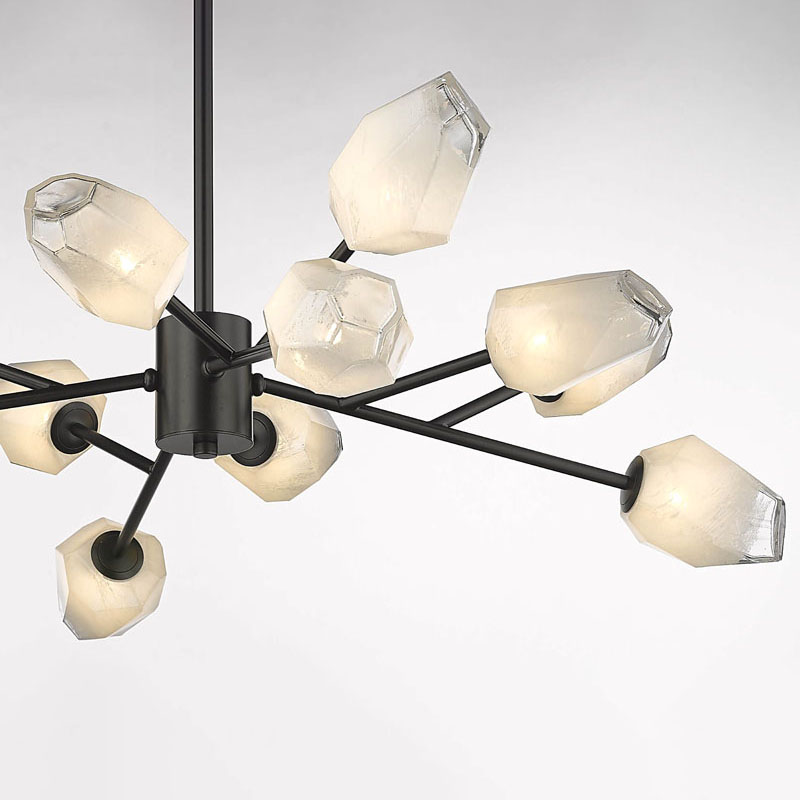 A BLACK BRANCH CHANDELIER WITH WHITE GLASS SHADES