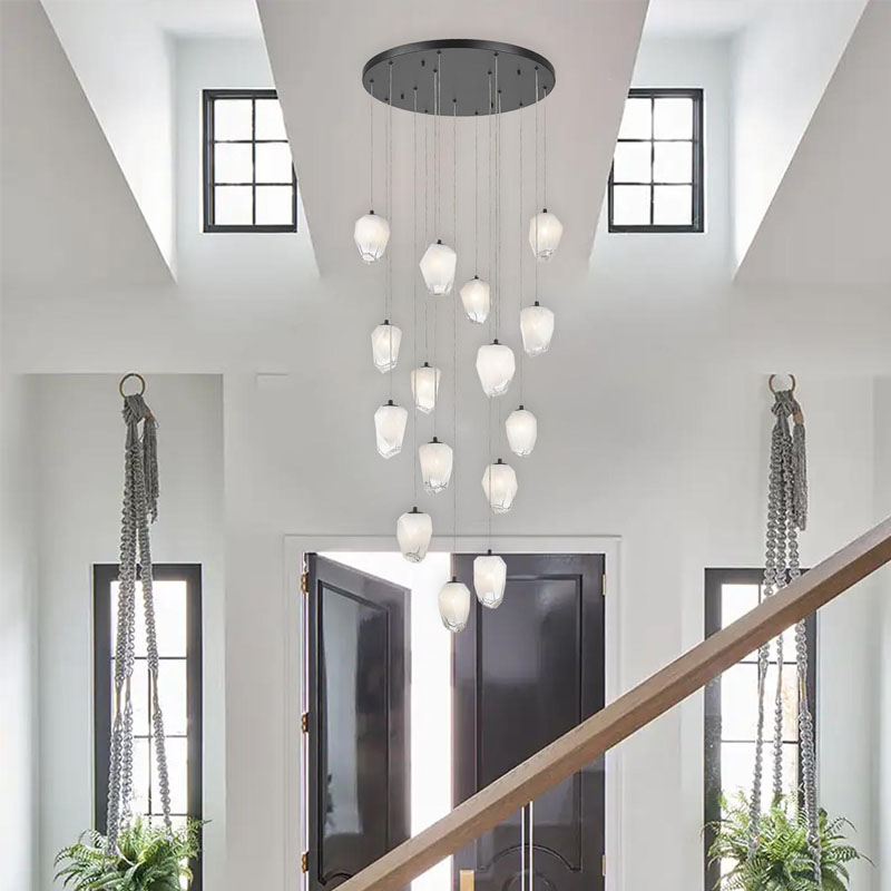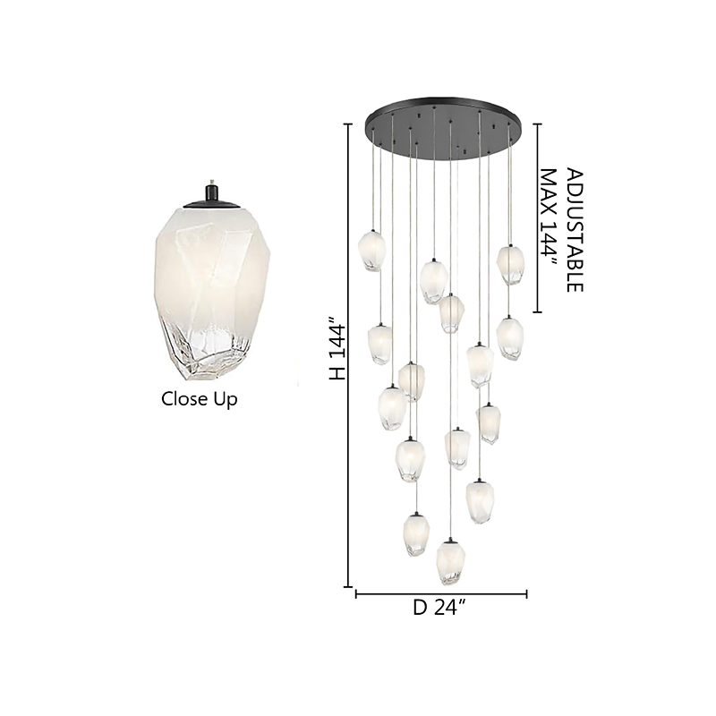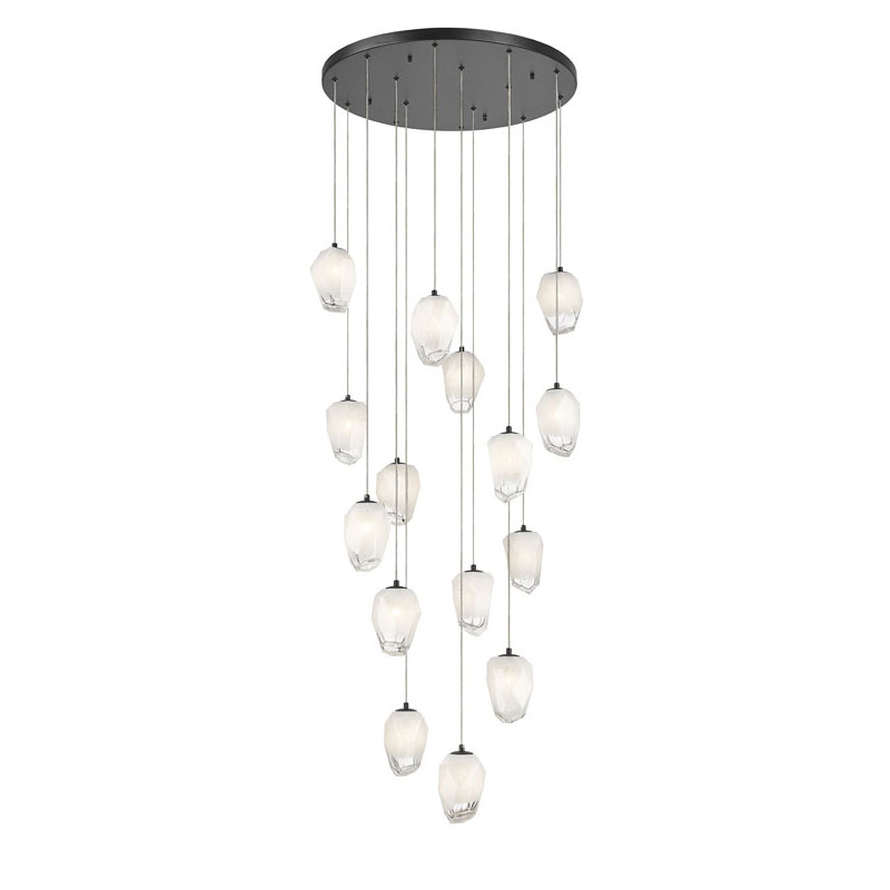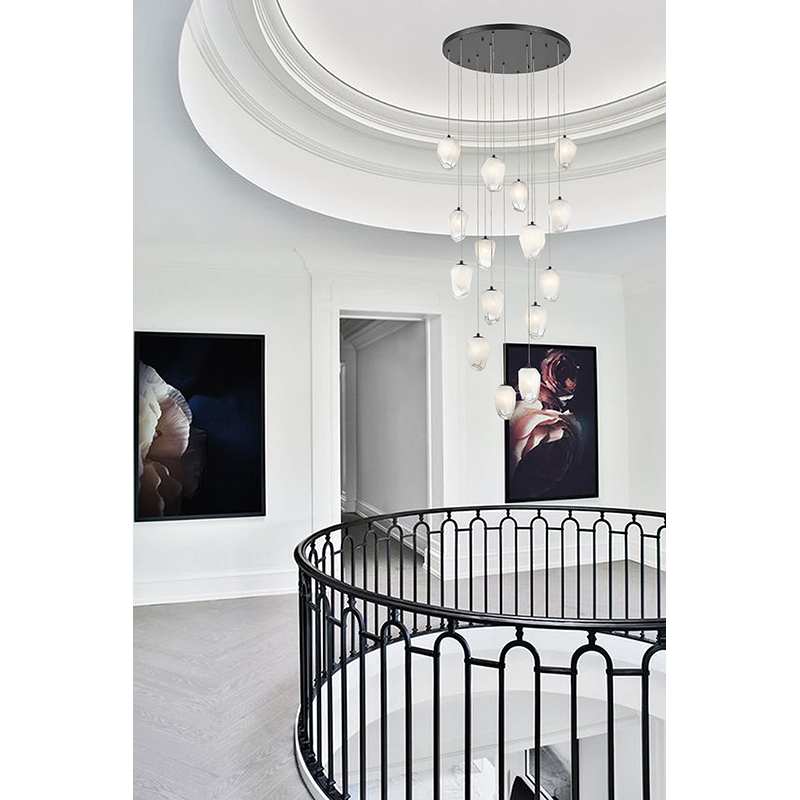 A ROUND BLACK FLUSHED CHANDELIER WITH HANGING WHITE GLASS PENDANTS