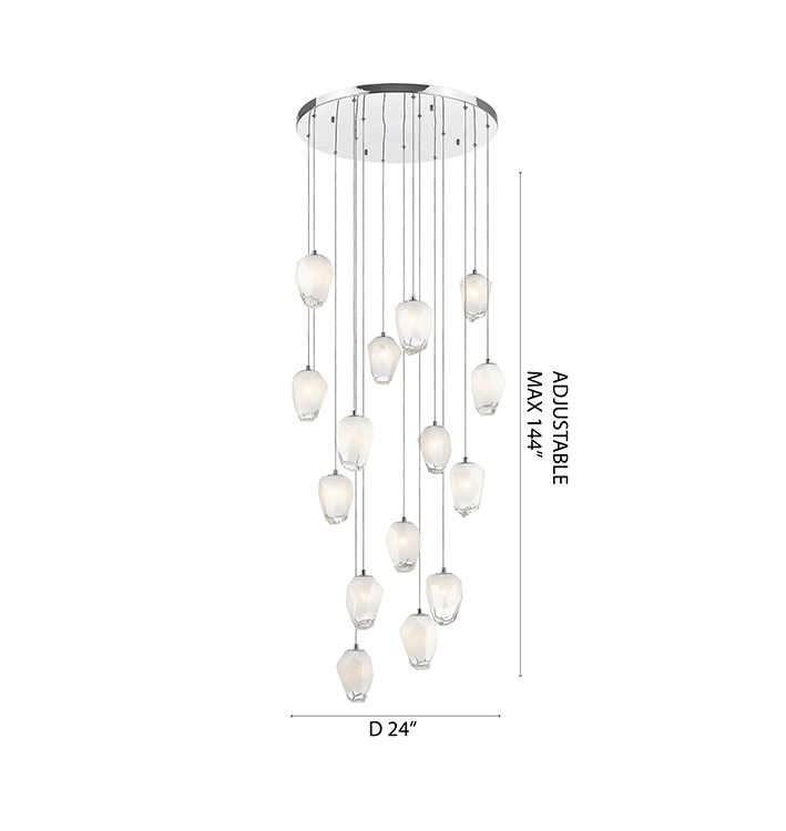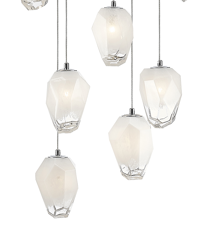 A ROUND CHROME FLUSHED CHANDELIER WITH HANGING WHITE GLASS PENDANTS
