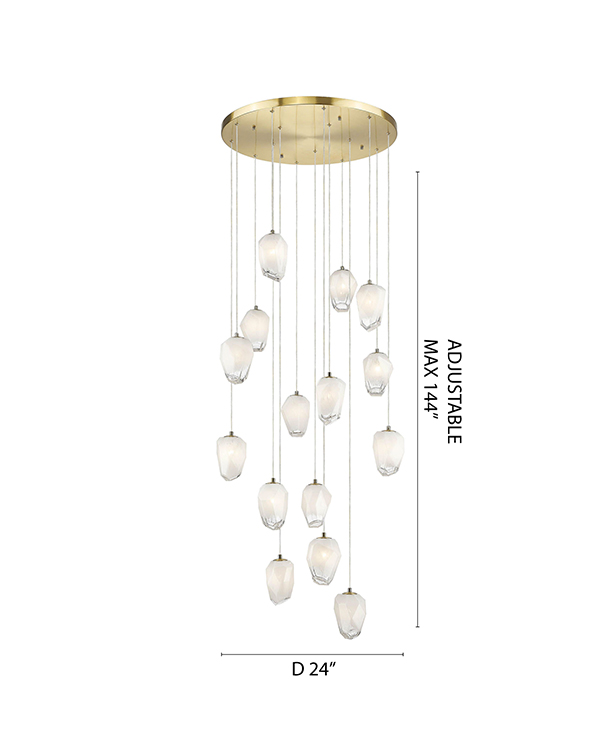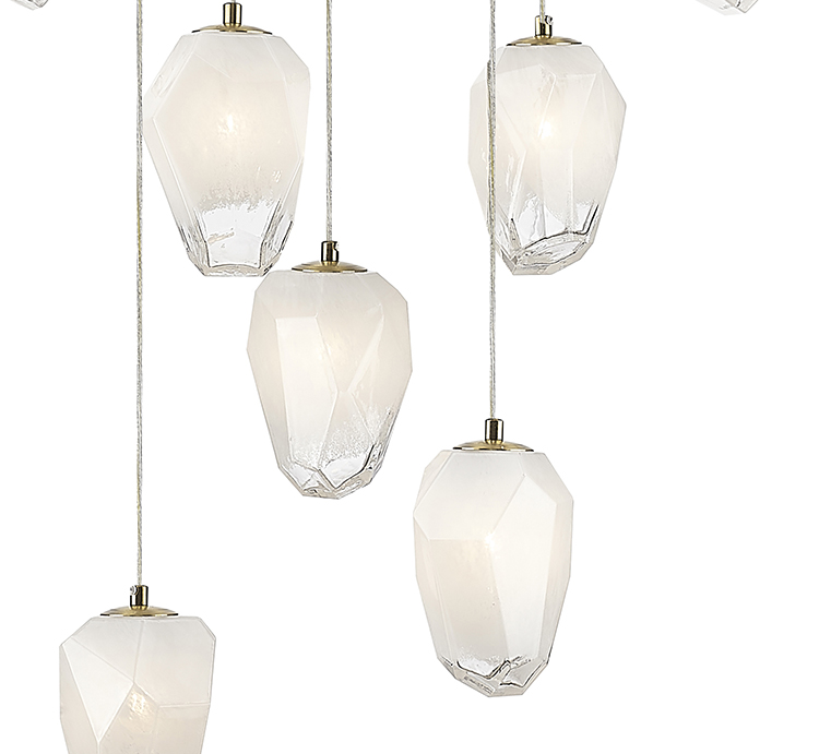 A ROUND GOLD FLUSHED CHANDELIER WITH HANGING WHITE GLASS PENDANTS
