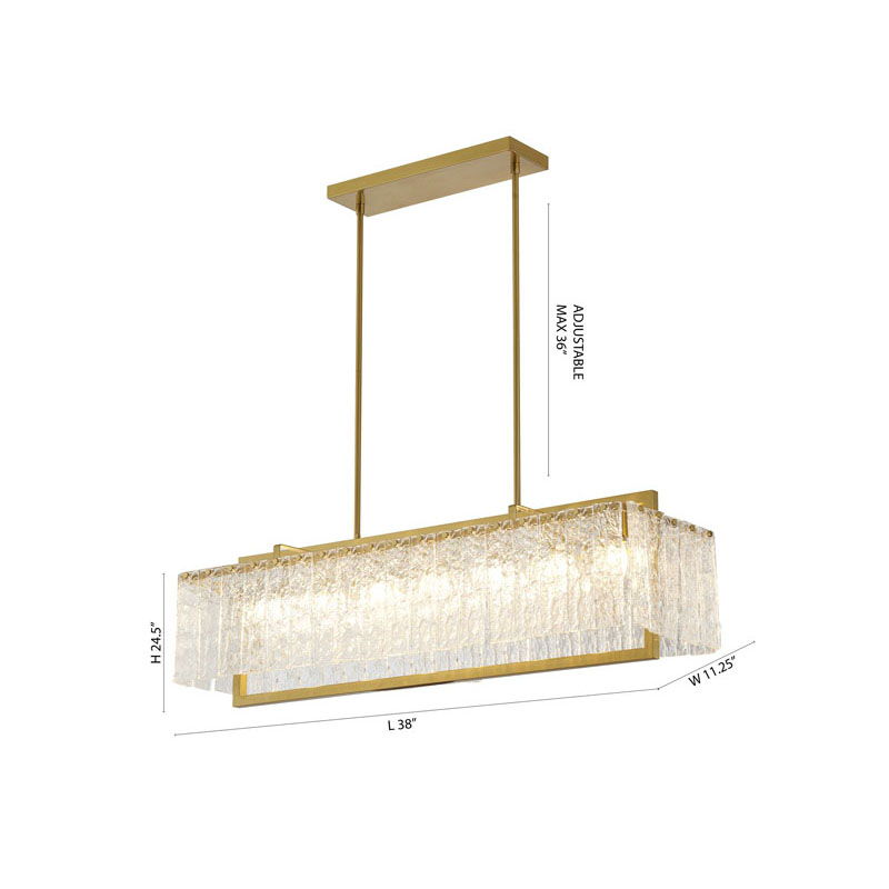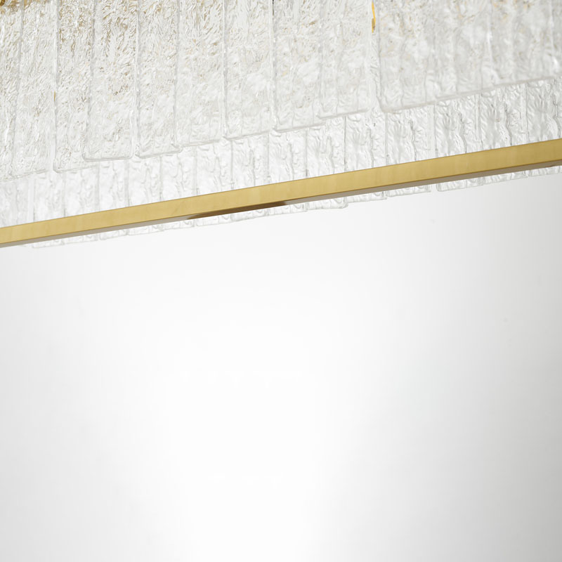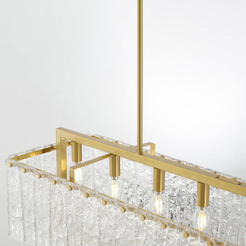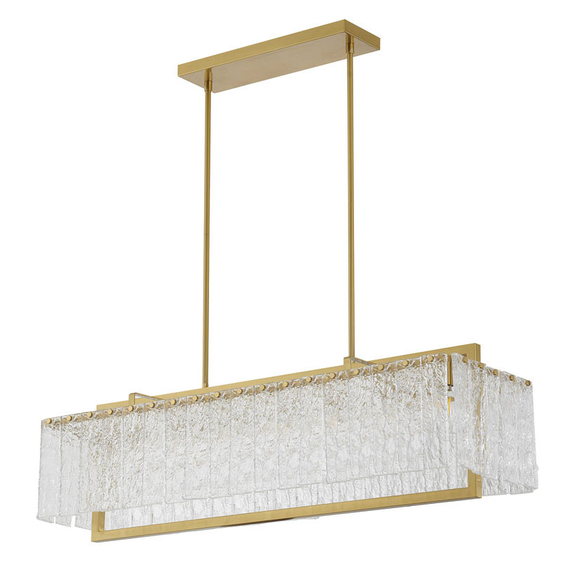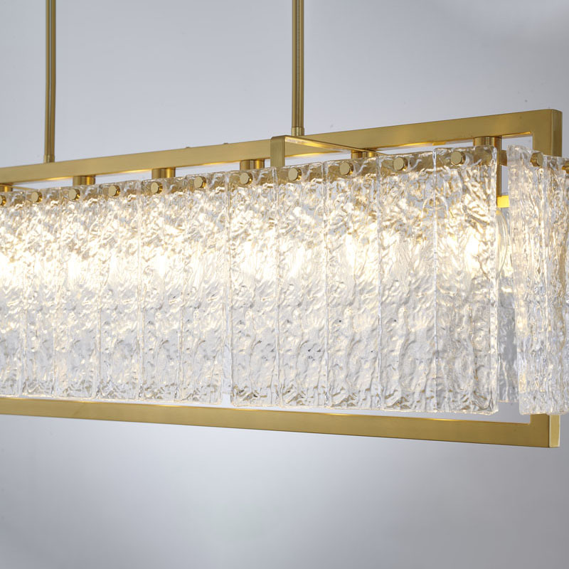 A RECTANGULAR BRASS FRAME CHANDELIER WITH HANGING CLEAR RIPPLED GLASS