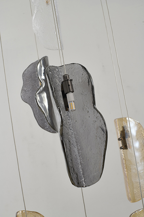 BLACK METAL FRAME CHANDELIER WITH CLEAR, SMOKE, AND AMBER GLASS PENDANTS