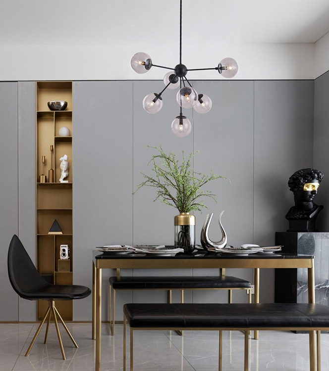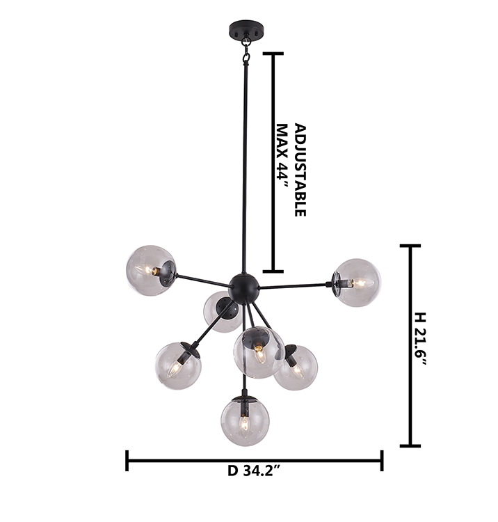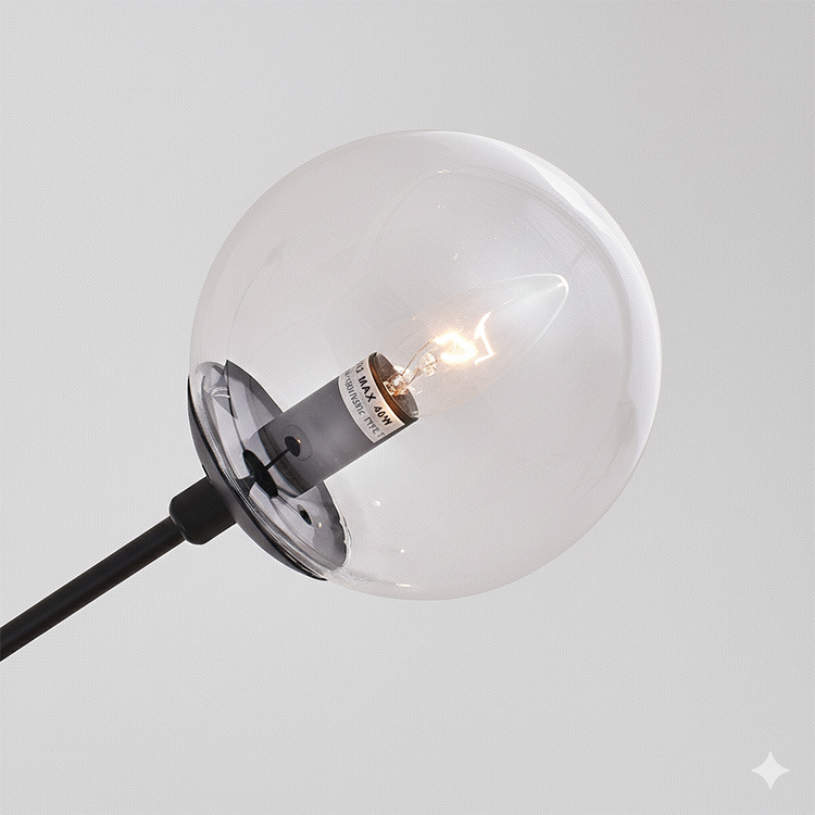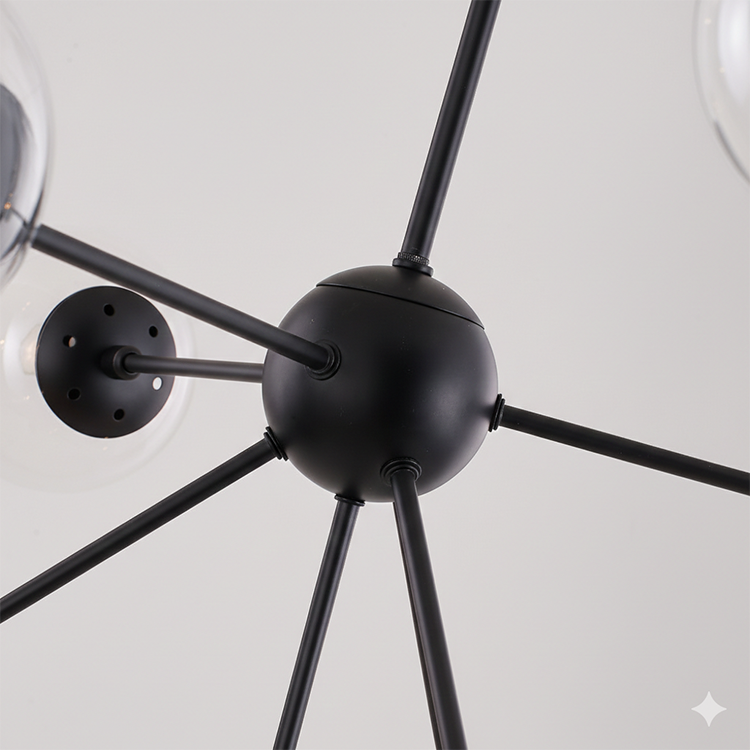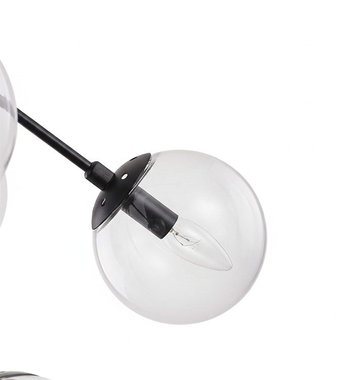 A BLACK METAL FRAME CEILING FIXTURE WITH CLEAR GLASS GLOBE SHADES