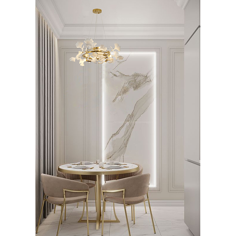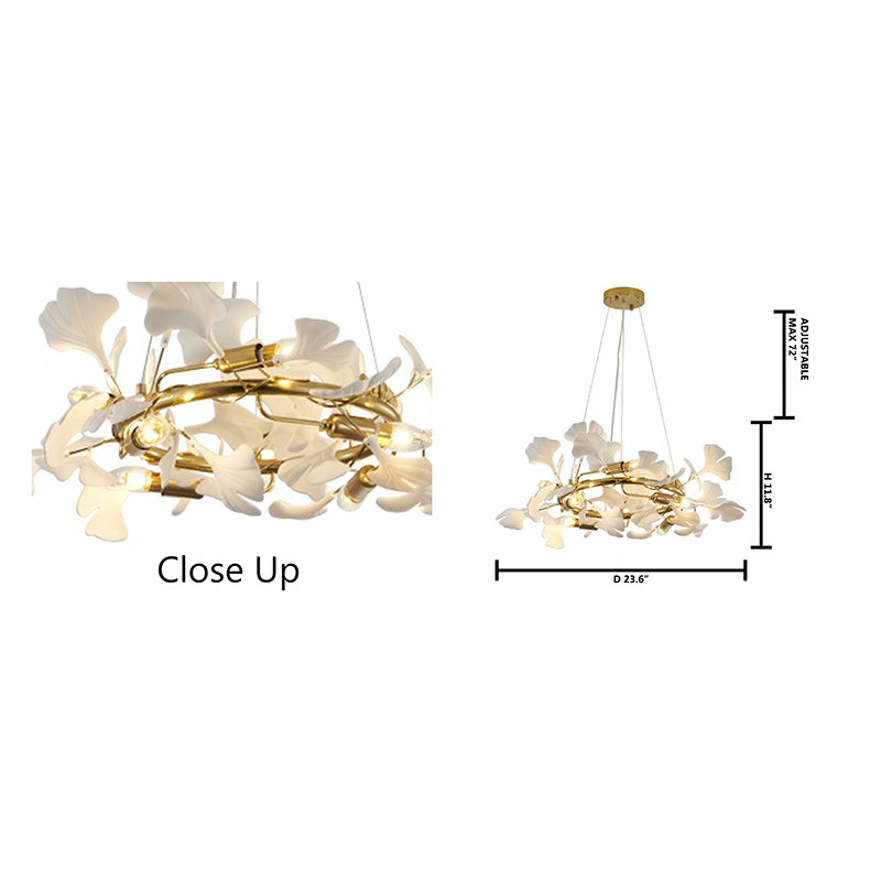 A ROUND BRASS FRAME CHANDELIER WITH WHITE ACRYLIC LEAF ACCENTS