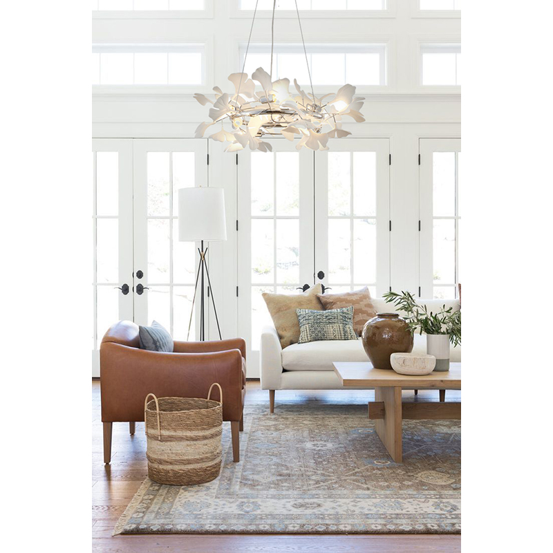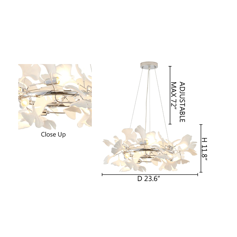 A ROUND CHROME FRAME CHANDELIER WITH WHITE ACRYLIC LEAF ACCENTS