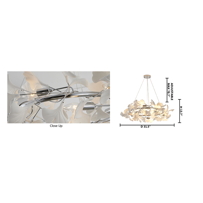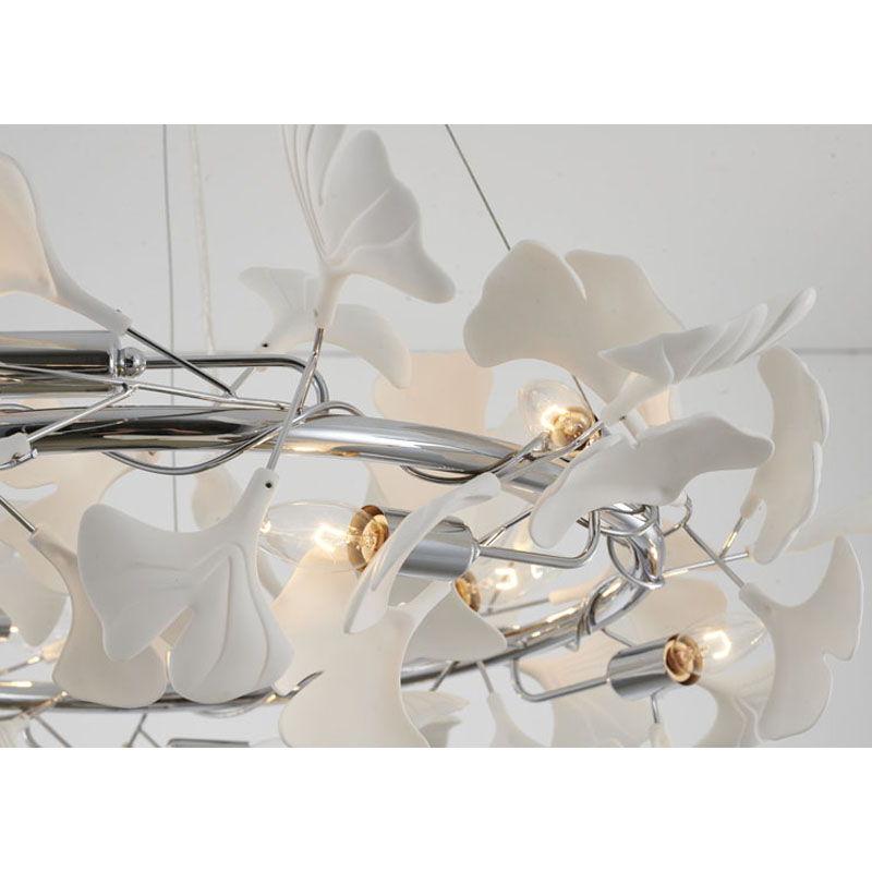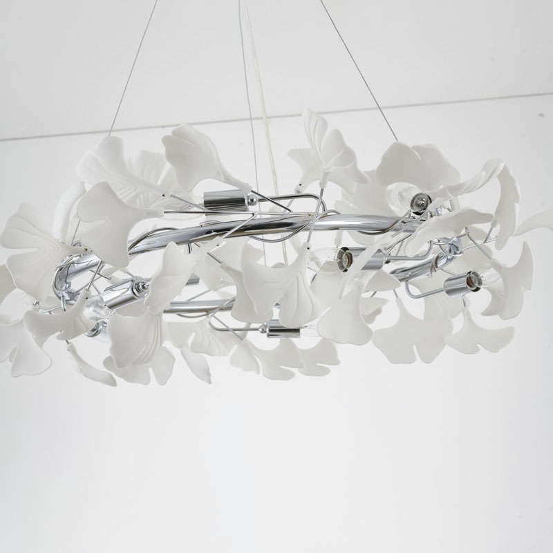 A ROUND CHROME FRAME CHANDELIER WITH WHITE ACRYLIC LEAF ACCENTS