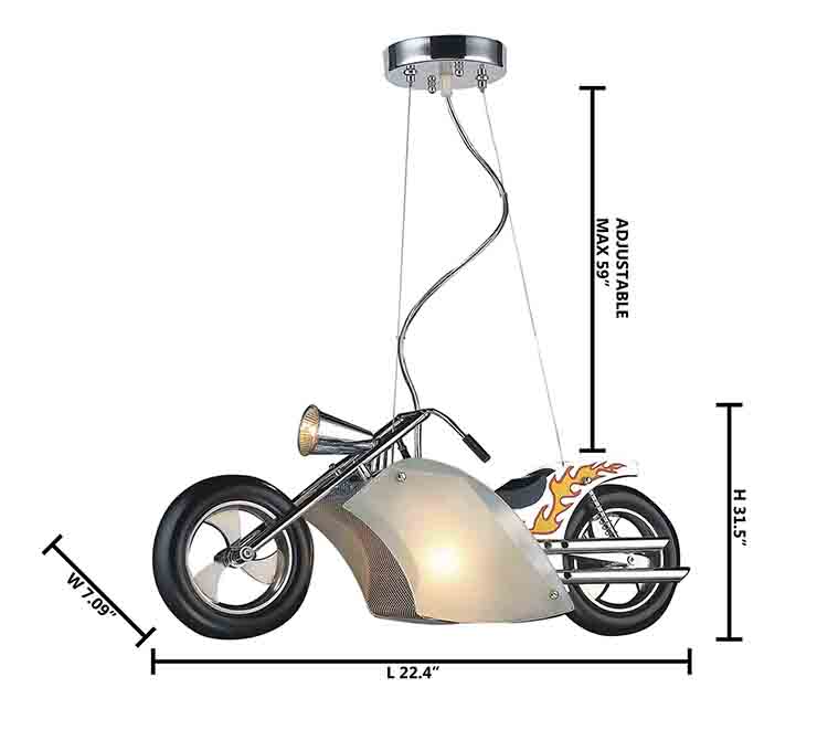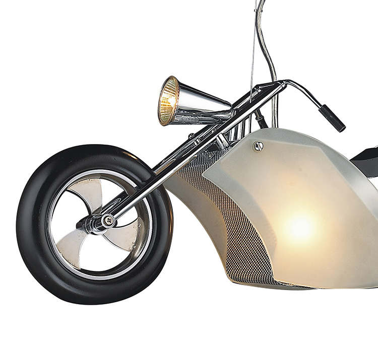 A MOTORCYCLE LIGHT FIXTURE WITH A FROSTED GLASS SHADE & CHROME HARDWARE