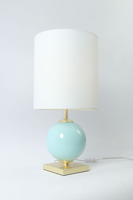 BRASS METAL TABLE LAMP WITH A WHITE LINEN SHADE AND A BLUE GLASS BODY
