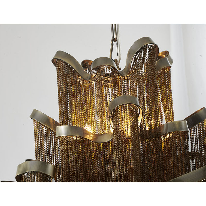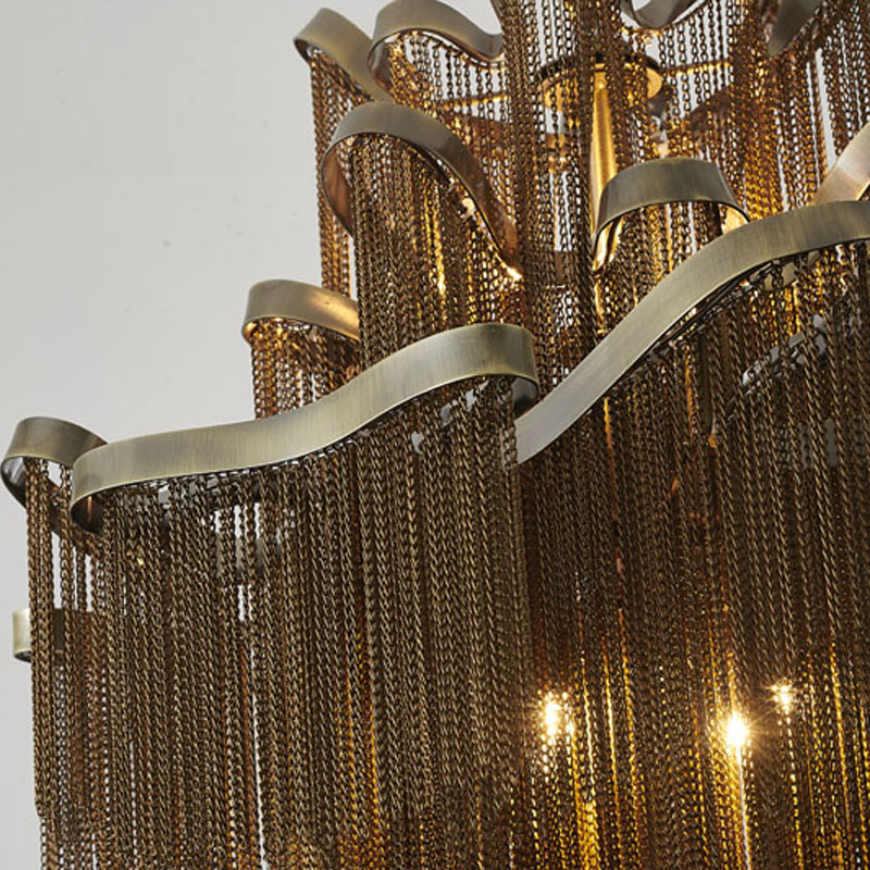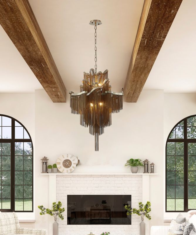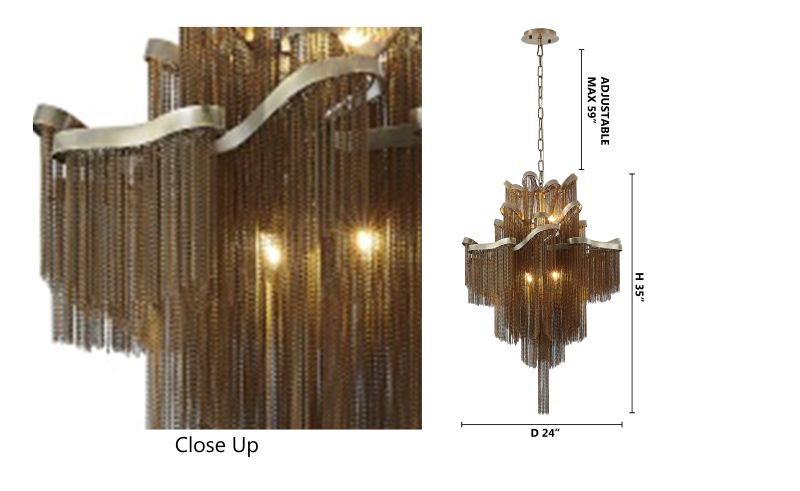 This transitional chandelier is a stunning and modern lighting fixture that adds a touch of sophistication and elegance to any room. Measuring 60 inches in length, 18 inches in width, and 31 inches in height, this lamp features a sleek and modern design with bronze aluminum chain that provides a unique and eye-catching look. The eight G9 sockets (Bulbs Not Included) can accommodate up to 60W of light, making it perfect for illuminating a large area. With its chrome finish and modern design, this lamp is a great choice for adding a touch of luxury and sophistication to a living room, foyer, dinning room, or entryway.