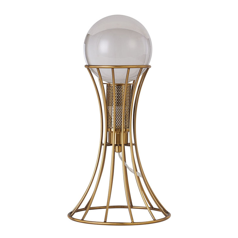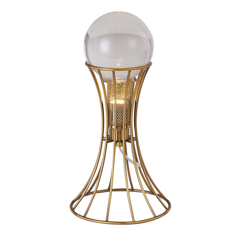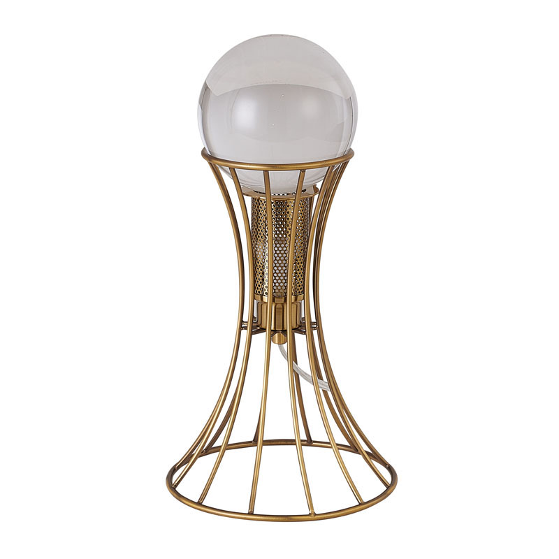 AN ANTIQUE BRASS METAL FRAME TABLE LAMP WITH A CLEAR CRYSTAL BALL